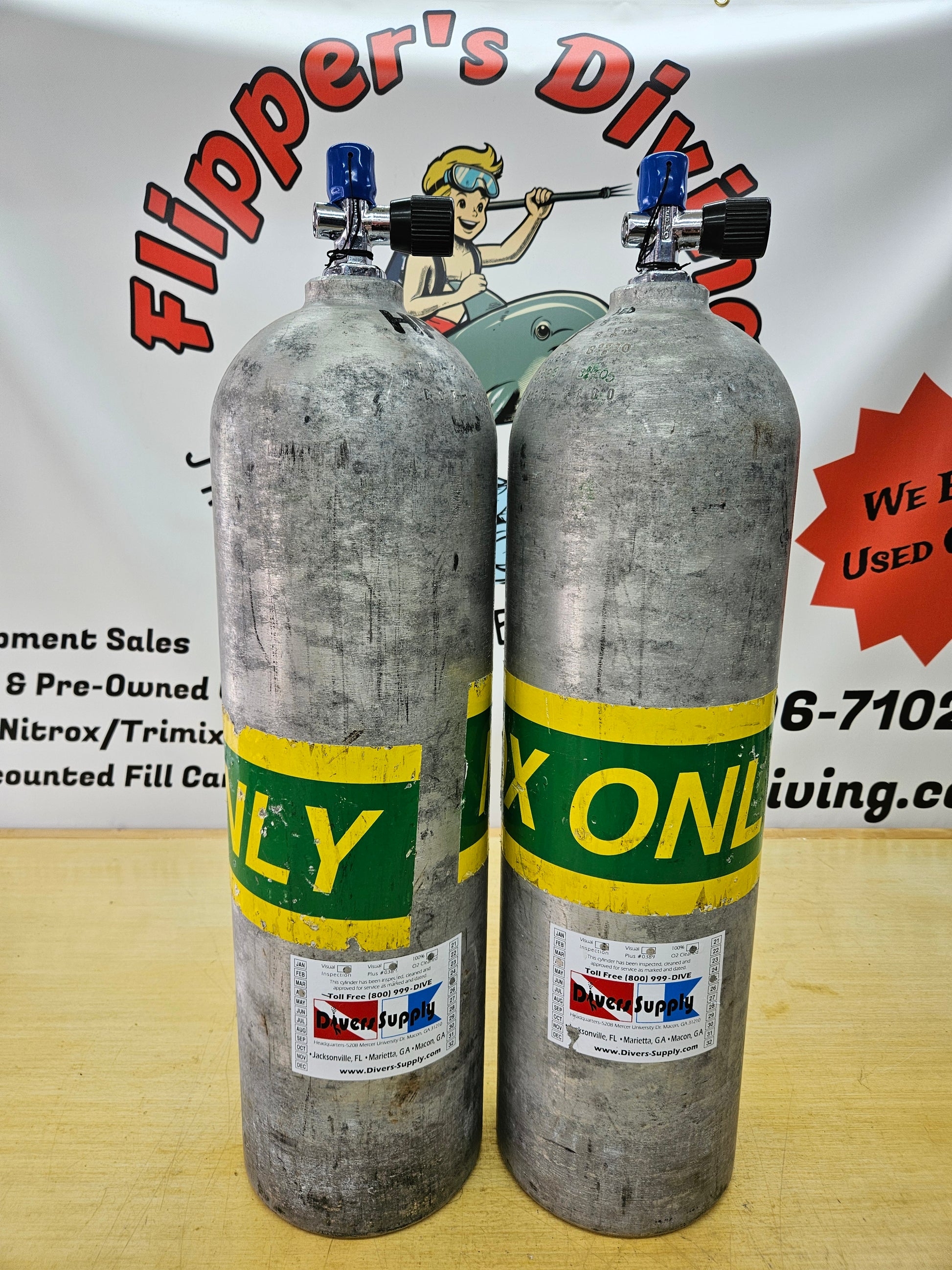 Aluminum 100 cubic ft. scuba cylinders. AL100 Both cylinders are a brushed finish (no paint), have thermo K valves compatible with yoke regulators and just had hydro/vip/02 cleaning and are ready to go! Free fill of air or 32% if picking up locally. Shipping available but they will ship empty/capped/valves removed.