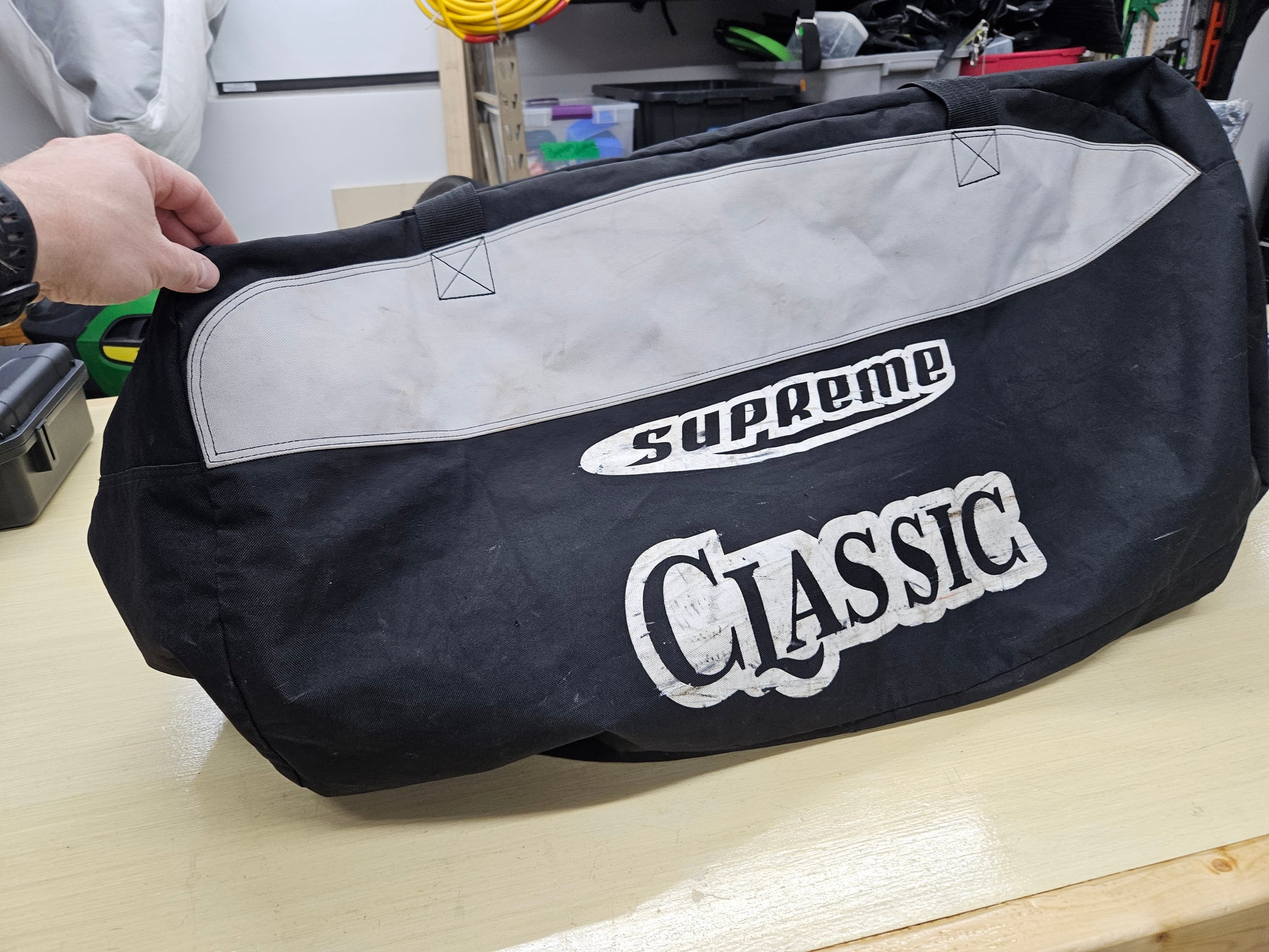 super huge! Bauer "Classic Supreme" Hockey equipment bag. I could literally get inside this bag... its HUGE! Normal wear/tear associated with airline travel, but all zippers are in good condition, no big rips or issues.