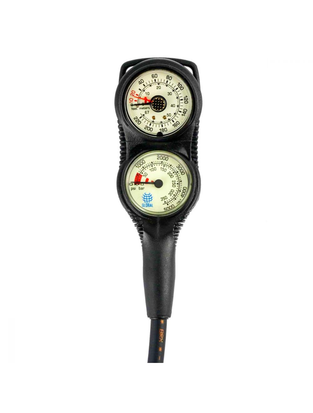 This Global instrument has imperial measurements on the outer dial and metric measurements on the inner dial. A Compact 2 gauge Global Console built small and compact for less drag and weight in a streamlined rubber shock-resistant boot. The display is crisp easy to read numbers for tank pressure and depth, 5000 (PSI) and 350 Bar for Tank pressure, and 220 feet and 67 meters for depth gauge with a built in maximum depth indicator.