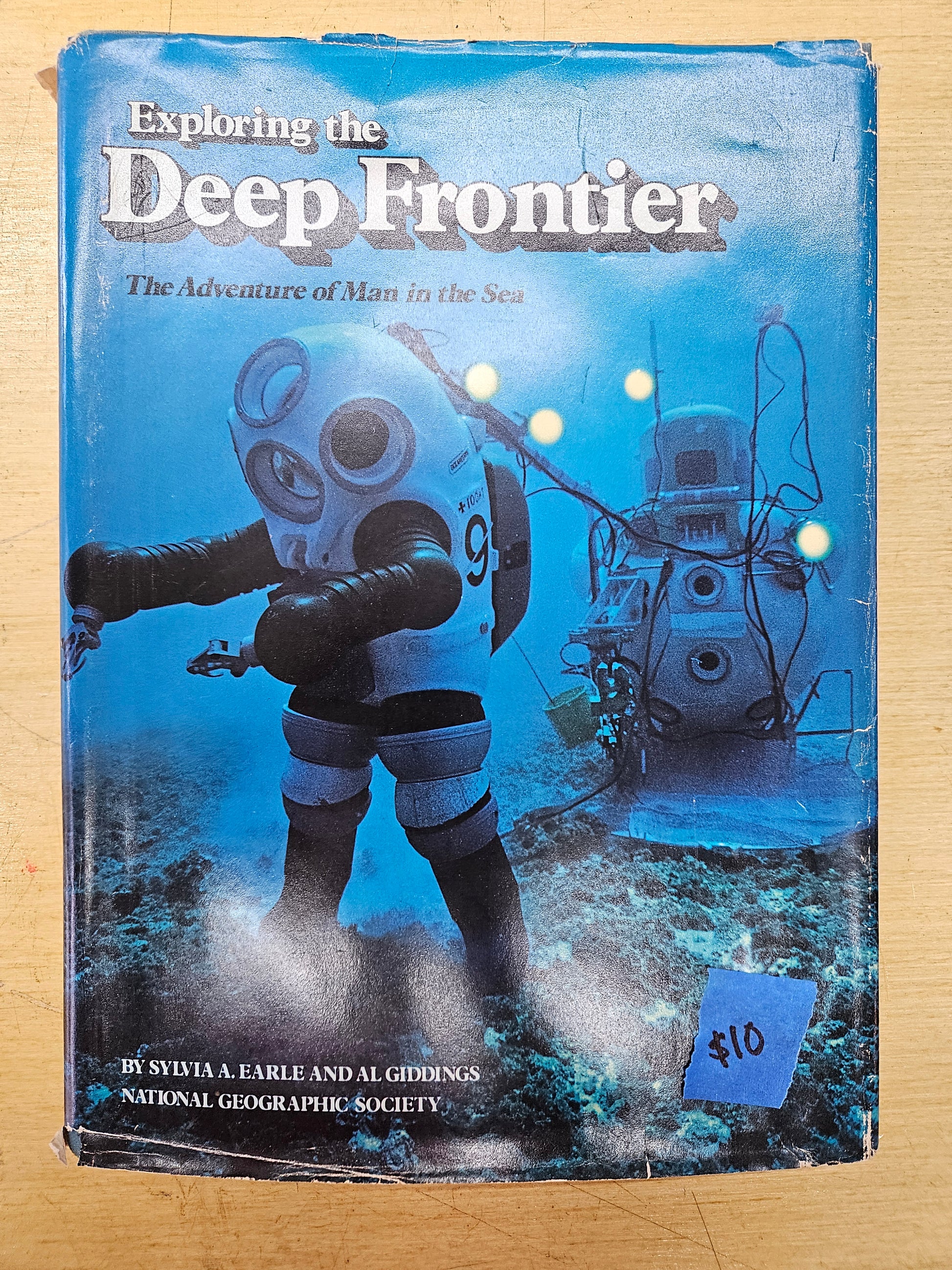 "Exploring the Deep Frontier: The Adventure of Man in the Sea" book by Sylvia A. Earle and Al Giddings of the National Geographic Society. Hardcover book, overall good condition, the dust cover/jacket is some damage as pictured, but otherwise good.