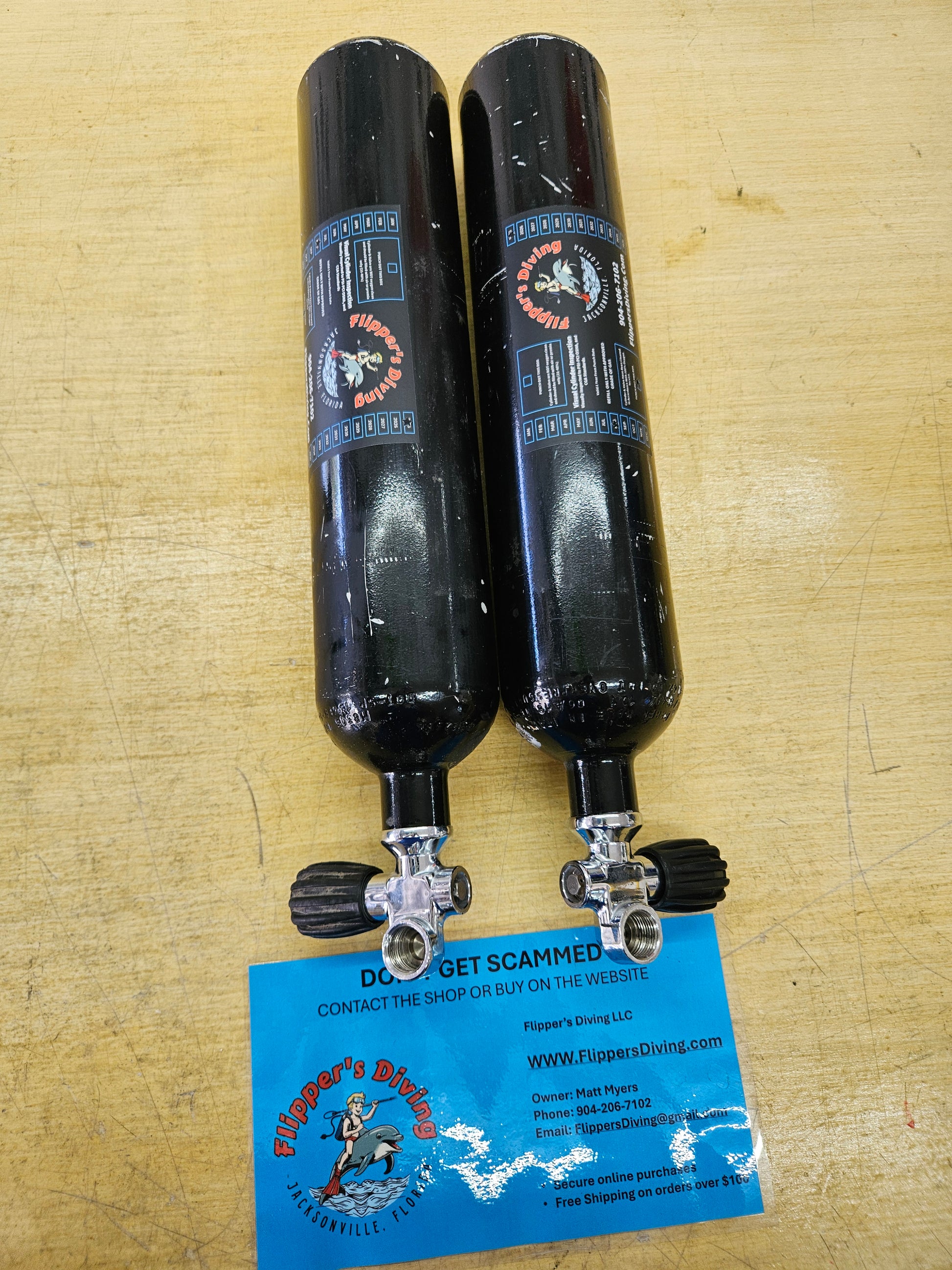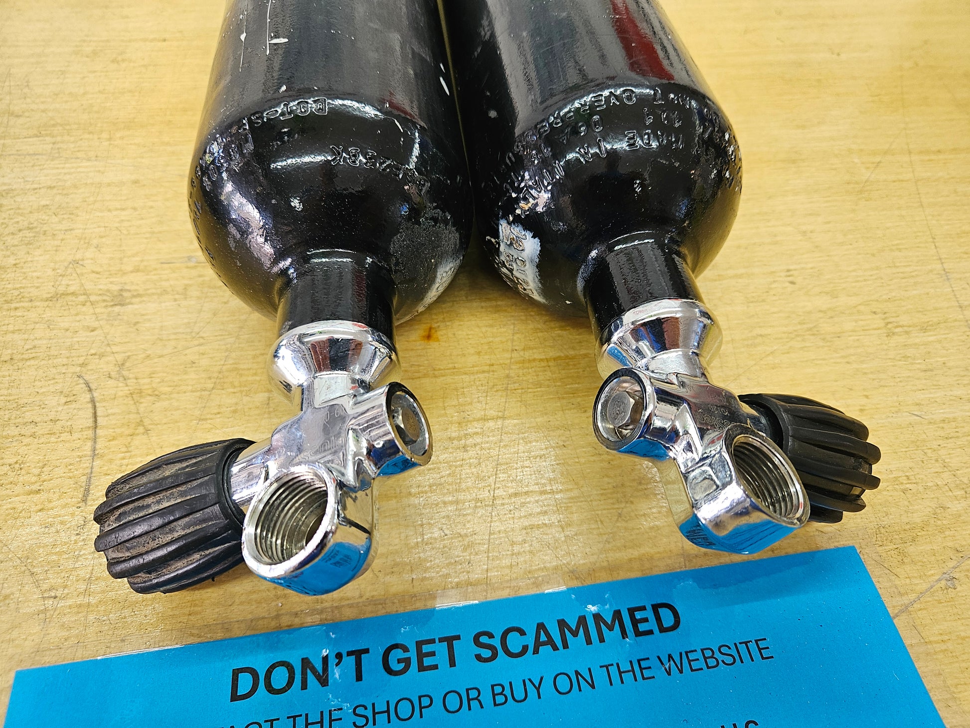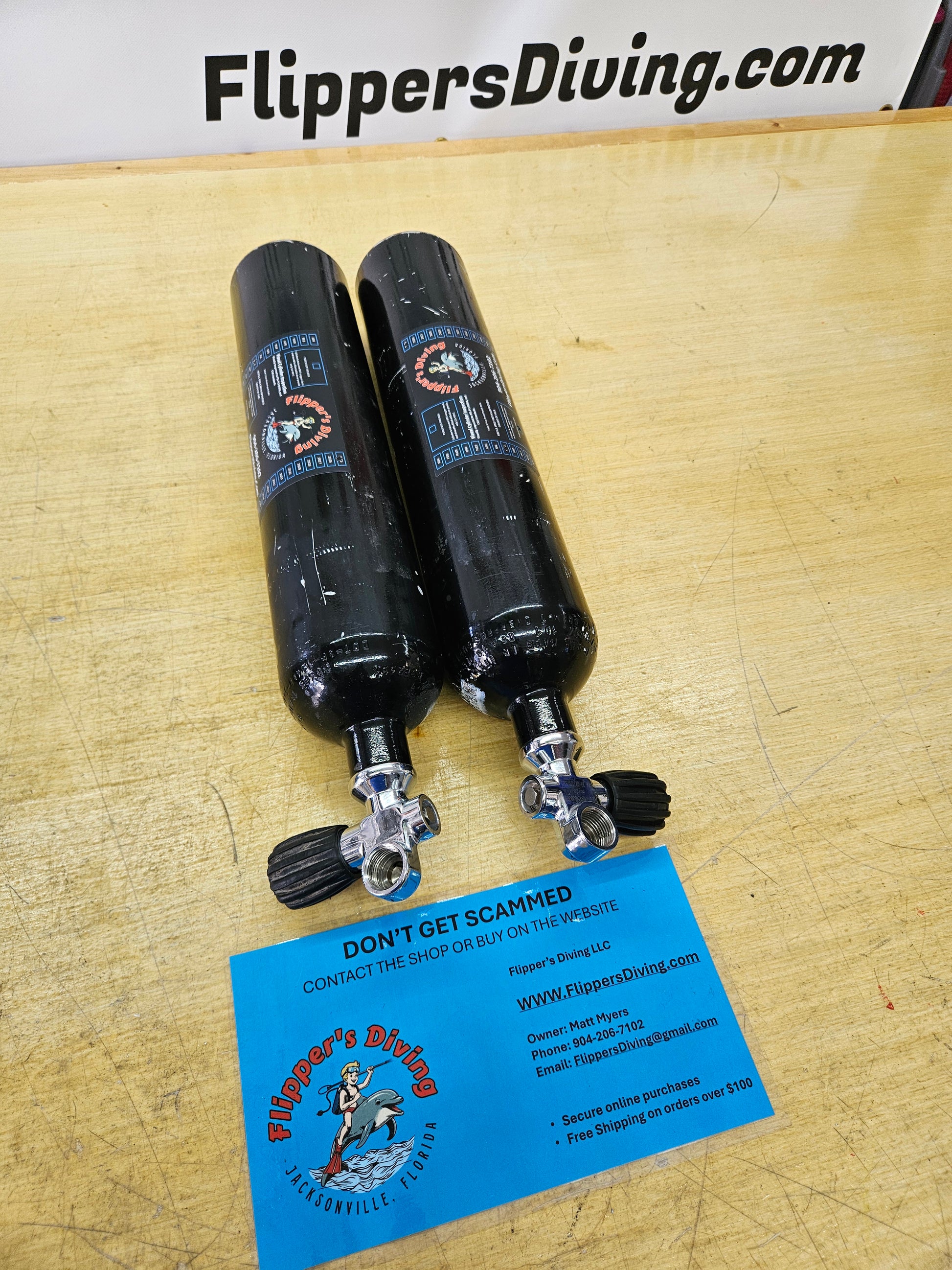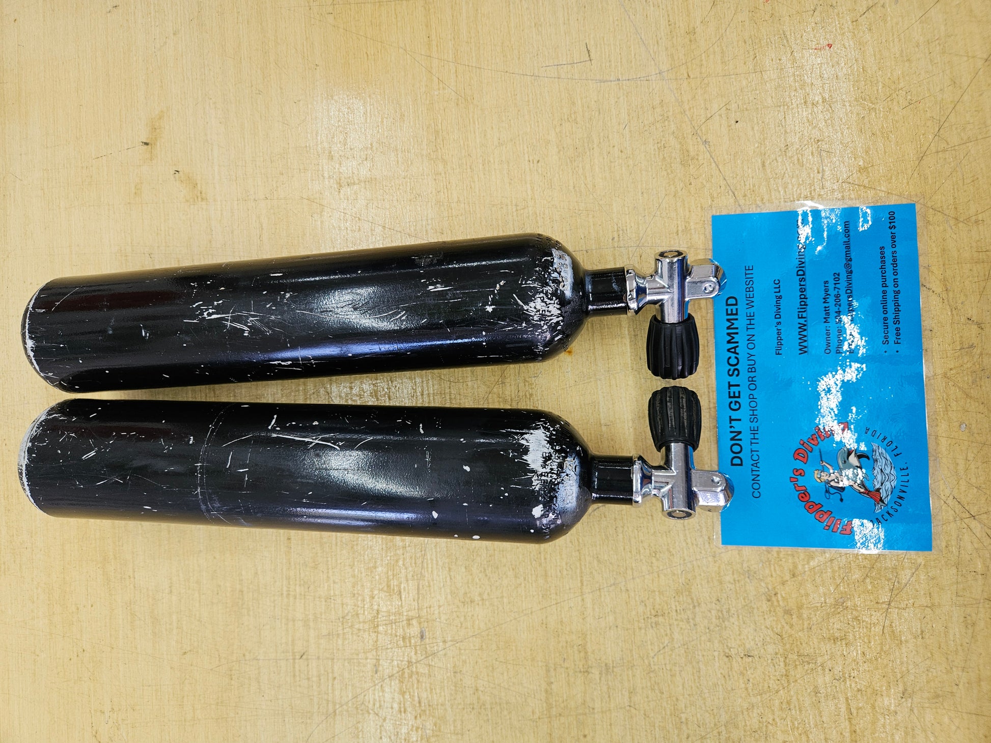 Faber FX23 steel 3 liter CCR cylinders, sold as a pair. Both cylinders were manufactured with first hydro test 06/2018 and most recent hydro is 12/2023. Both cylinders and valves just had VIP and 02 cleaning at Flipper's Diving LLC. 3442psi working pressure and appropriate valves, mirrored, by Blue Steel. If you're picking up, we'll throw in a free nitrox or air Dil bottle fill and a free 02 fill on the other bottle. Shipping the bottles, they will be drained, valves removed and capped.