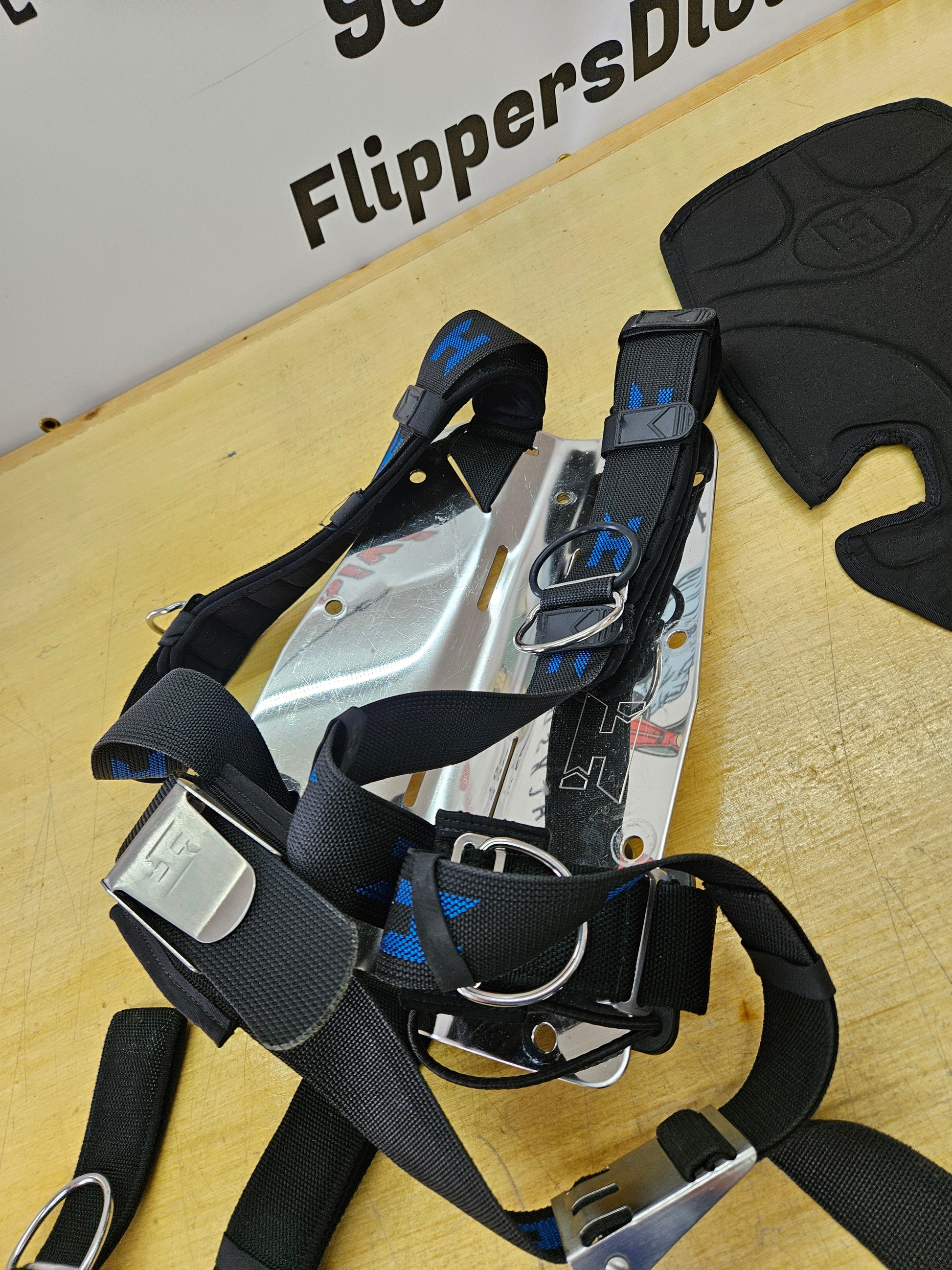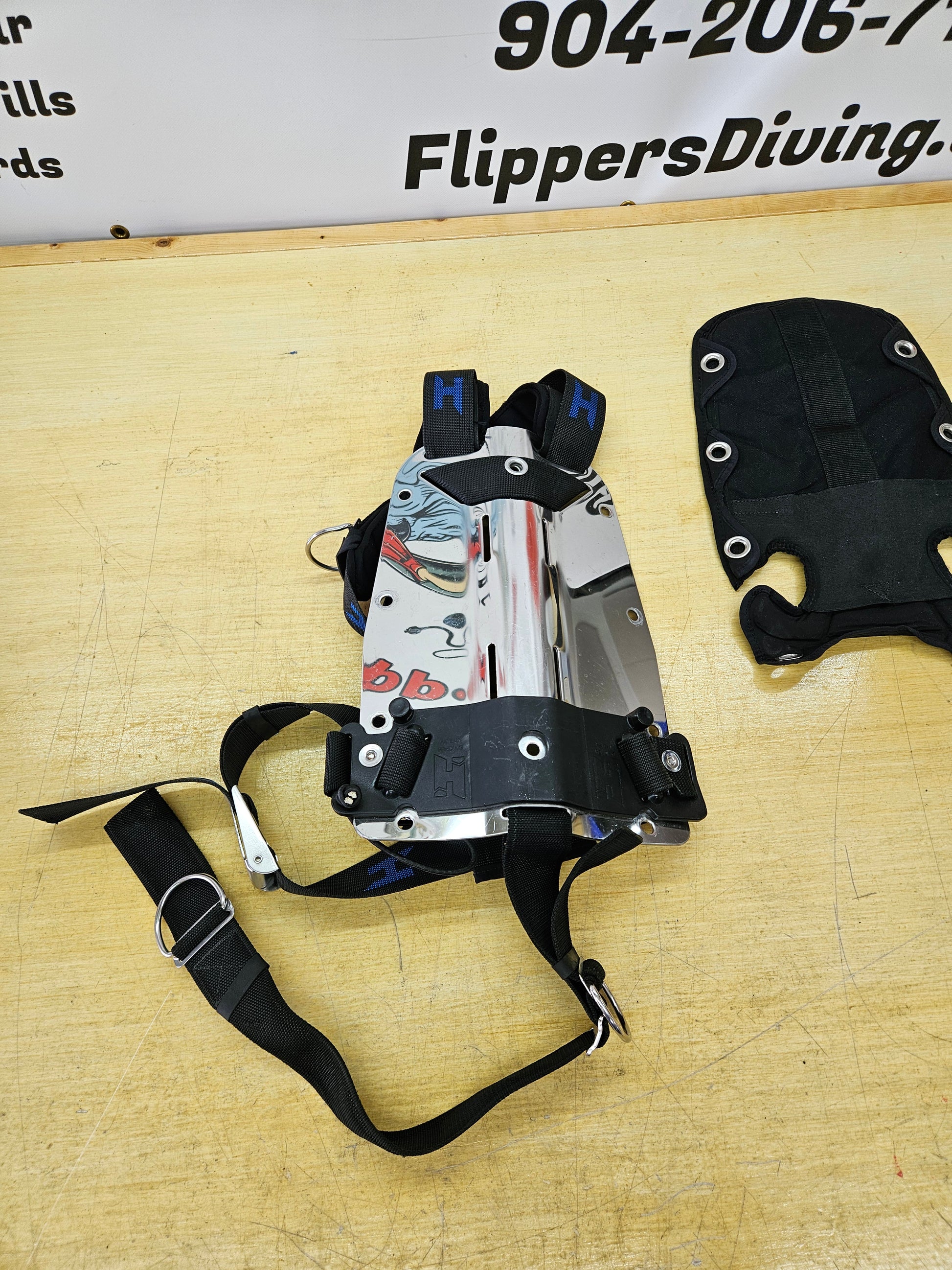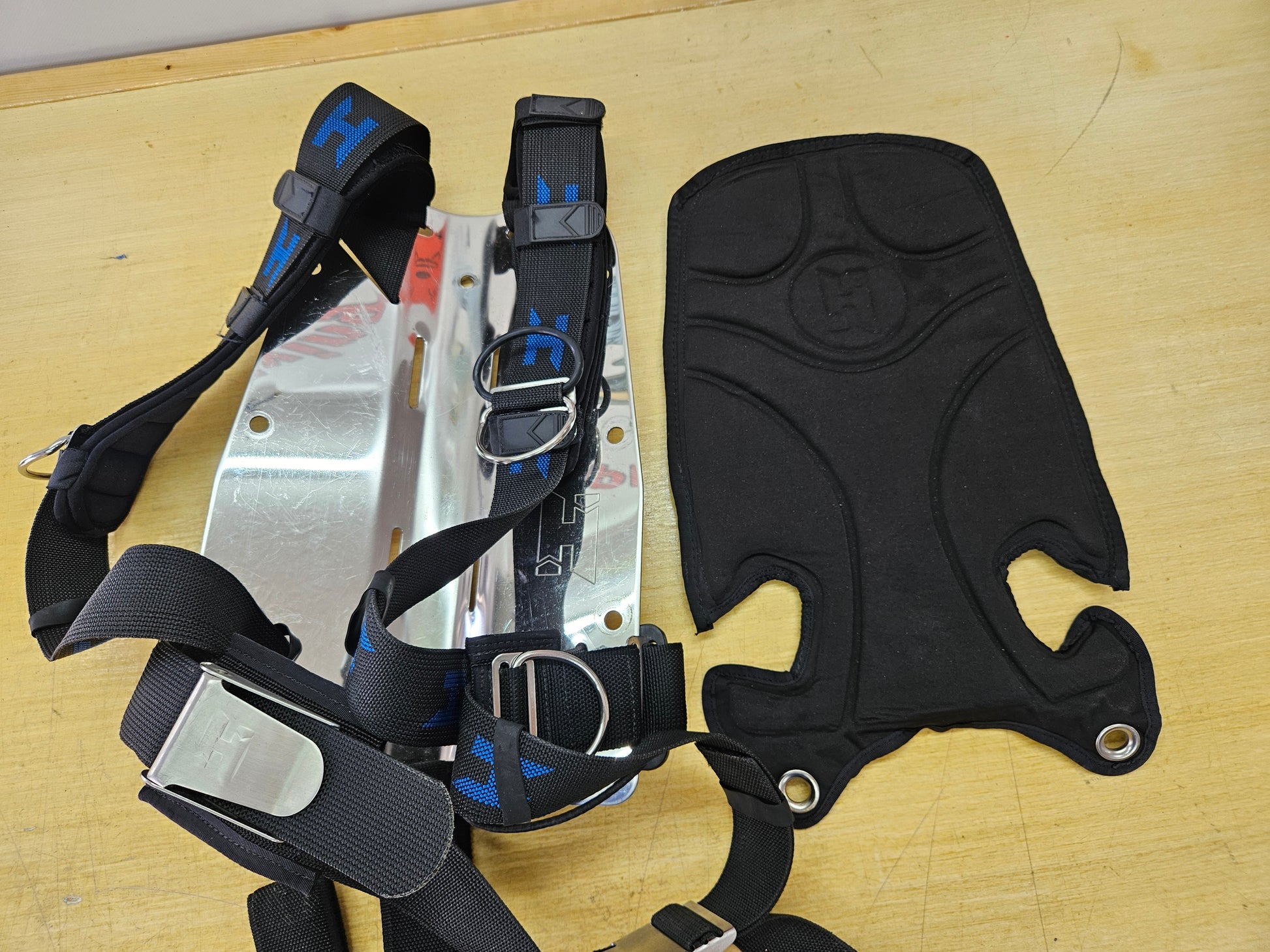 Halcyon stainless steel backplate and harness. Harness is the DIR style single piece harness with the cinch system and padded shoulders. Setup is in great shape with plenty of webbing to be trimmed down to your specific size. The padded pack pad is included however the book screws needed to attach the plate are not.