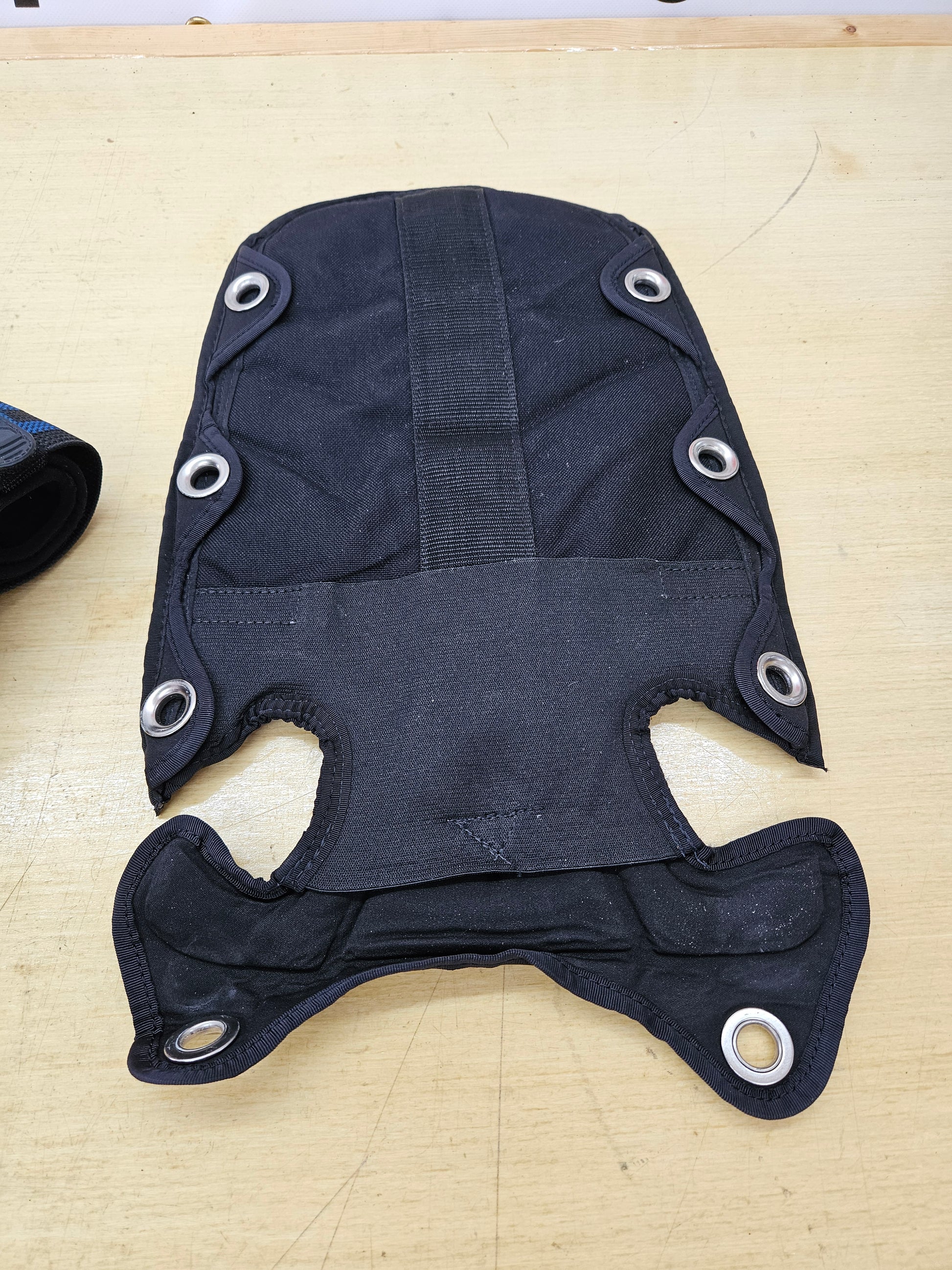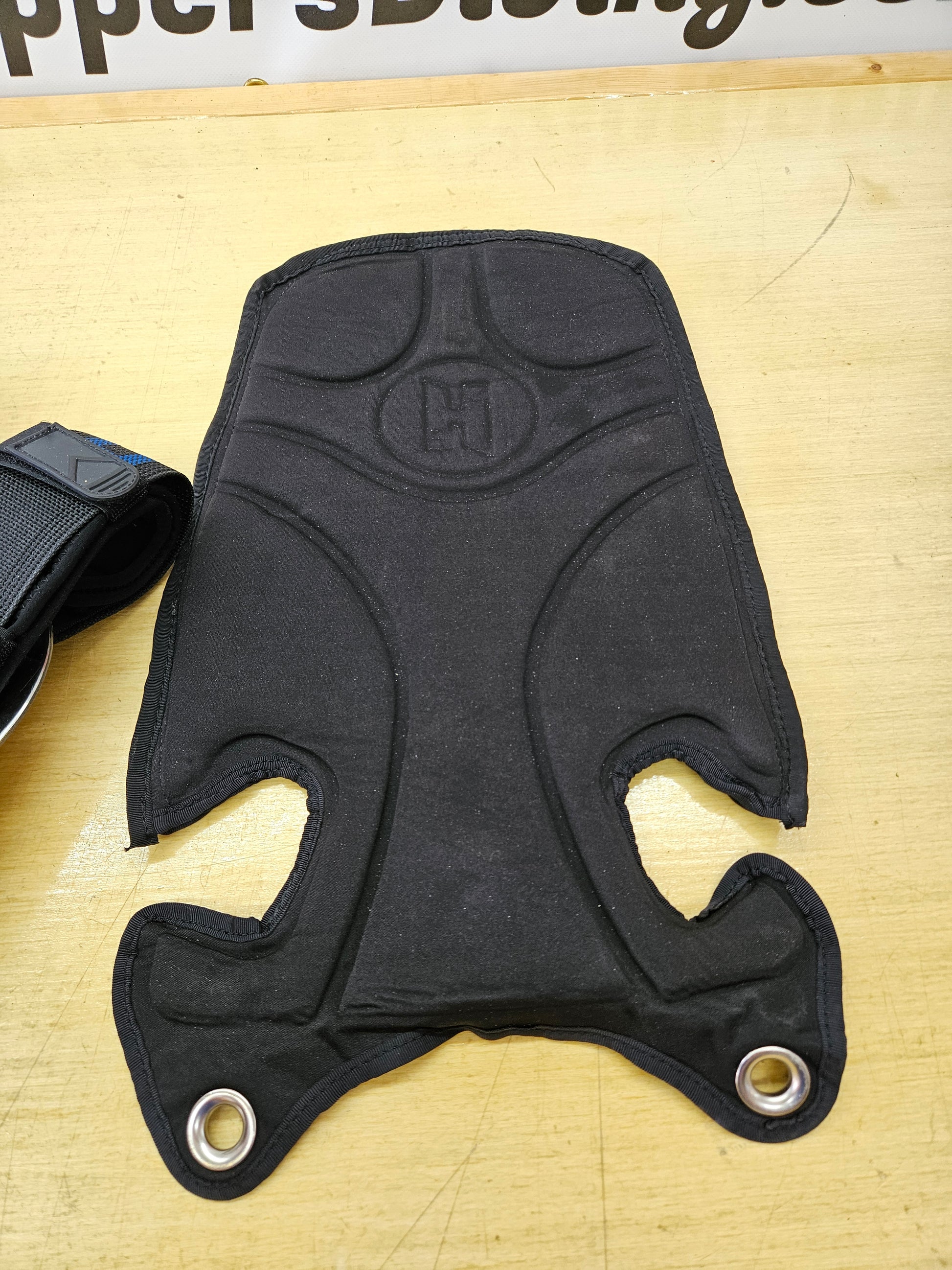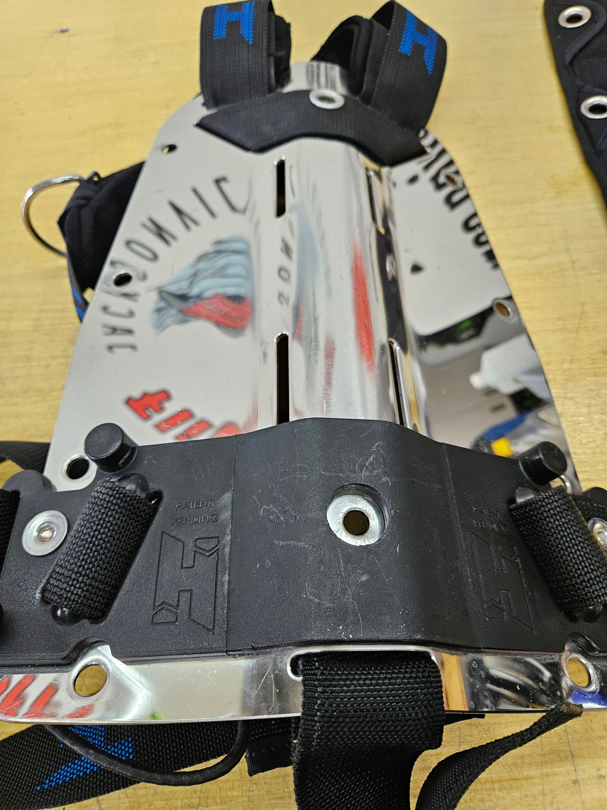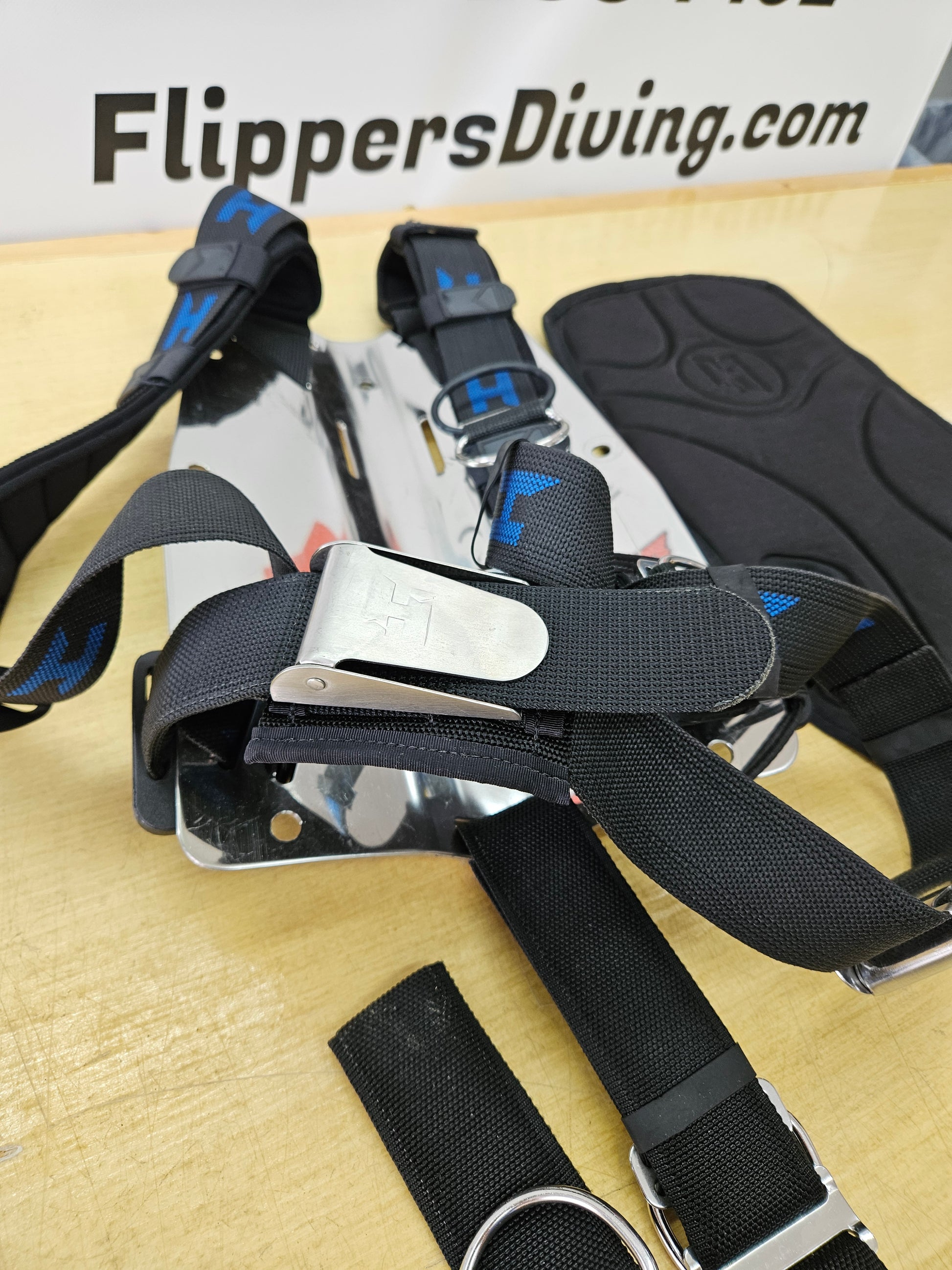 Halcyon stainless steel backplate and harness. Harness is the DIR style single piece harness with the cinch system and padded shoulders. Setup is in great shape with plenty of webbing to be trimmed down to your specific size. The padded pack pad is included however the book screws needed to attach the plate are not.