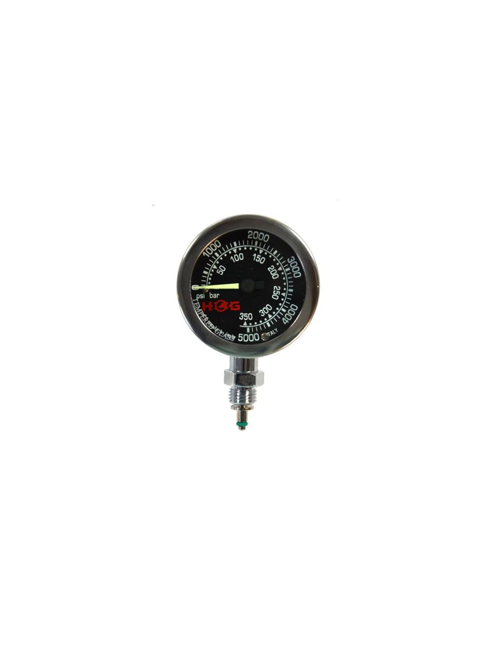 This Global SPG has an imperial measurements on the outer dial and a metric measurements on the inner dial. The Hog SPG is made with a plastic face that is ideal for Stage and Deco bottle use, lower weight and size allows for a more streamlined rigging in a rubber shock-resistant boot. The display is crisp easy to read numbers for tank pressure and depth, 5000 (PSI) and 350 Bar for Tank pressure.