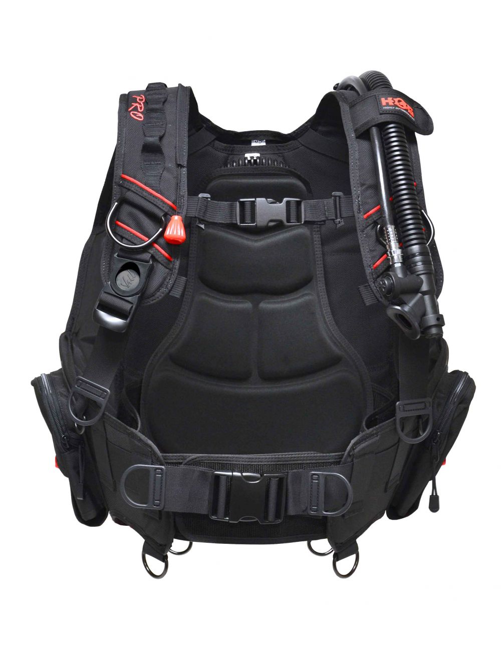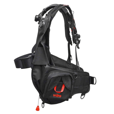 The harness offers a soft pad that cushions the back and lumbar regions and has a molded plastic handle for lifting the BC. Shoulder straps are mounted to a swiveling buckle, has 2 chest strap attachment points. Comes with 2 shoulder black coated stainless d-rings and a molle like attachment panel on the right shoulder. The cummerbund is adjustable with depth-compensating elastic for snug fit and comfort. The bottom of the Harness has 4 Black coated Stainless d-rings. The Hog Pro BC comes with a tank mounting plate with a durable cylinder cam buckle and strap for tank mounting and security and has 2 non-releasable trim weight pockets.
