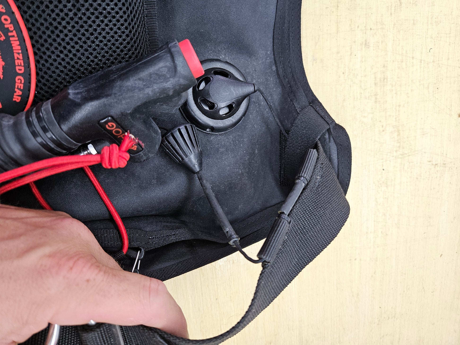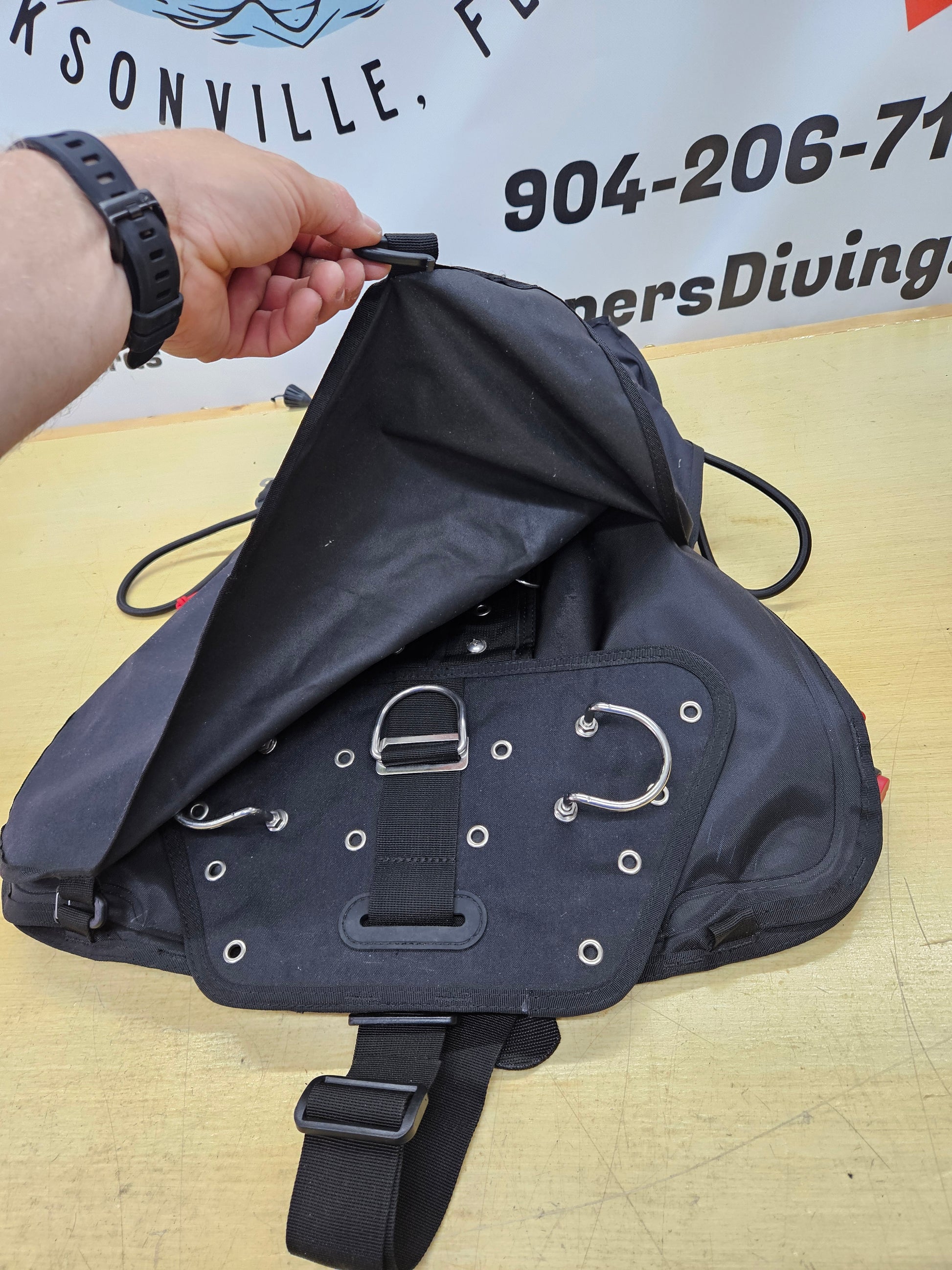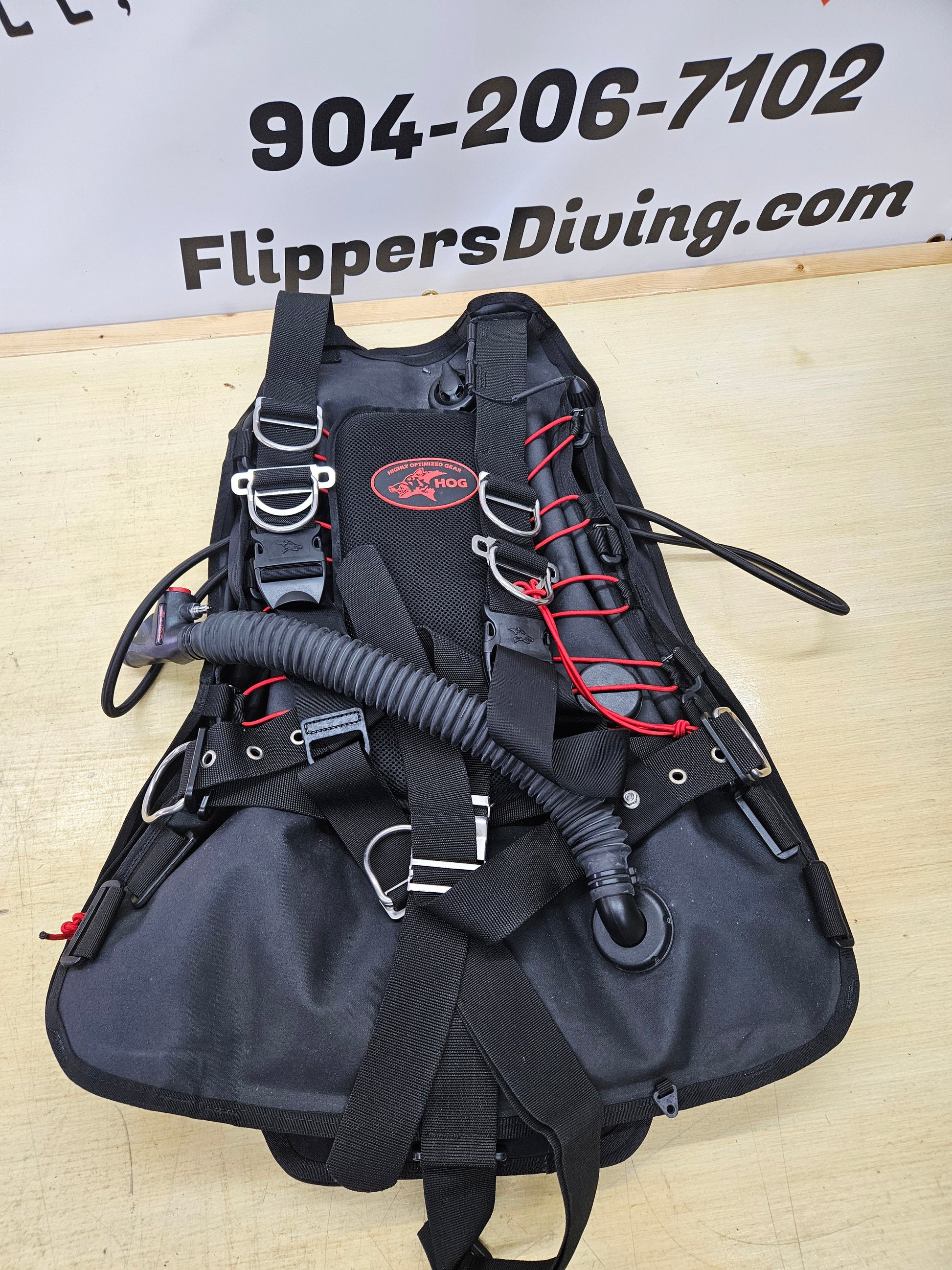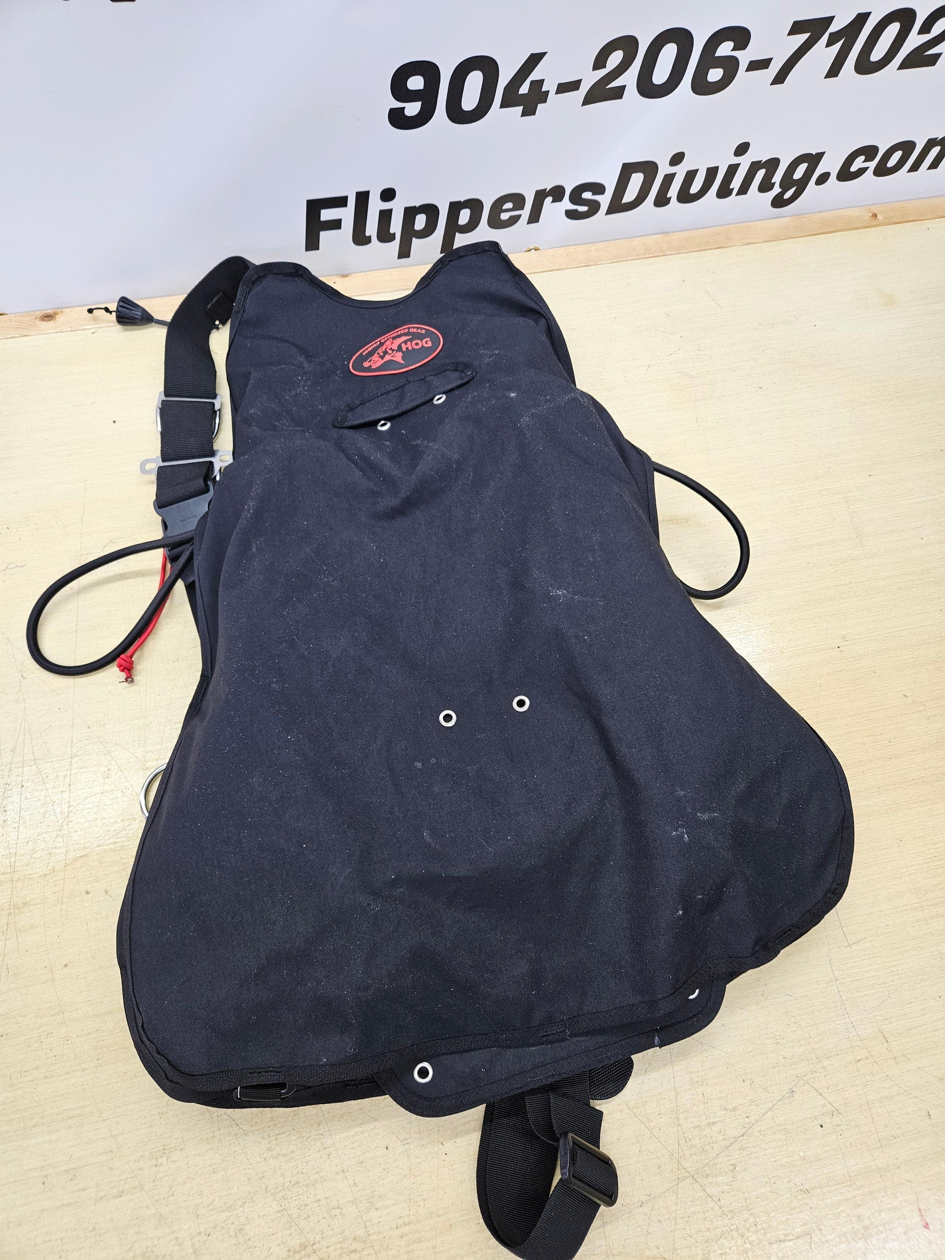 HOG Sidemount BCD. Full transparency... this BCD has not seen much use, but it appears as it's been sitting for quite awhile as some of the rubber bits have had some deterioration. If you're looking for something to mess with or a project BCD that you want to customize, this is it. If you're new to sidemount and want an out of the box ready to go rig, this is not it. Sold as is, no guarantees, no returns. Comes with added protective cover that shields the backside of the wing/bladder. One size fits most.