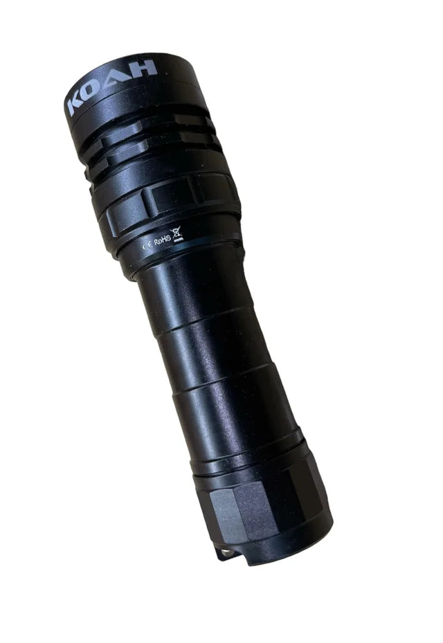 The Koah High Power Muzzle mounted flashlight is a must have for wreck and hole shooting. This well built light with aluminum housing has 3 power settings LOW - 300lu MED- 1000lu and HIGH 3000 lumens. Comes with rechargeable lithium ion battery, aluminum mounting base with screws, pilot hole drill bit and custom holder with buckle for holding the light.