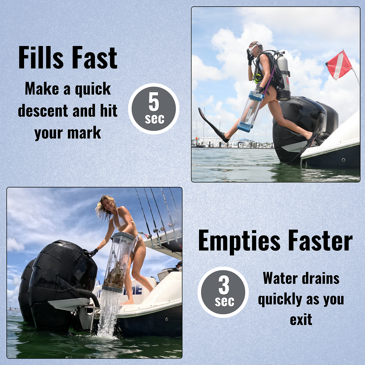 - Instant drainage when handing onto a boat or dock (3 seconds)