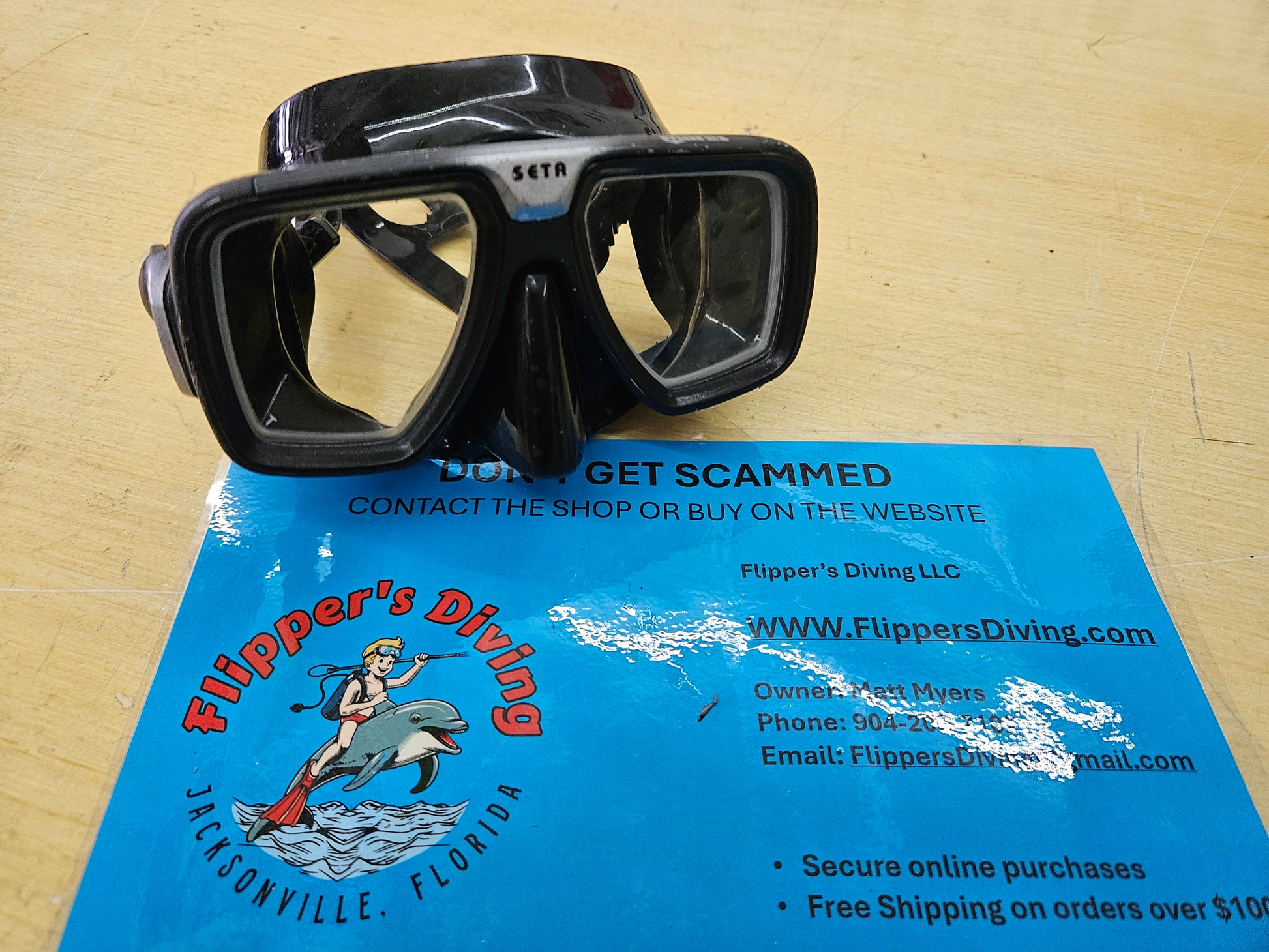 Used Mares "Tech Black Seta" Mask w/RX... sorry we don't know what the prescription or magnification level is.