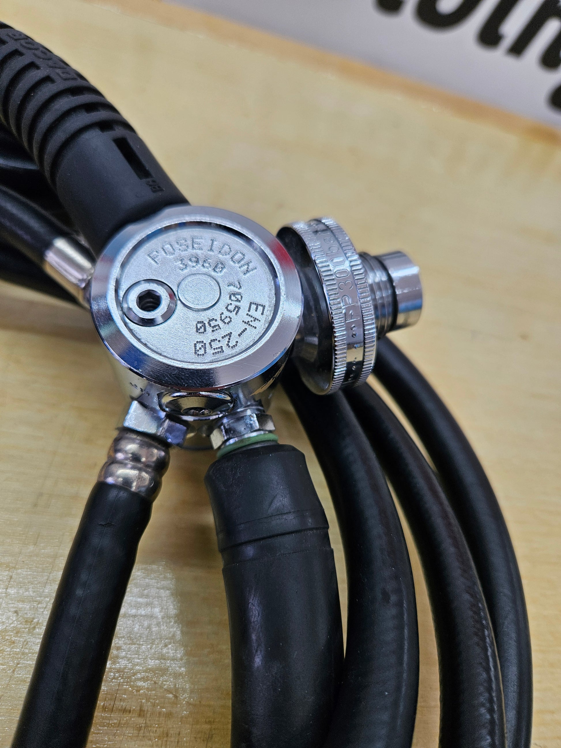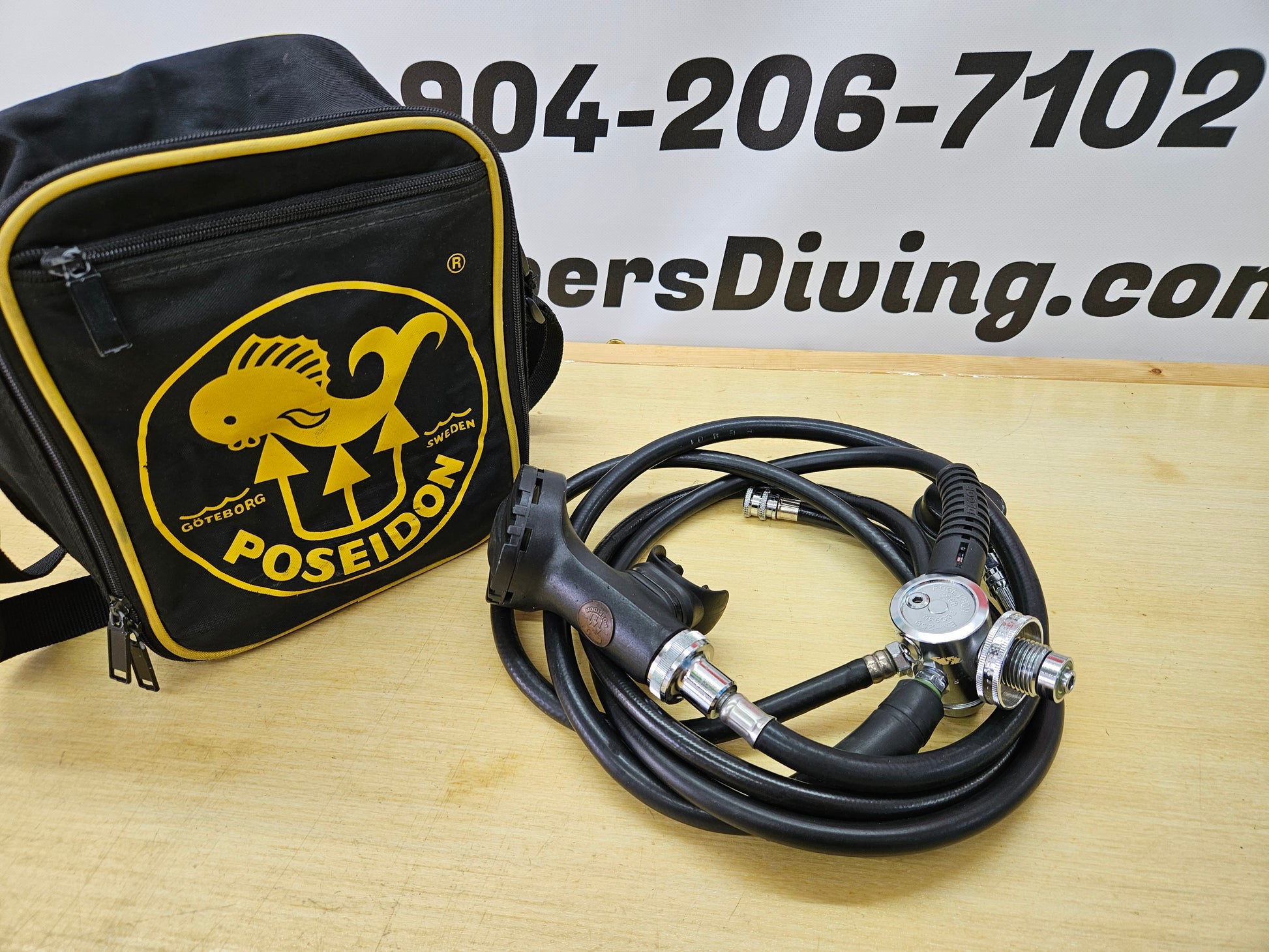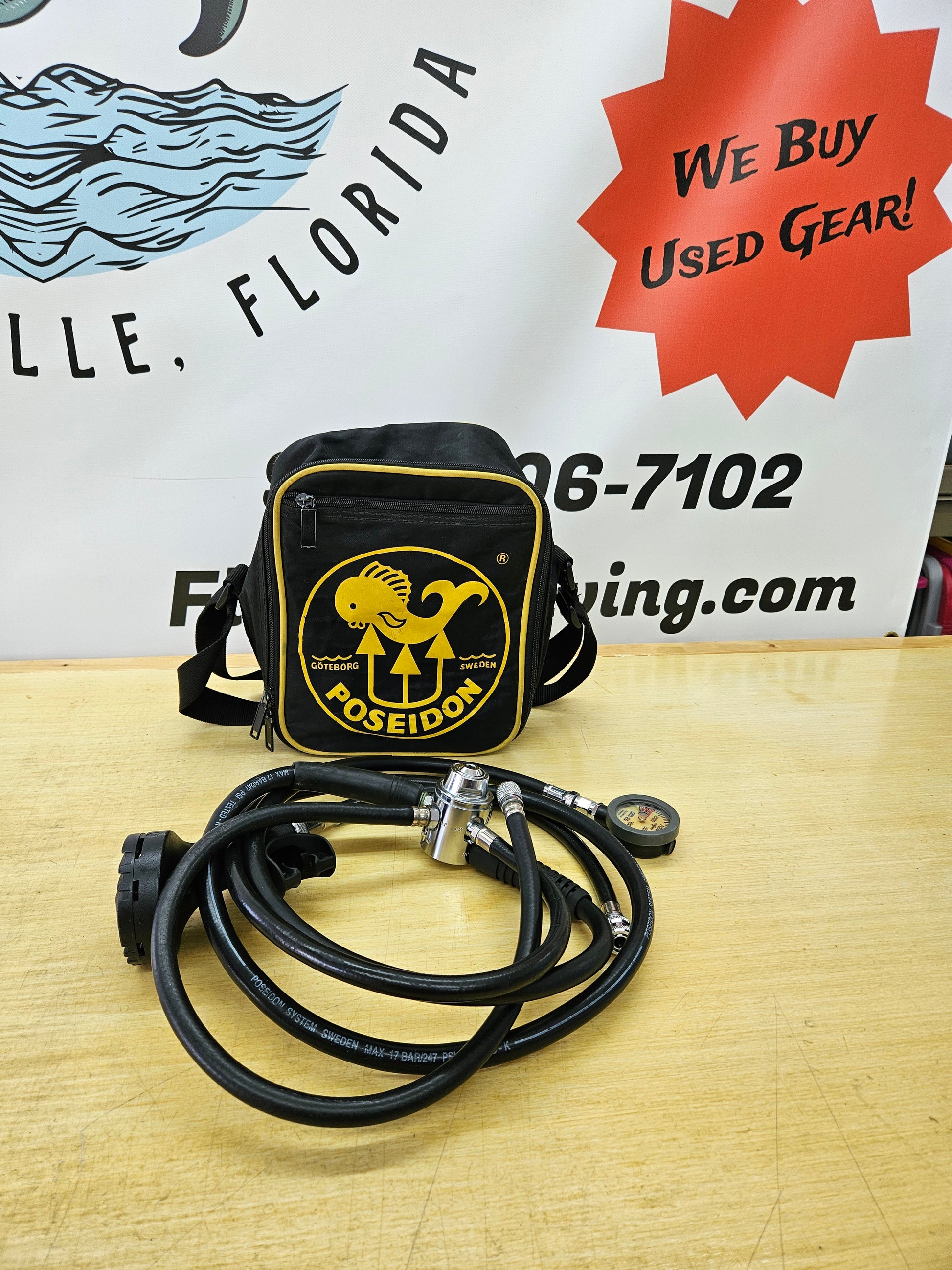Poseidon regulator set. Super clean and appears to have had minimal use. Comes with DIN first stage, primary 2nd stage, suunto SPG and inflator hose. We do not specialize in Poseidon regulators and therefore will not be tuning this regulator, however IP is at 129 and solid, unit breathes great and upon inspection there are no concerns with corrosion, hoses, mouth pieces, etc. Poseidon regulators are a special breed and should only be worked on by those who are specifically trained to service them. Comes with original manual and bag. Sold as is, no guarantee or returns.