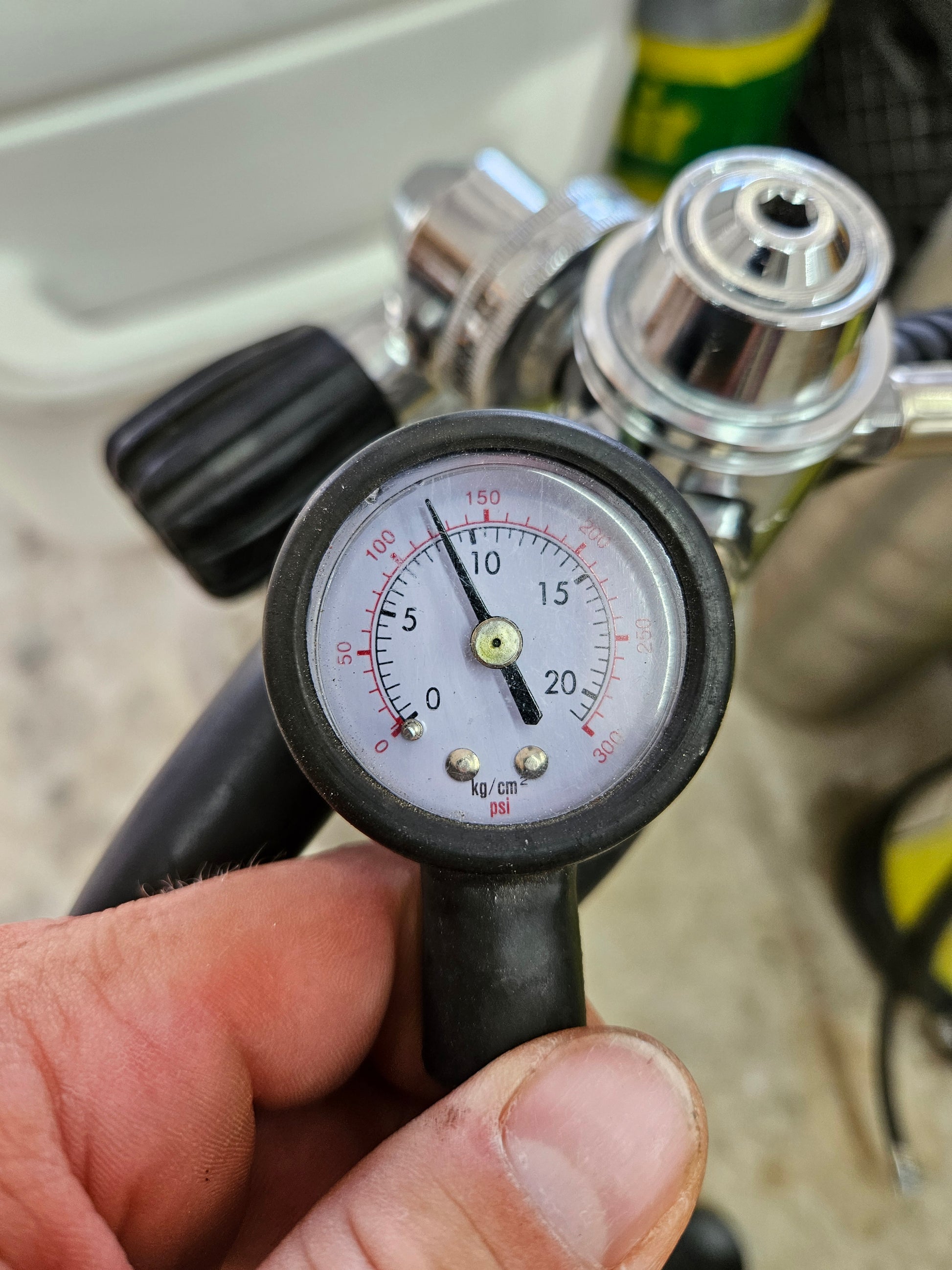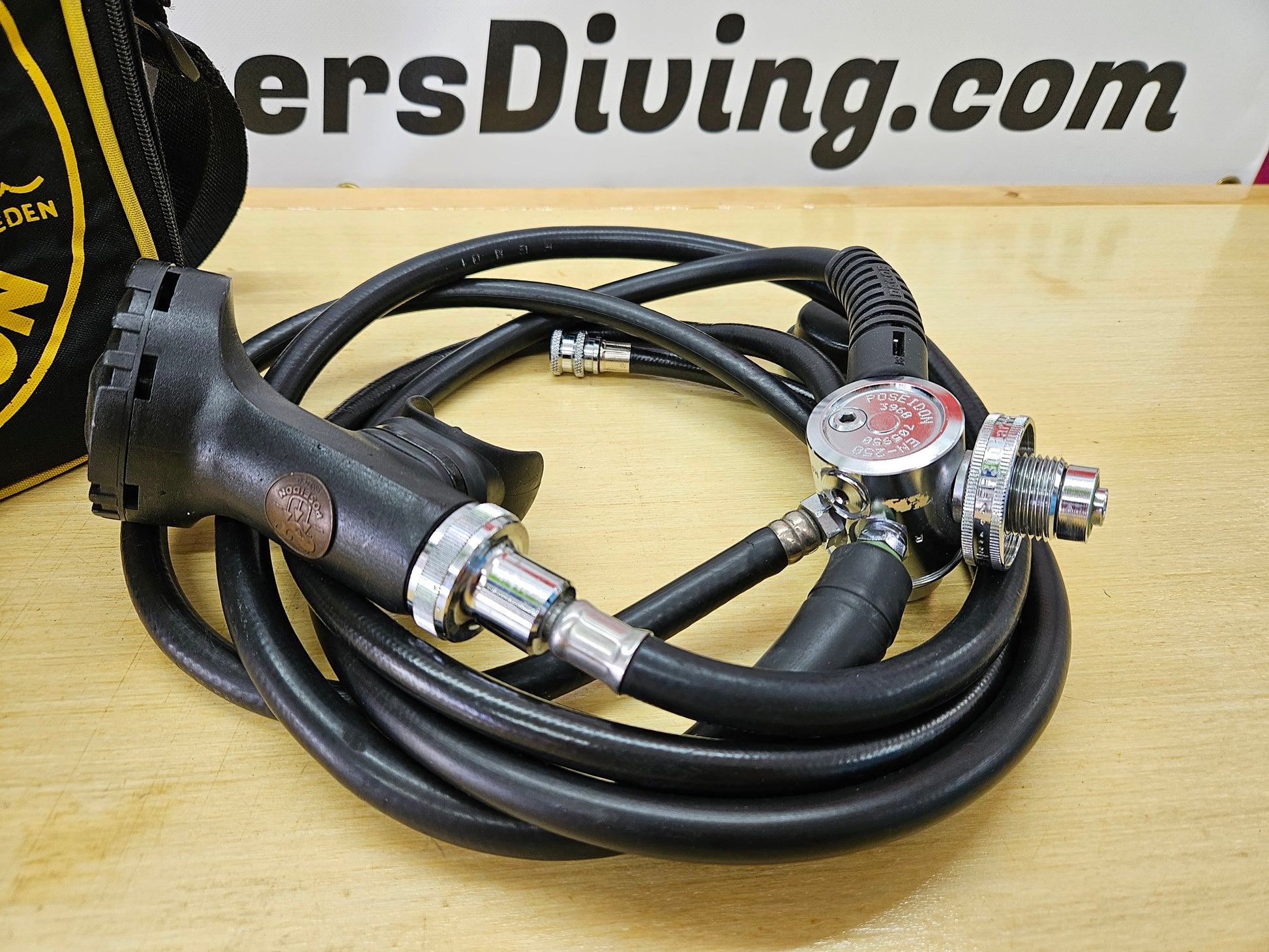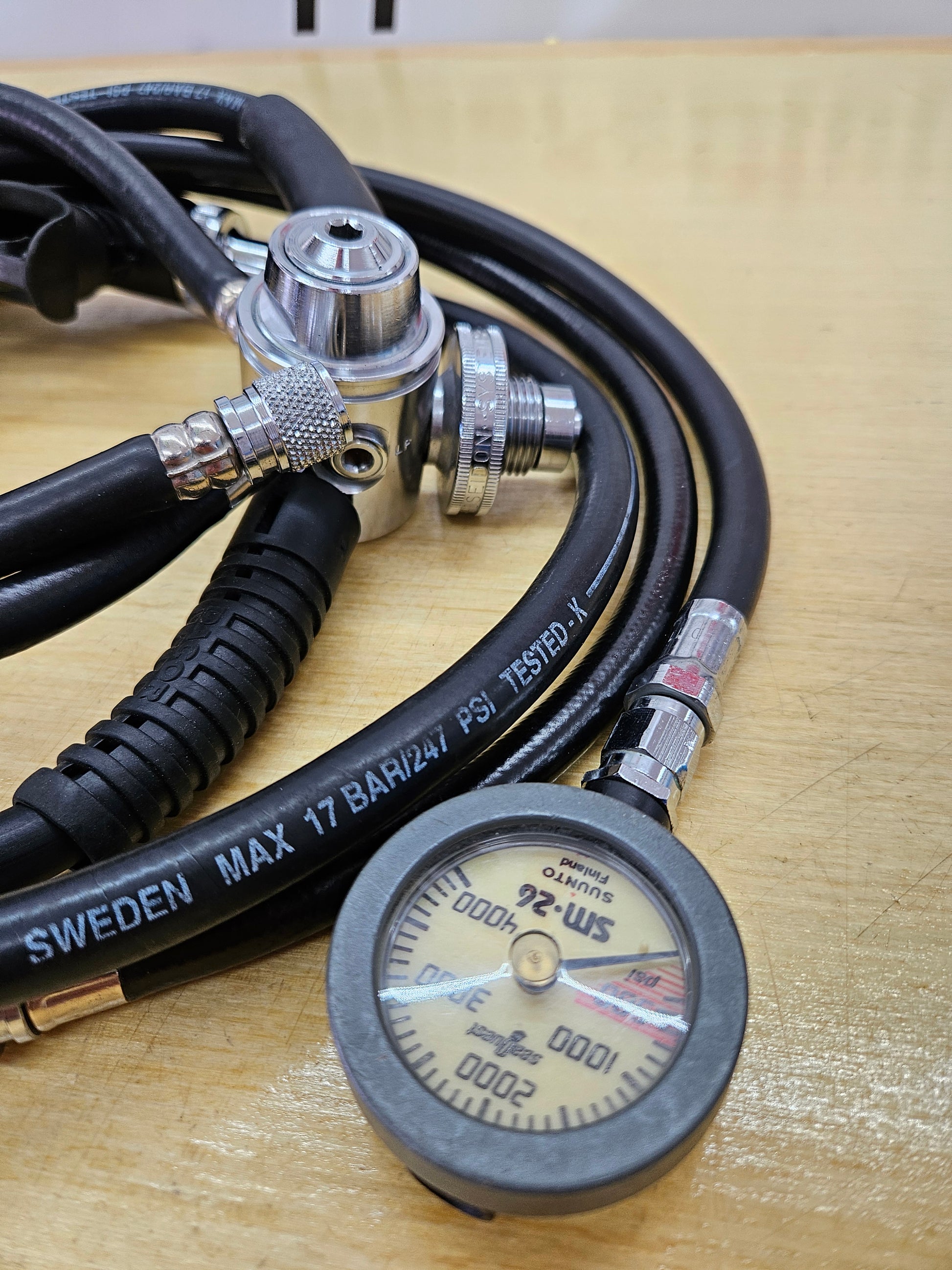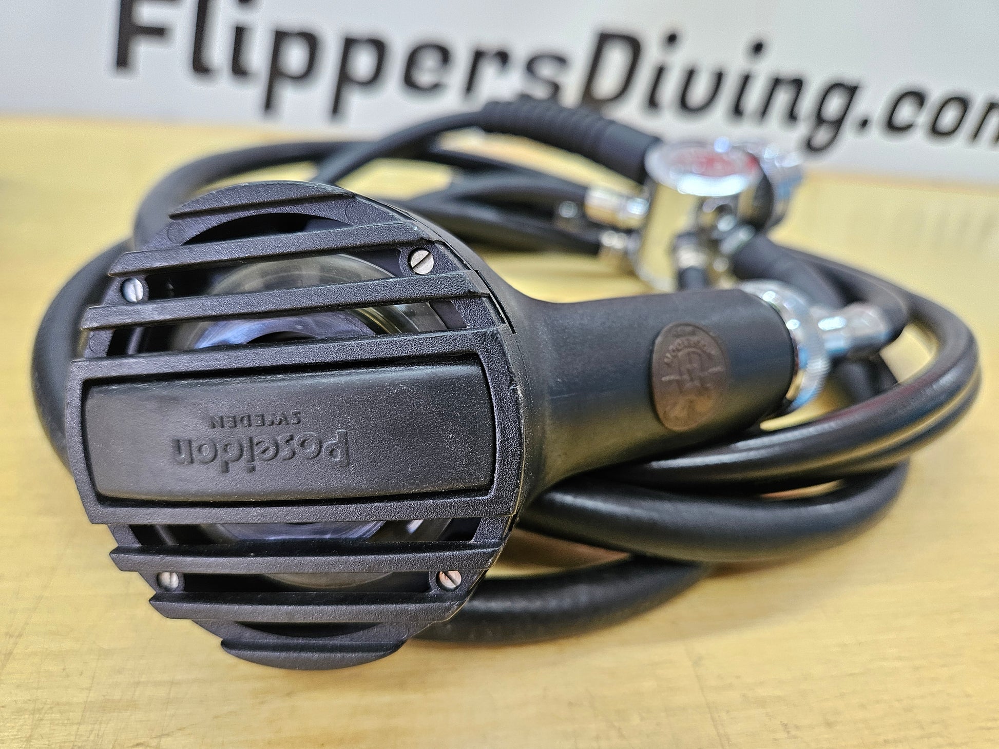 Poseidon regulator set. Super clean and appears to have had minimal use. Comes with DIN first stage, primary 2nd stage, suunto SPG and inflator hose. We do not specialize in Poseidon regulators and therefore will not be tuning this regulator, however IP is at 129 and solid, unit breathes great and upon inspection there are no concerns with corrosion, hoses, mouth pieces, etc. Poseidon regulators are a special breed and should only be worked on by those who are specifically trained to service them. Comes with original manual and bag. Sold as is, no guarantee or returns.