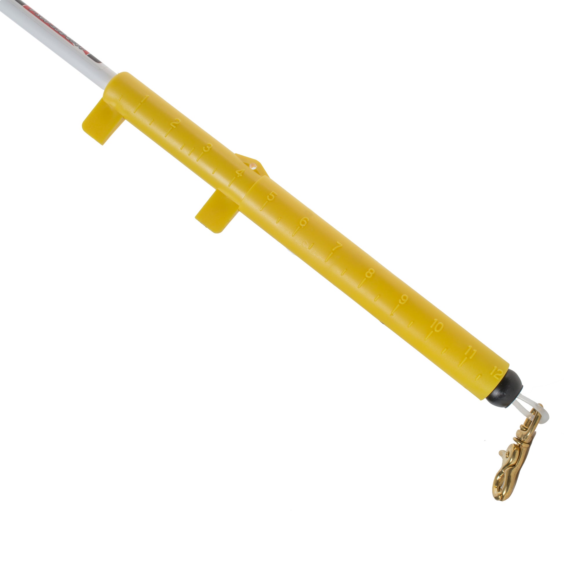 Handle includes 12" ruler for fish measurements and a separate mark for lobster tails and stone crab claws and a butterfly clip on the end for easy attachment.
