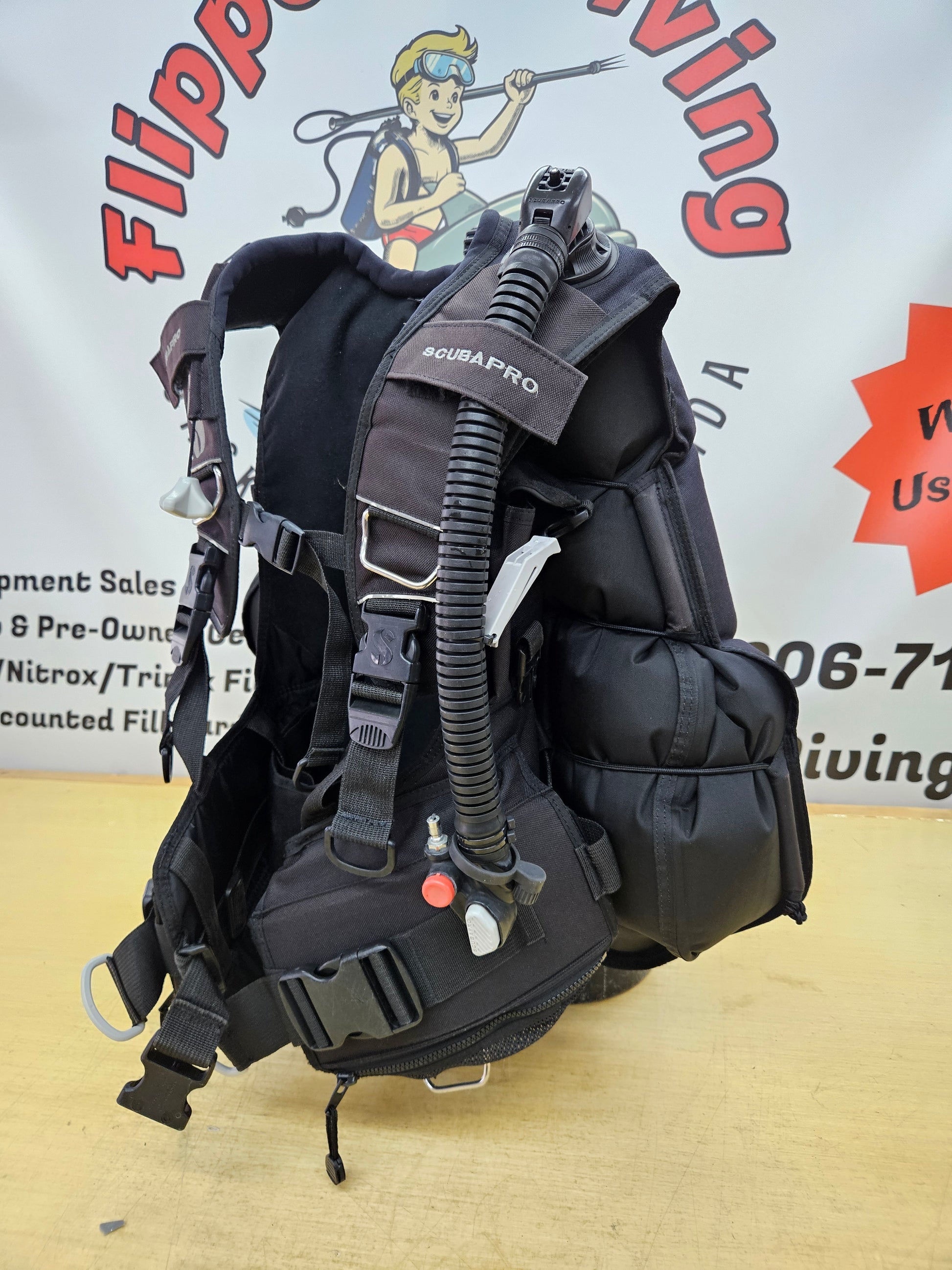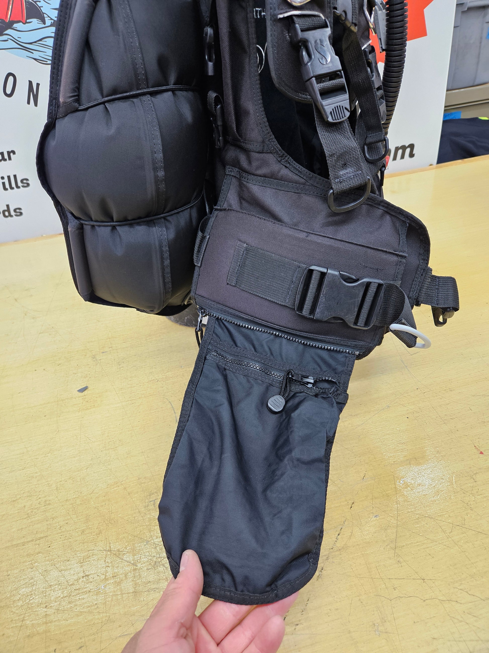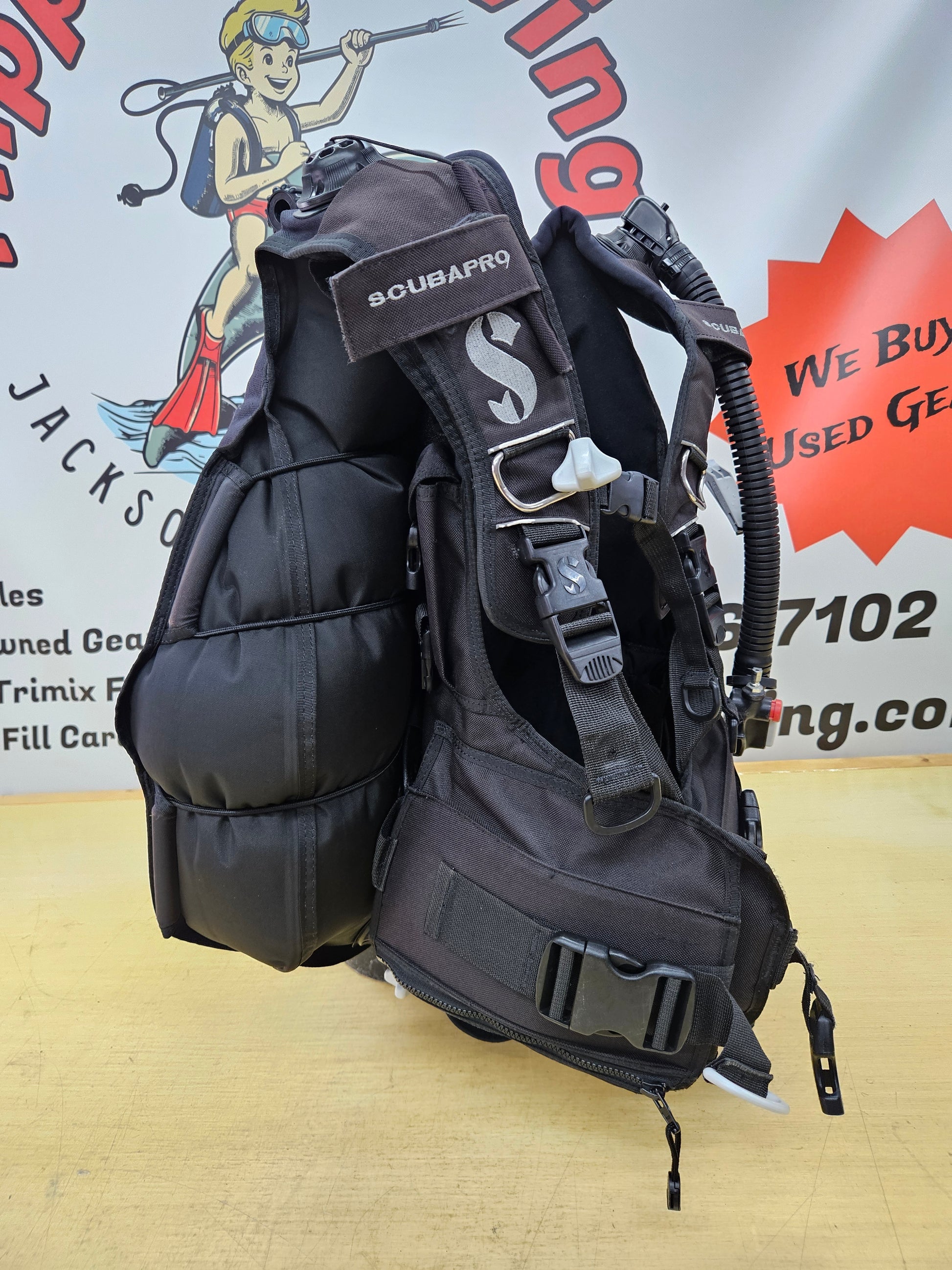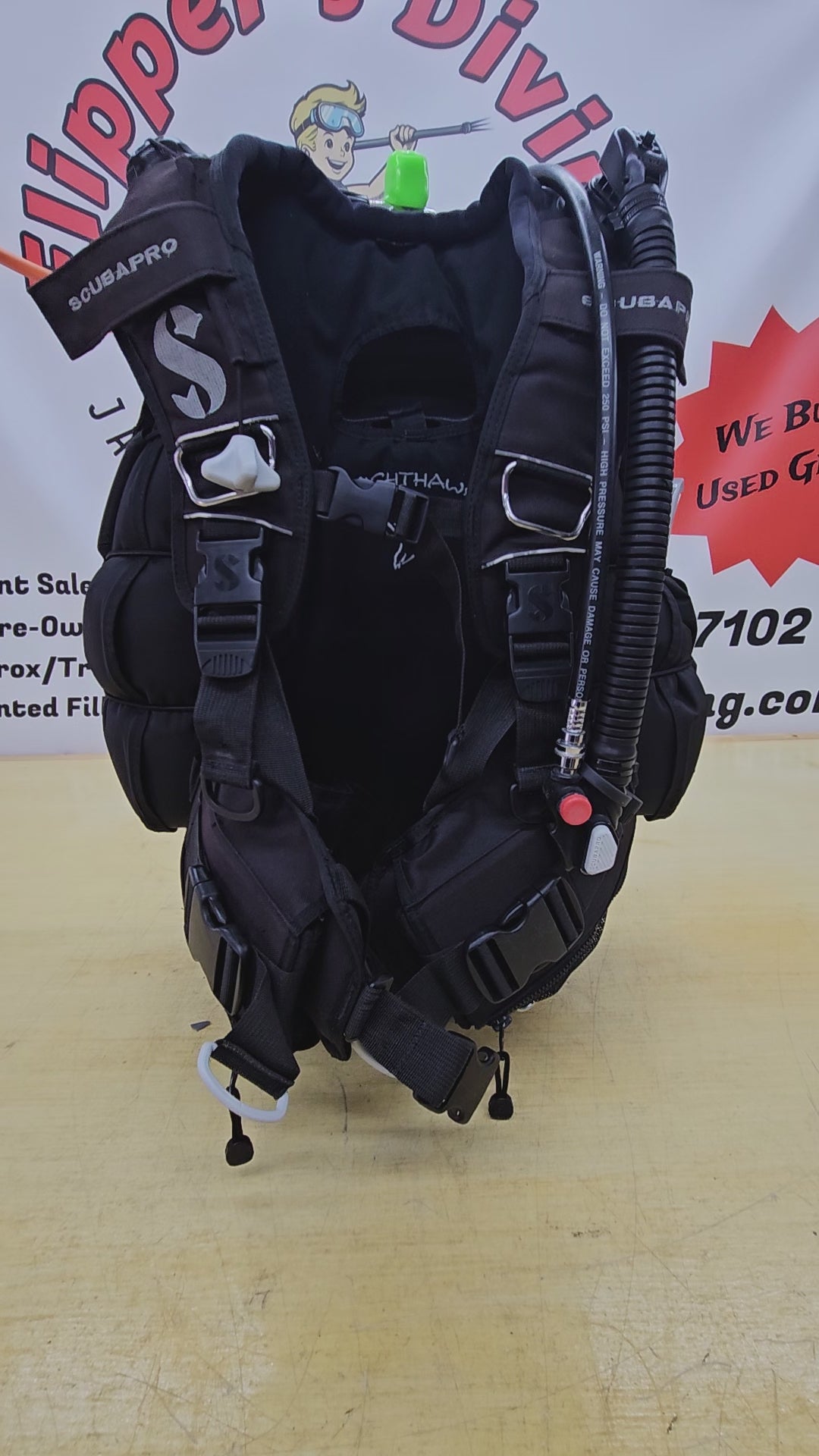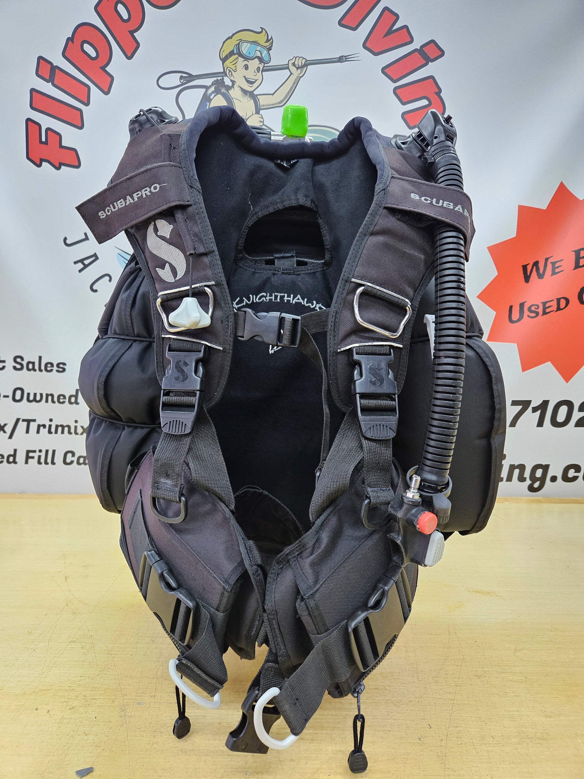 Scubapro Knighthawk BCD. Very good condition, it's fully inspected, leak tested and ready to dive. Power inflator serviced and works great! BCD features weight integration (12lbs each pocket), trim weight pockets (3lbs each pocket), back inflation style air cell/wing with bungie retainers, stainless steel cam buckle, hidden drop down storage pocket and heavy duty stainless steel d-rings throughout. Size Medium.