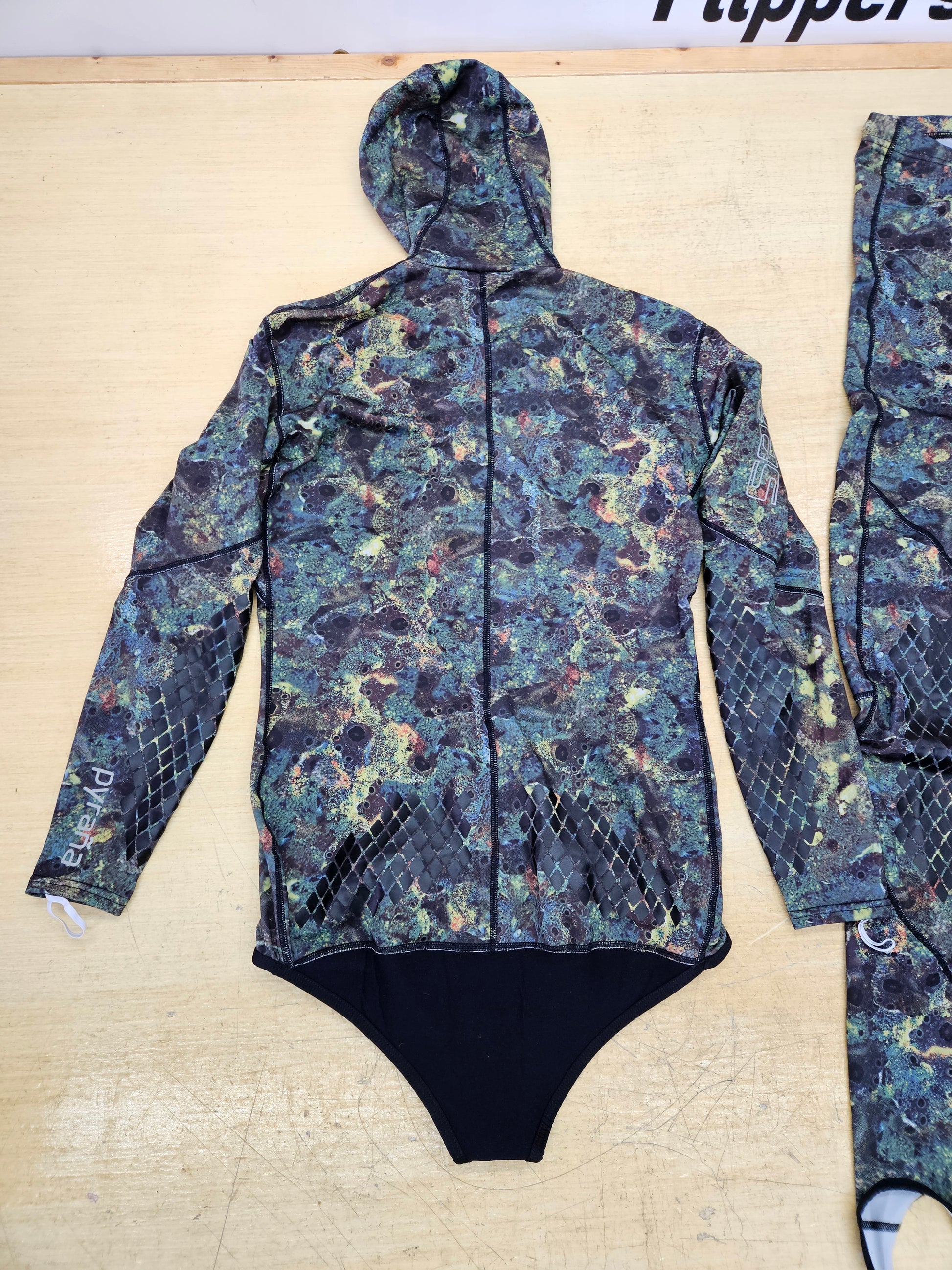 New! Never wet! Seac "Pyrana" 2 piece dive suit. This is a light weight skin type suit (less than .5mm), perfect for warm water spearing and hunting. Pants and top included. Top has velcro beaver tail closure at the waist and an attached hood. Size XL.