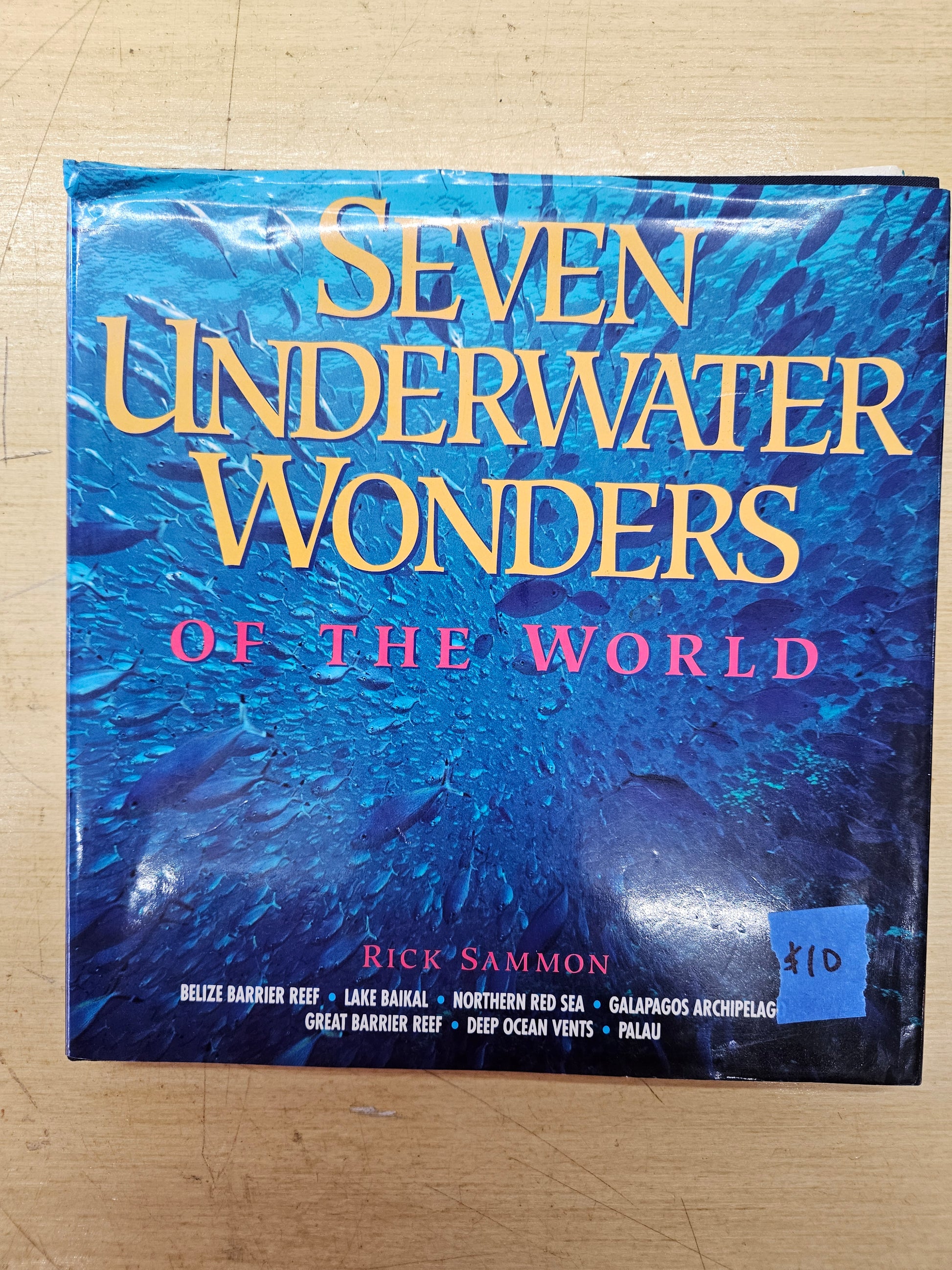 Hardcover book "Seven Underwater Wonders Of The World" by Rick Sammon. Amazing color photos and details about Belize, Lake Baikal, Northern Red Sea, Galapagos, The Great Barrier Reef and several other amazing dive locations. Overall good condition.