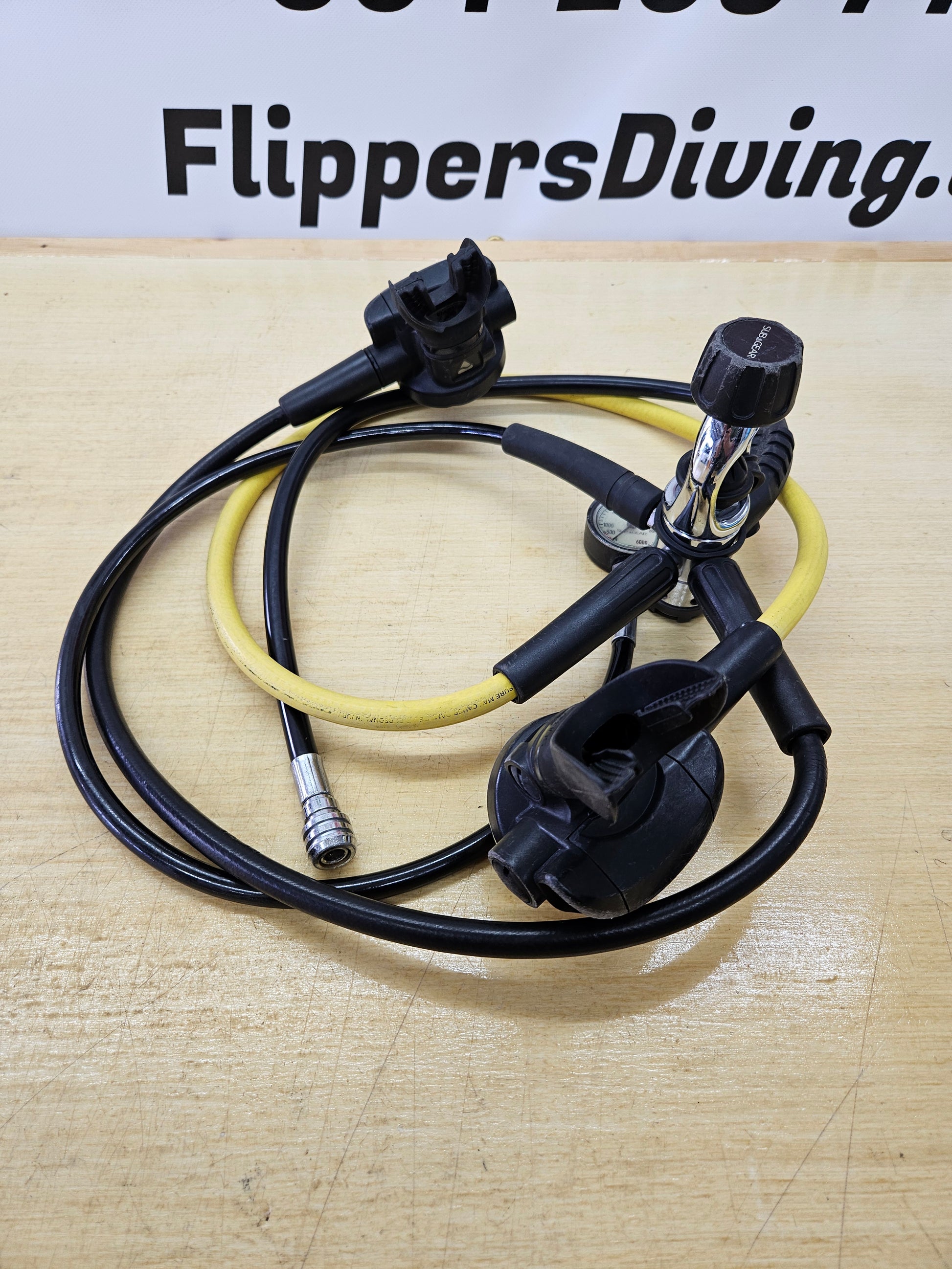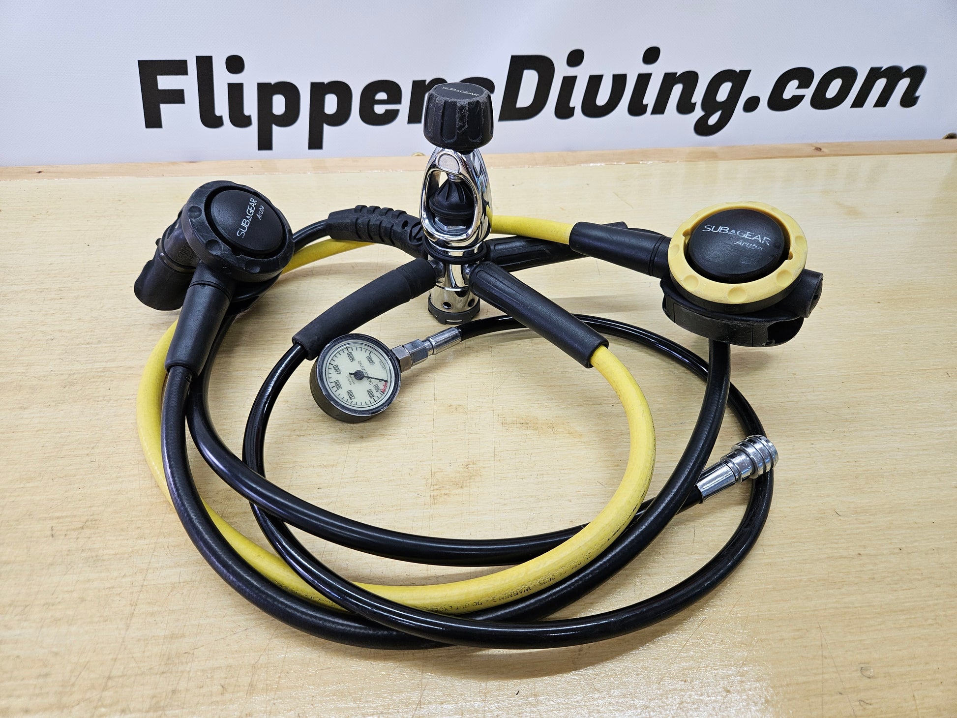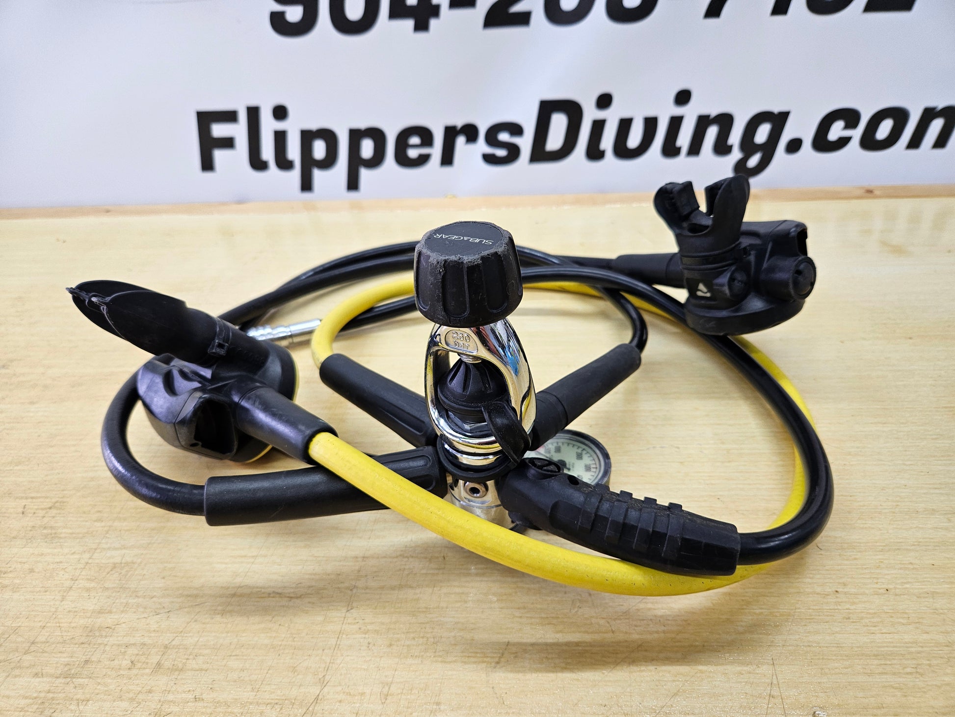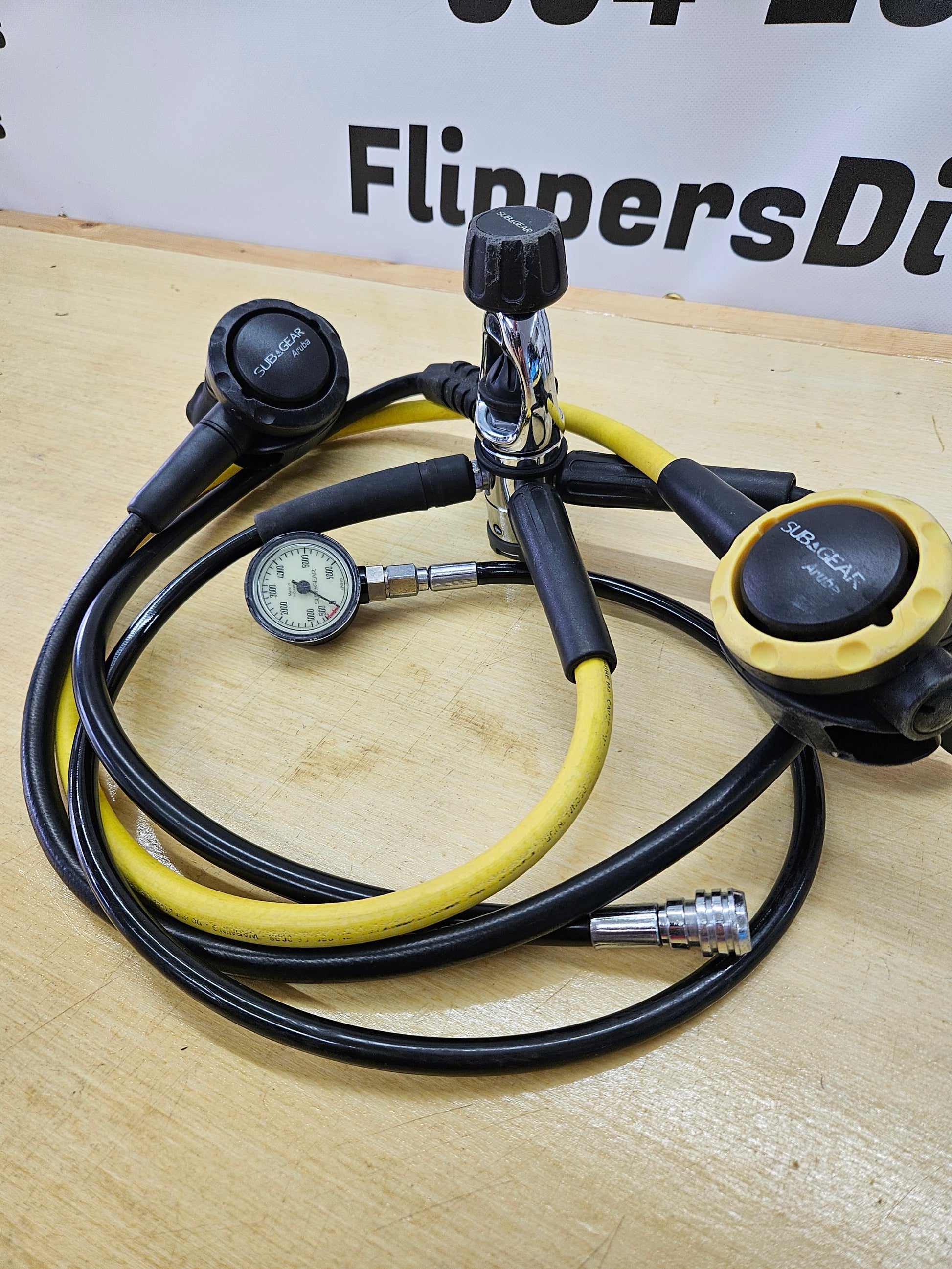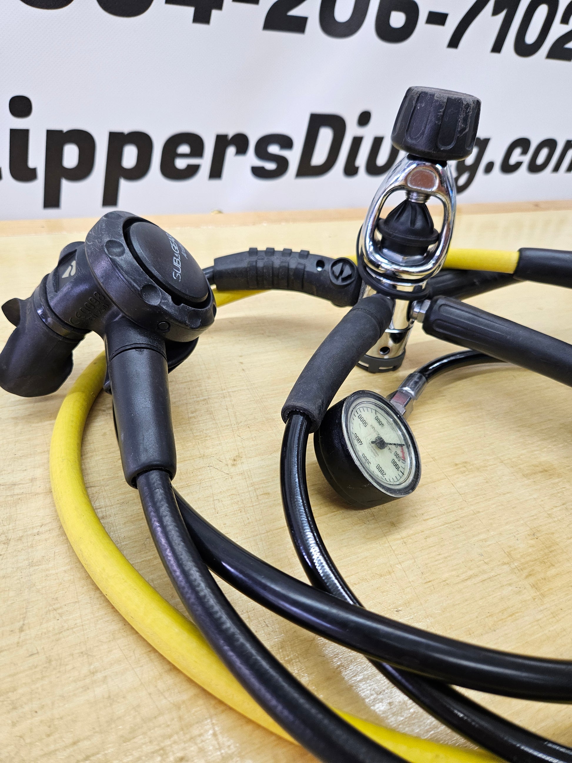 Sub Gear regulator set. Complete set of regulators including first stage (yoke tank connection), primary and backup 2nd stages, LP inflator hose (standard fitting), and 5000psi pressure gauge. Regulators have been inspected, tested and tuned and they are ready to dive!