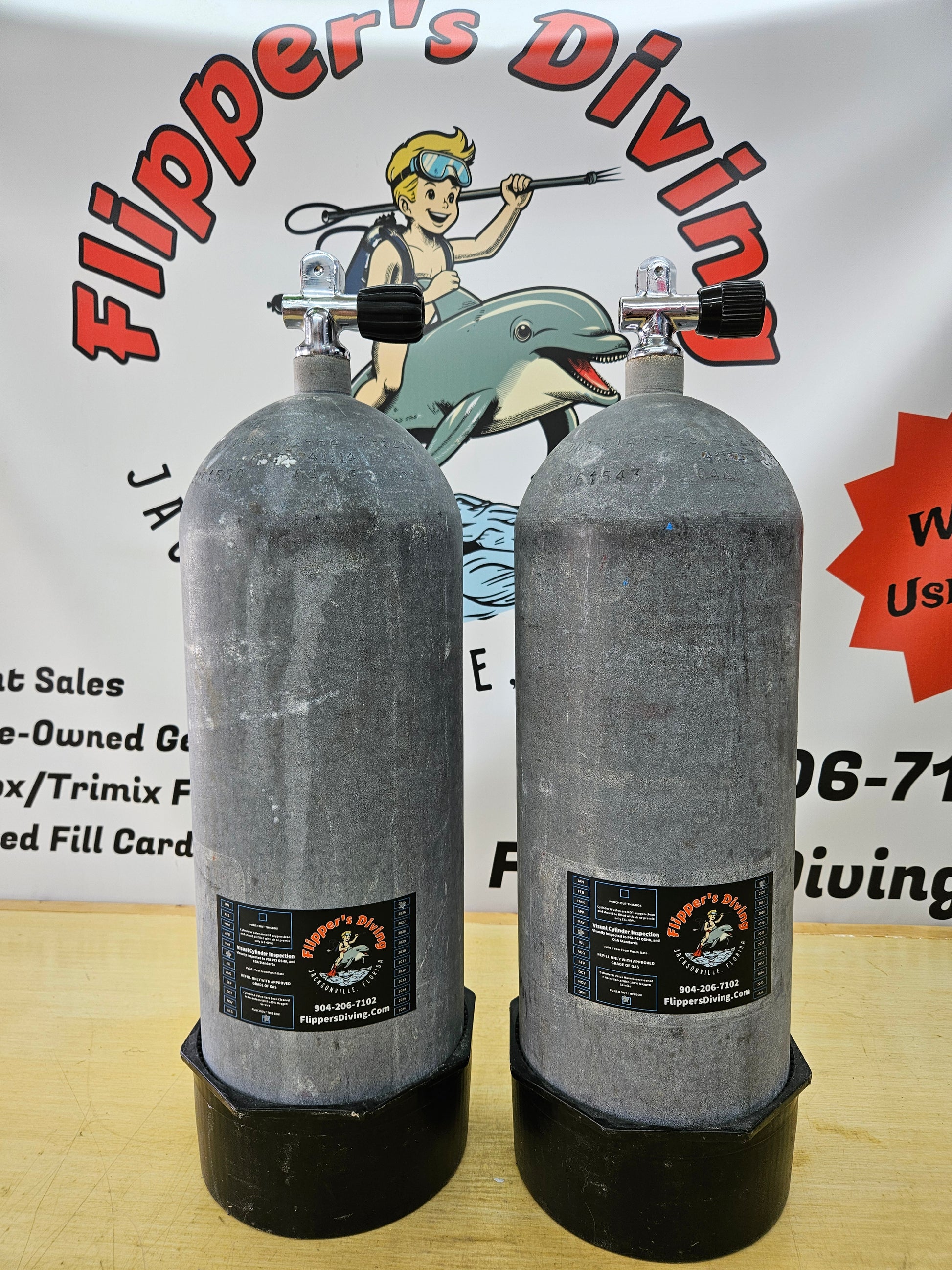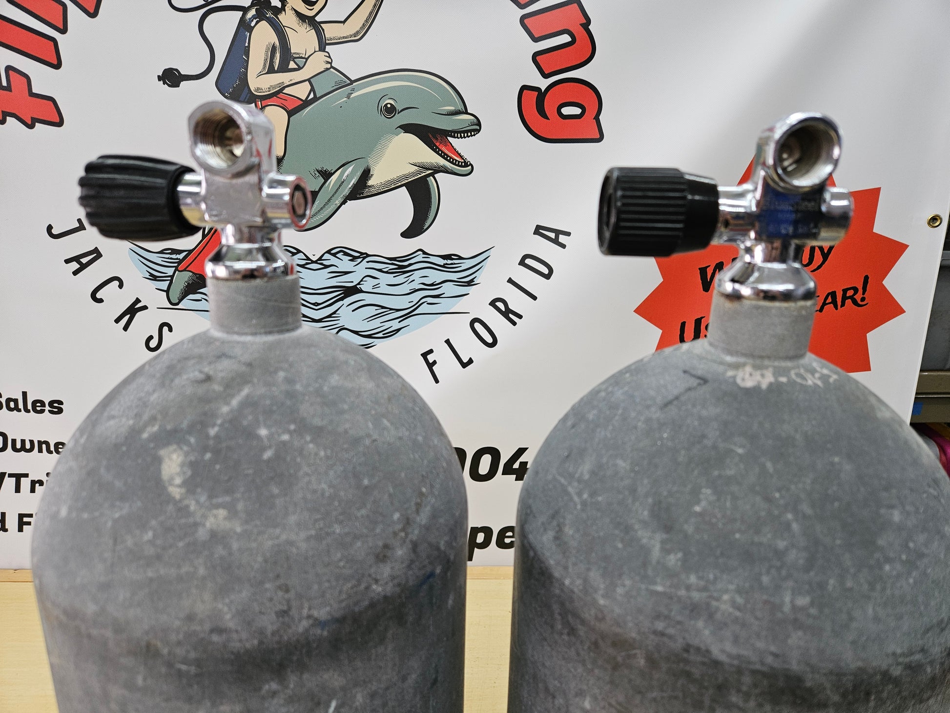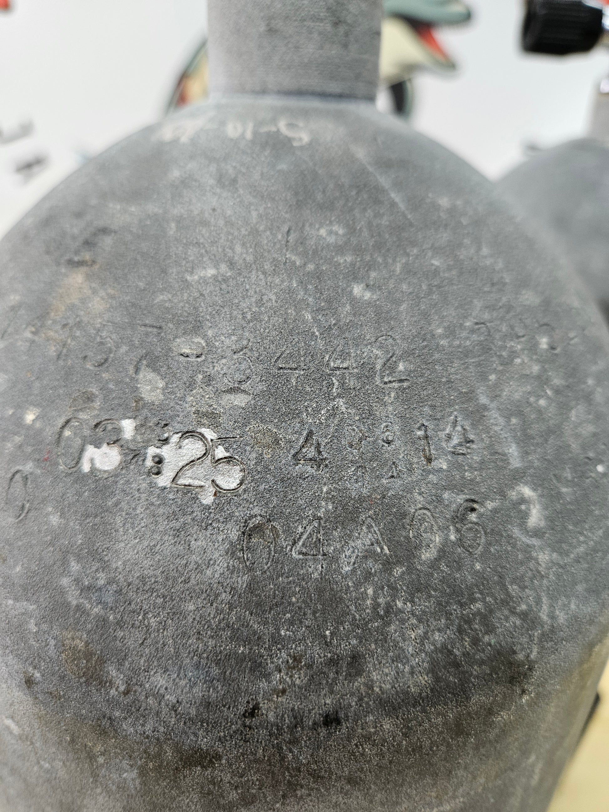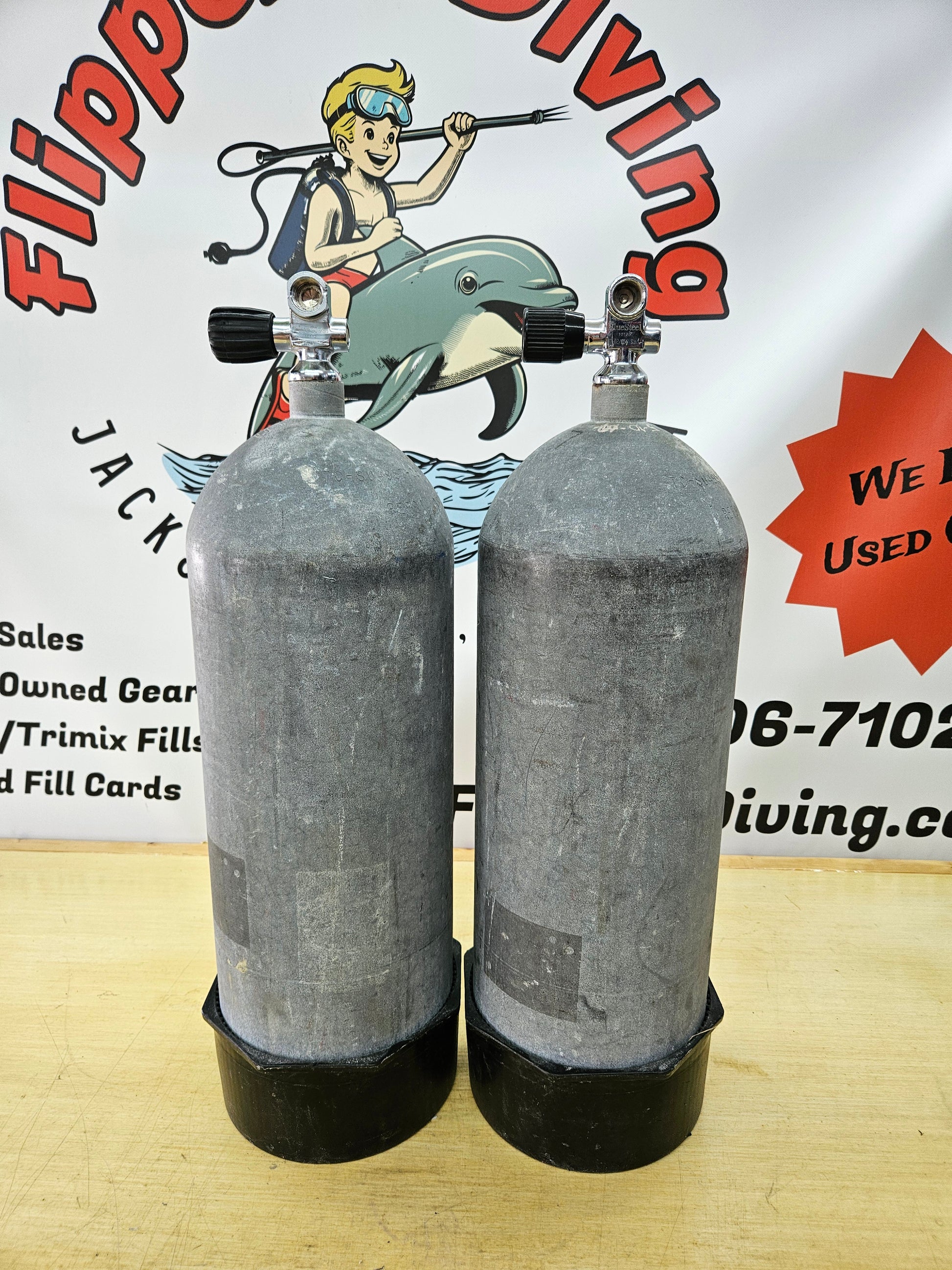 Worthington steel scuba cylinders with pro valves and tank boots. Galvanized finish and they just had fresh VIP and 02 cleaning. Manufactured 04/2006 and most recent hydro was just done 03/2025. Difficult to find cylinders as they are not produced any longer. There are 3 available... 2 pictured together and 1 other pictured seperately. All 3 are matched with same manufacture and recent hydro dates.