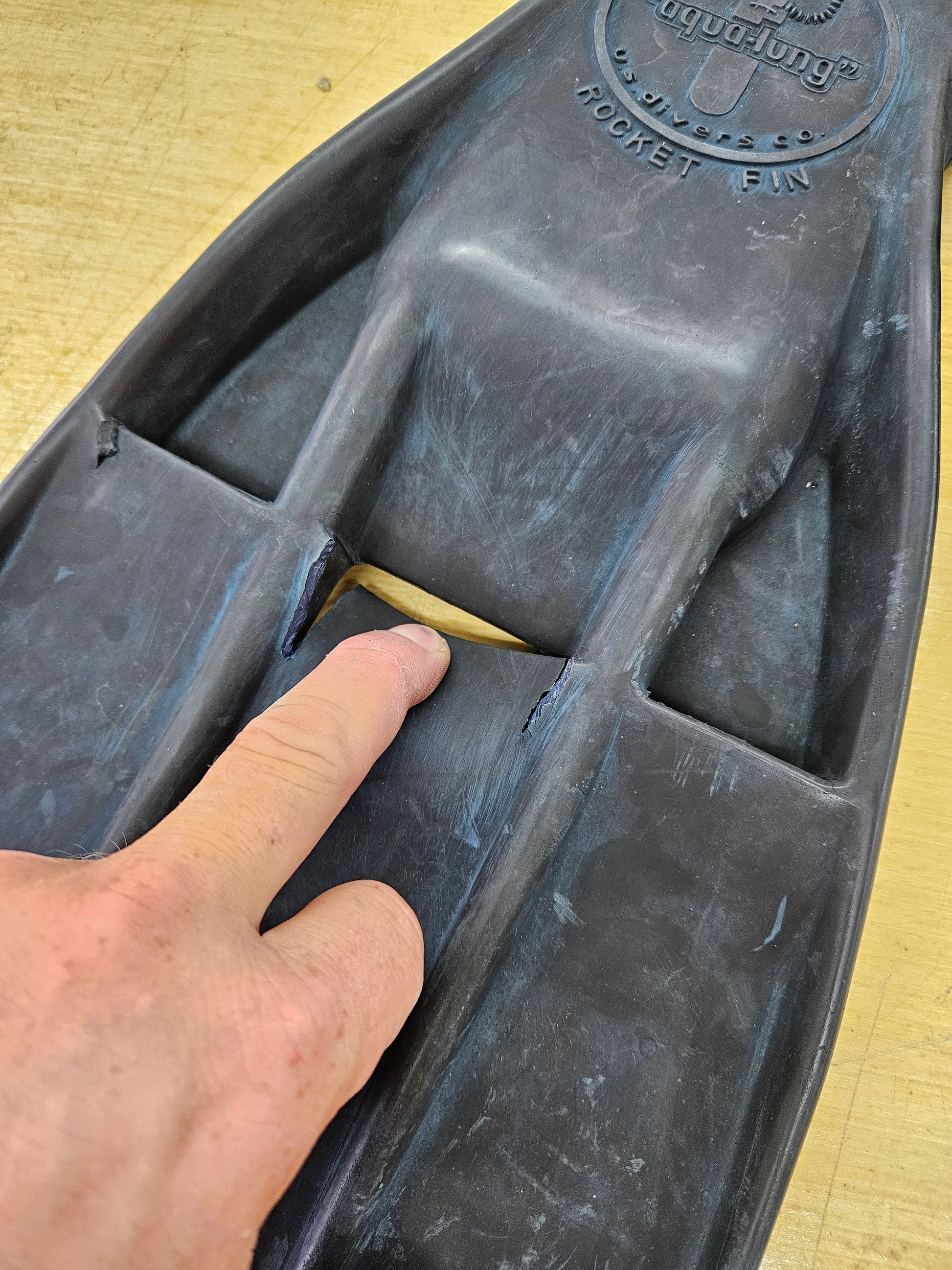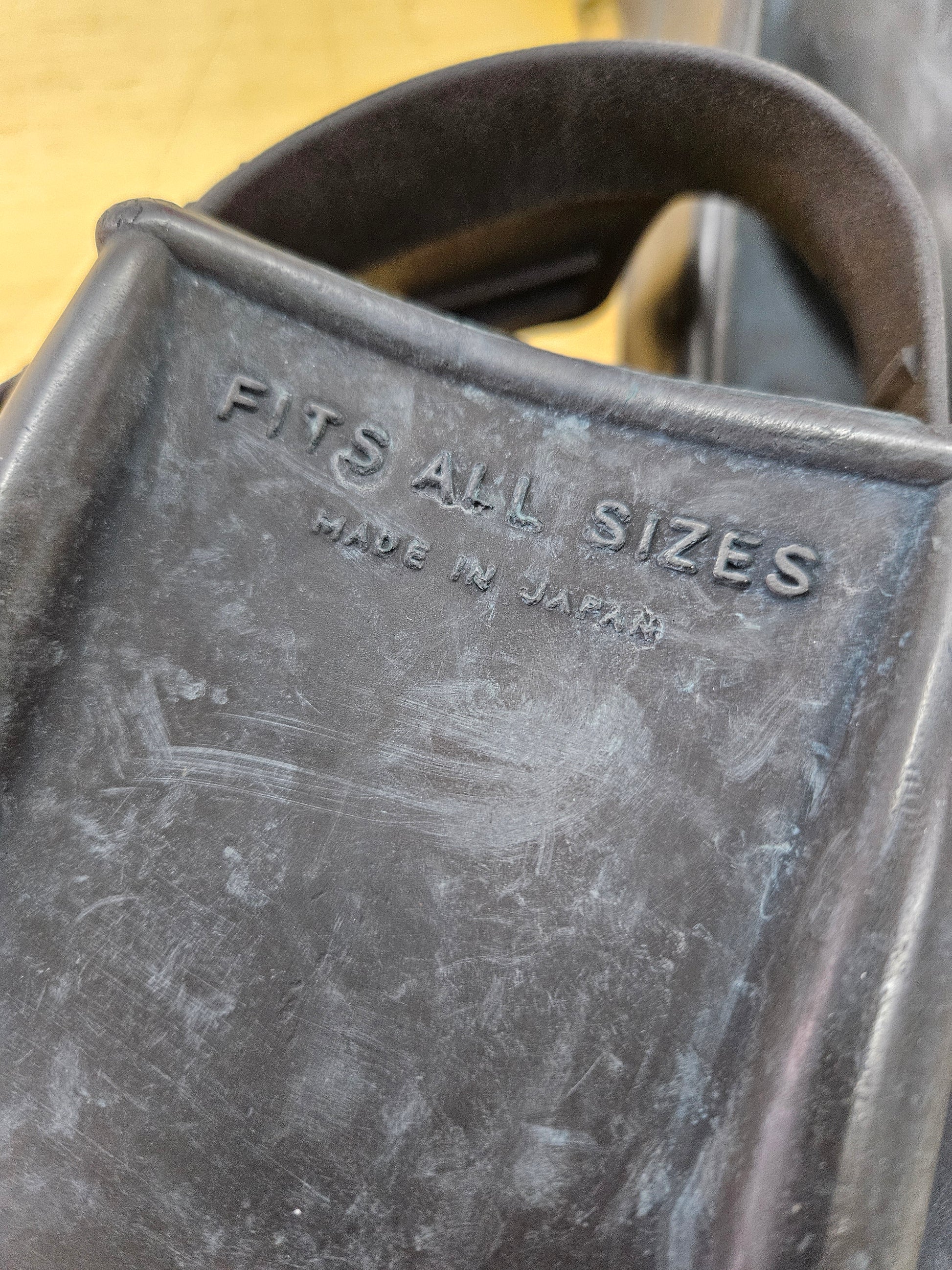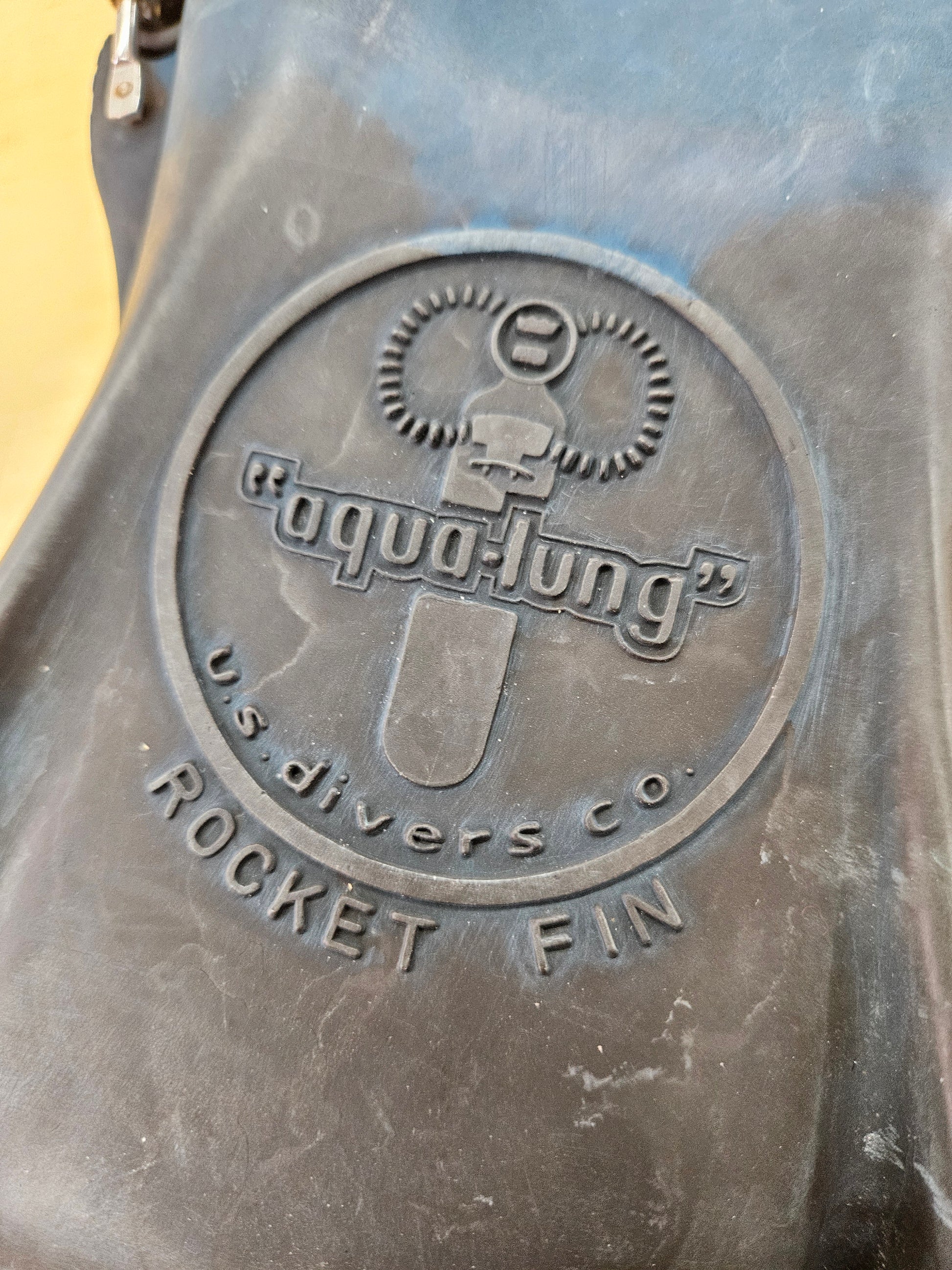 Aqualung US Divers Rocket Fins (Medium 8-10). Although it says "fits all sizes"... they really don't. With a wetsuit boot they would work best for a men's size 8-10. Small tear in one of the fins... doesn't effect performance.