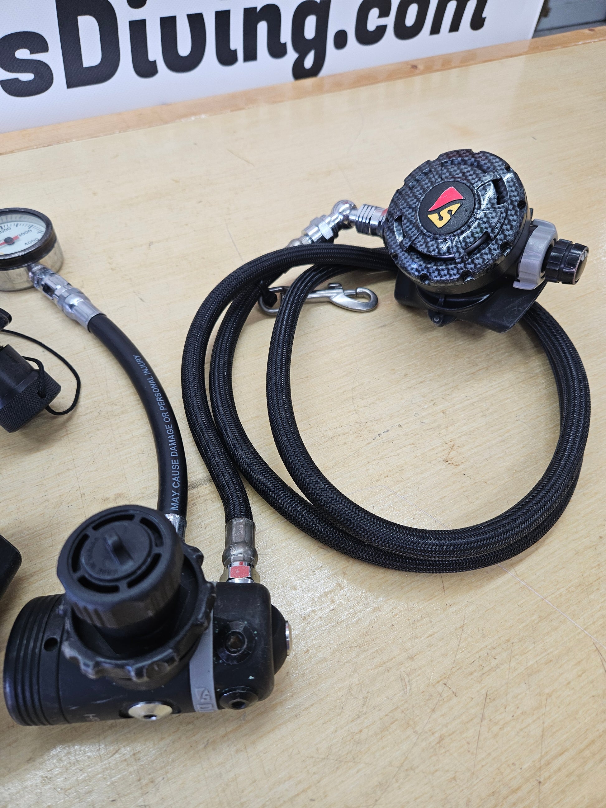 Dive Rite XT complete sidemount regulator set. This includes 2 - XT1 environmentally sealed DIN first stages, 2 - XT balanced/adjustable 2nd stages, 2 - brass/glass 2" SPG's on 9" HP hoses, long LP hose, short LP hose, short LP inflator hose and pictured hardware. Regulators have some normal scratches/cave rash from being dove here in the Florida springs/caves. Regulators have been inspected, tested and tuned and both have a solid IP of 145psi. They're ready to dive! Sold as a set only, sorry will not split up. Need individual components? DM me for more Dive Rite equipment options.