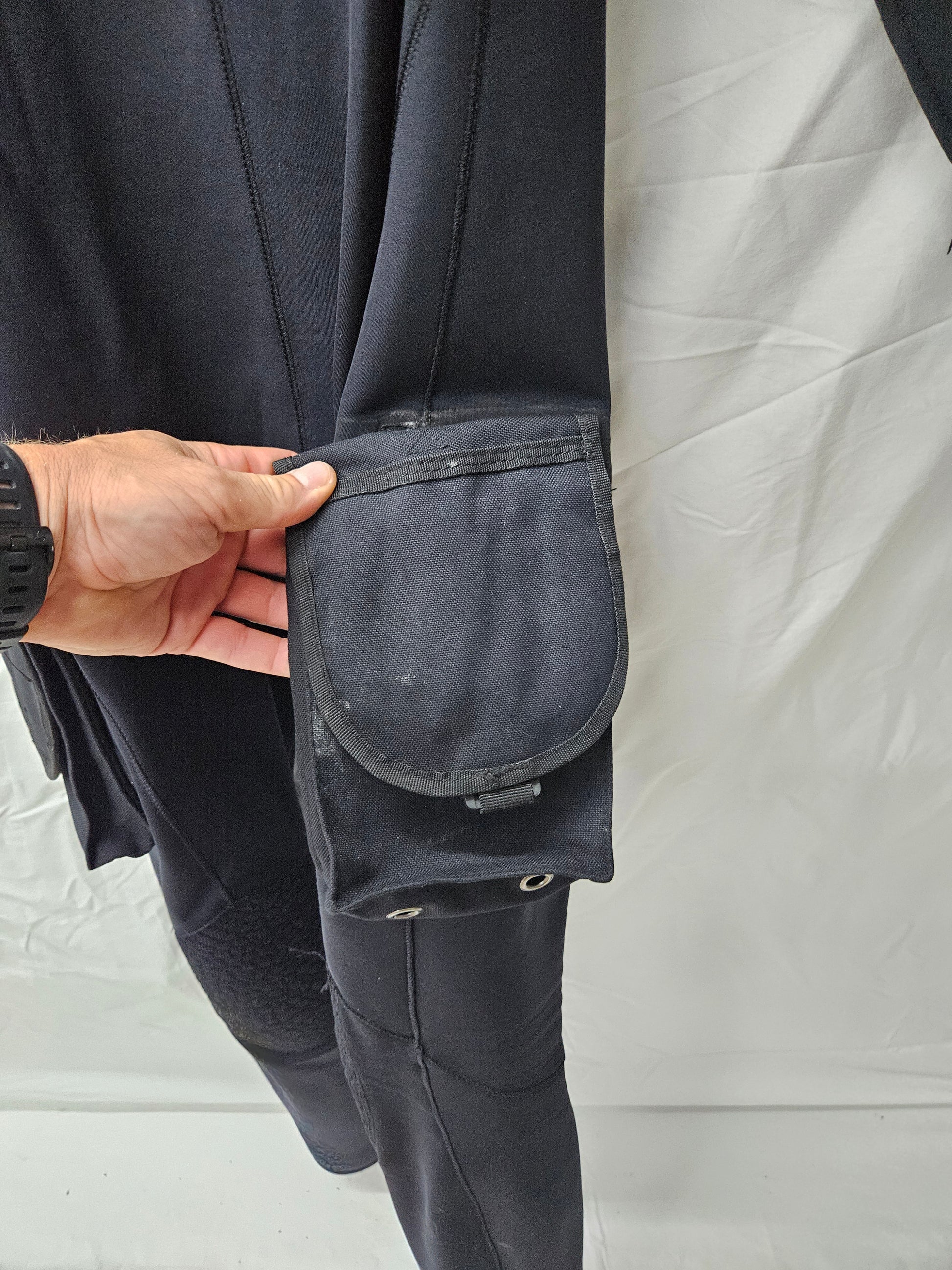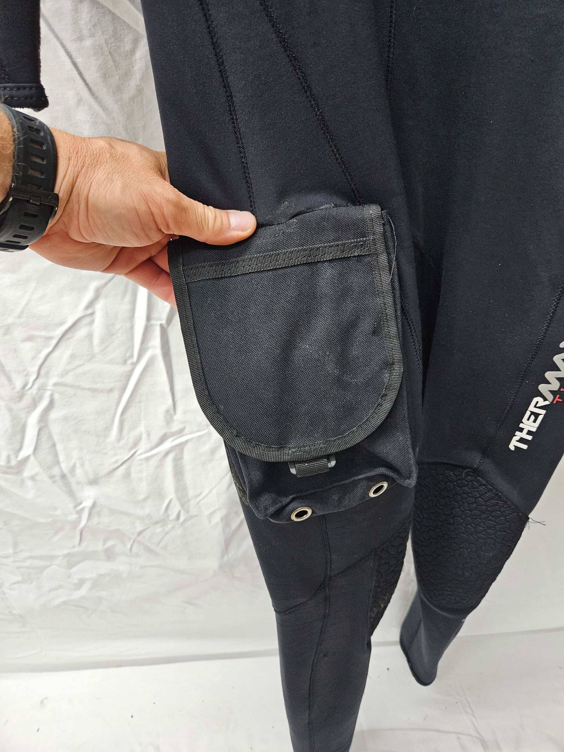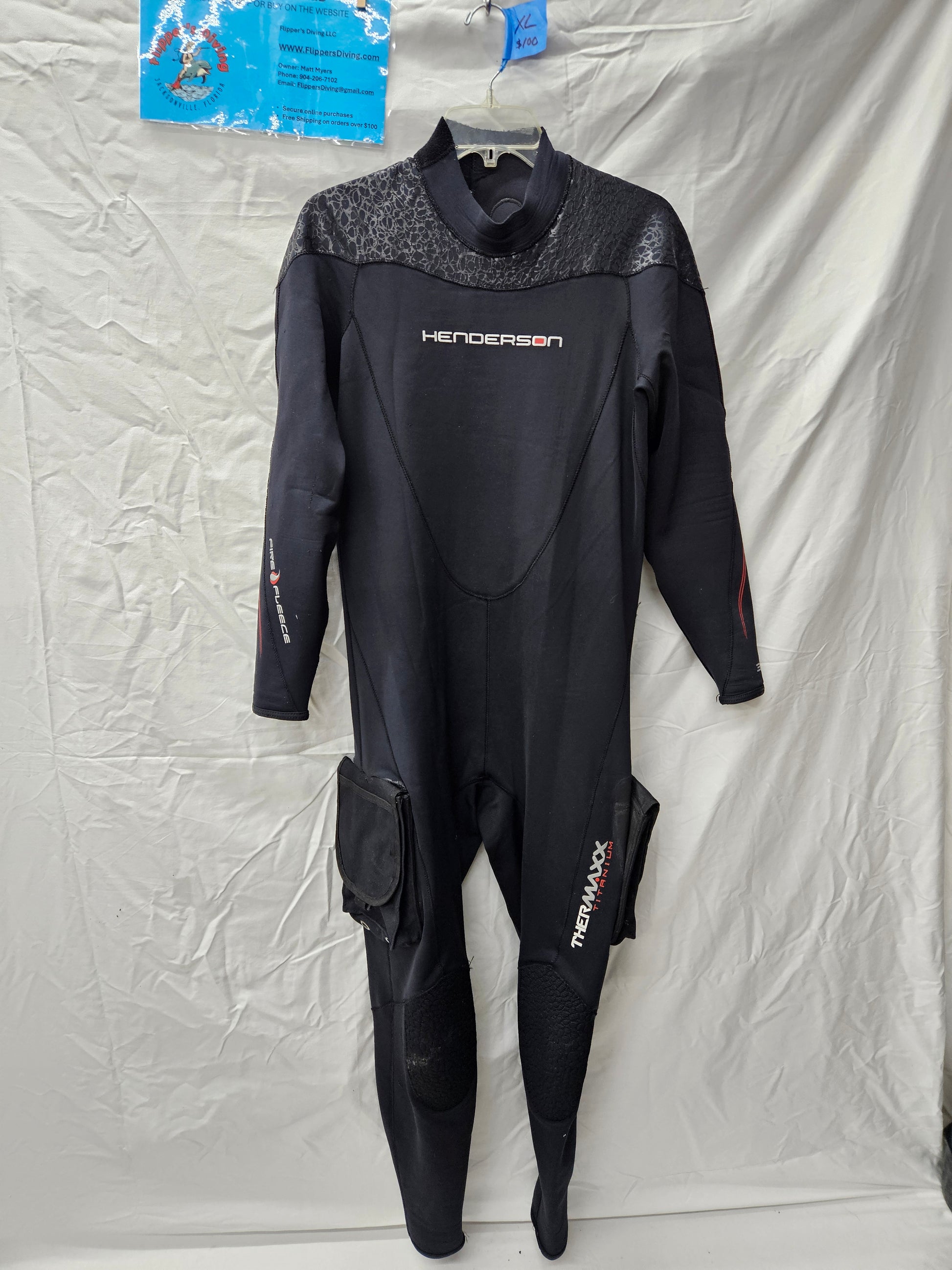Henderson Thermax 3mm wetsuit with "fire fleece" lining. Suit has 2 XS Scuba thigh pockets glued on and was my person wetsuit for 2024. It's got about 75 dives on it. No rips/tears or excessive wear. The pockets alone run about $30 each. Size XL.