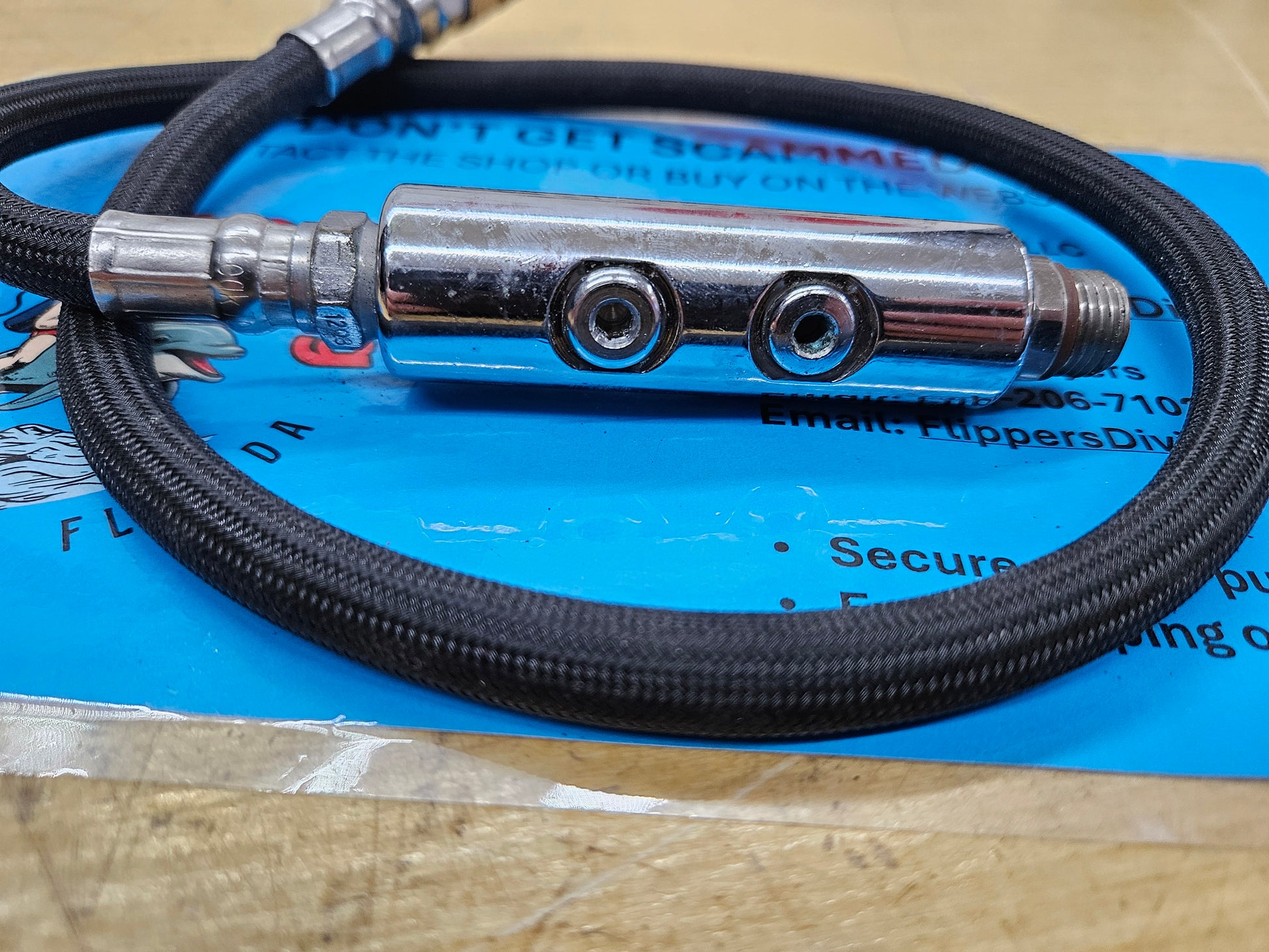 Sold as is... condition unknown! Appears to be an LP gas block with LP braided flex hose and omni swivel quick disconnect. Obviously would be used in a rebreather application or a redneck SNUBA system for the whole family! Enjoy!