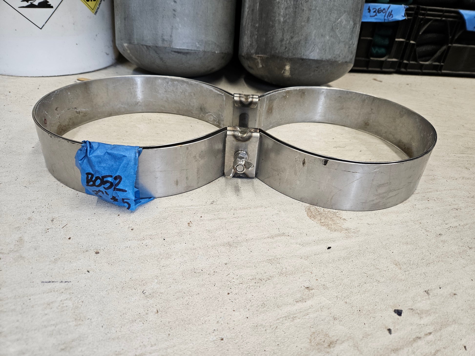 OMS 8" stainless steel tank bands. Comes with what is pictured. Missing the 2nd threaded rod/hardware for the 2nd band. I likely have an extra lying around I can toss in no problem. These are heavy duty and well made bands, perfect for doubling up 8" diameter cylinders like LP104's, LP108's, HP133's, LP95's, HP117's, AL100's, etc.