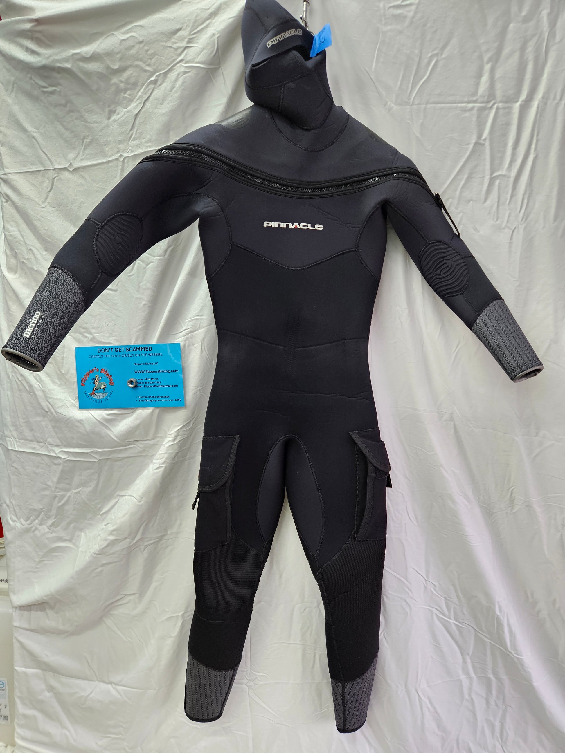 New, old stock! Never wet! Pinnacle M8 (8mm) semidry wetsuit. AWESOME suit to keep you warm this time of year and a fraction of the price of a drysuit. Zippered chest entry with attached hood, thigh pockets and zippered wrists and ankles for easy on/off. Size Medium (Medium (M): 170-177 cm (5'7"-5'10"), 68-80 kg (150-175 lbs), 36-40" chest.)