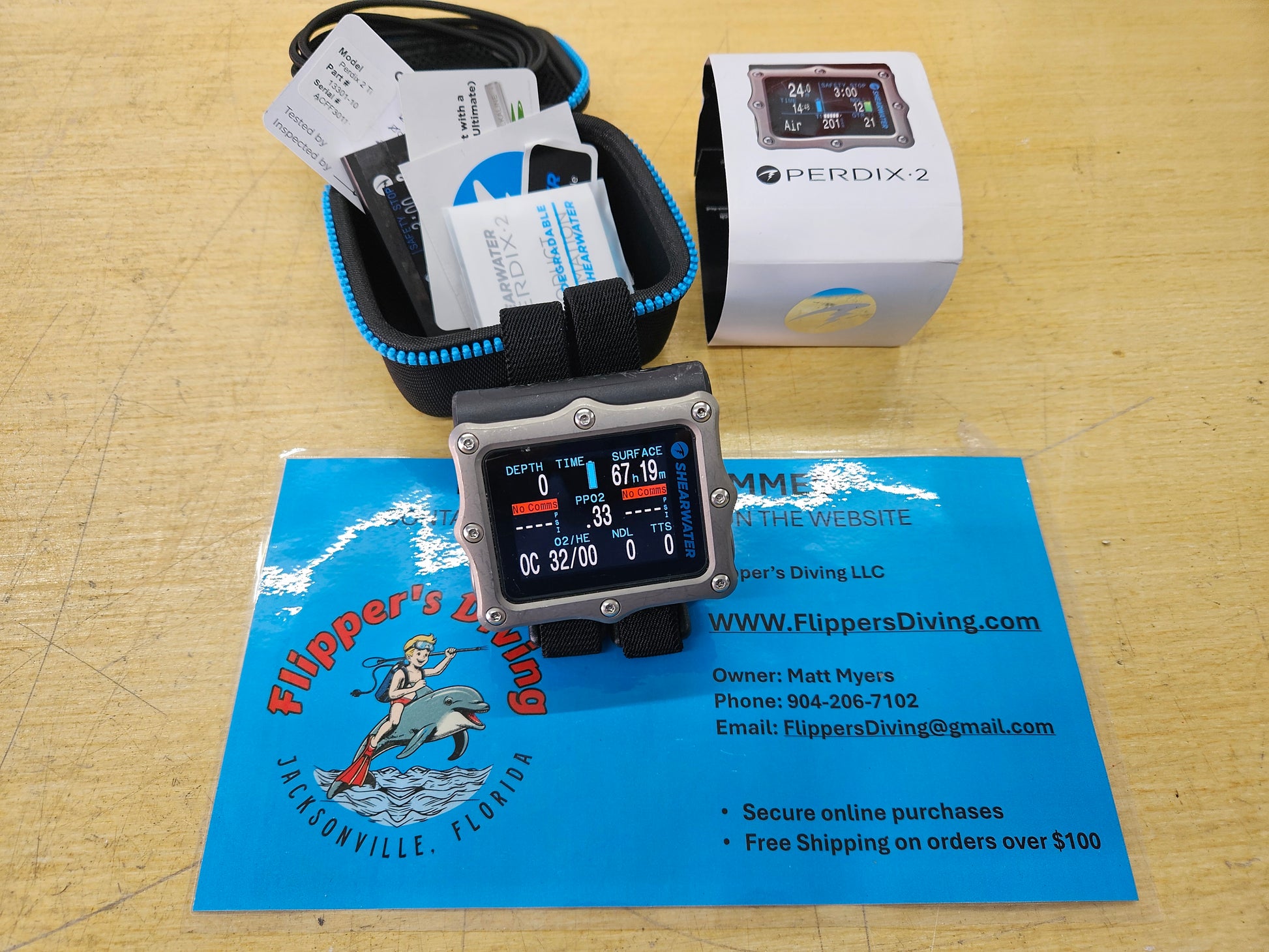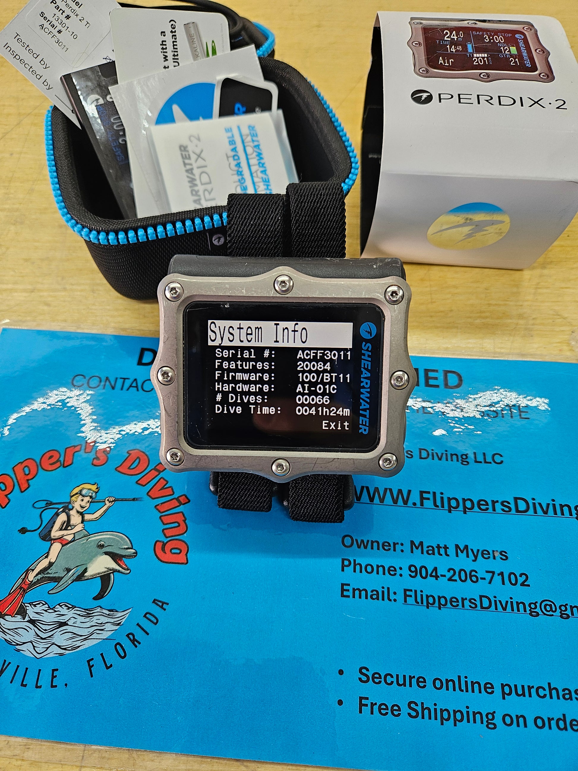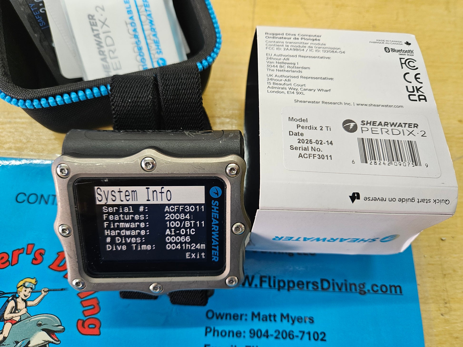 Shearwater Perdix 2 AI with silver/natural titanium bezel. Computer is only 9 months old with 66 dives and 42 hours of dive time. All pictured extras included (straps, case, etc). Computer is in very good condition, some light scuffing around the titanium bezel but otherwise in great condition. See pictures. Transmitter(s) not included but are listed separately for sale and came from the same owner (same age/use).