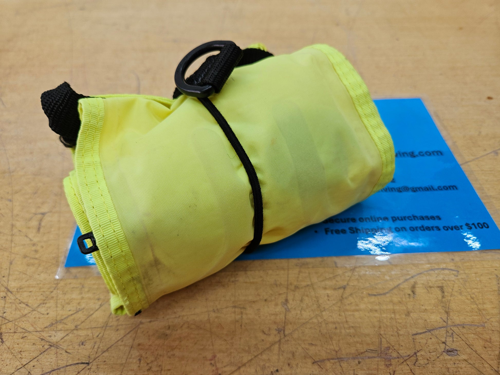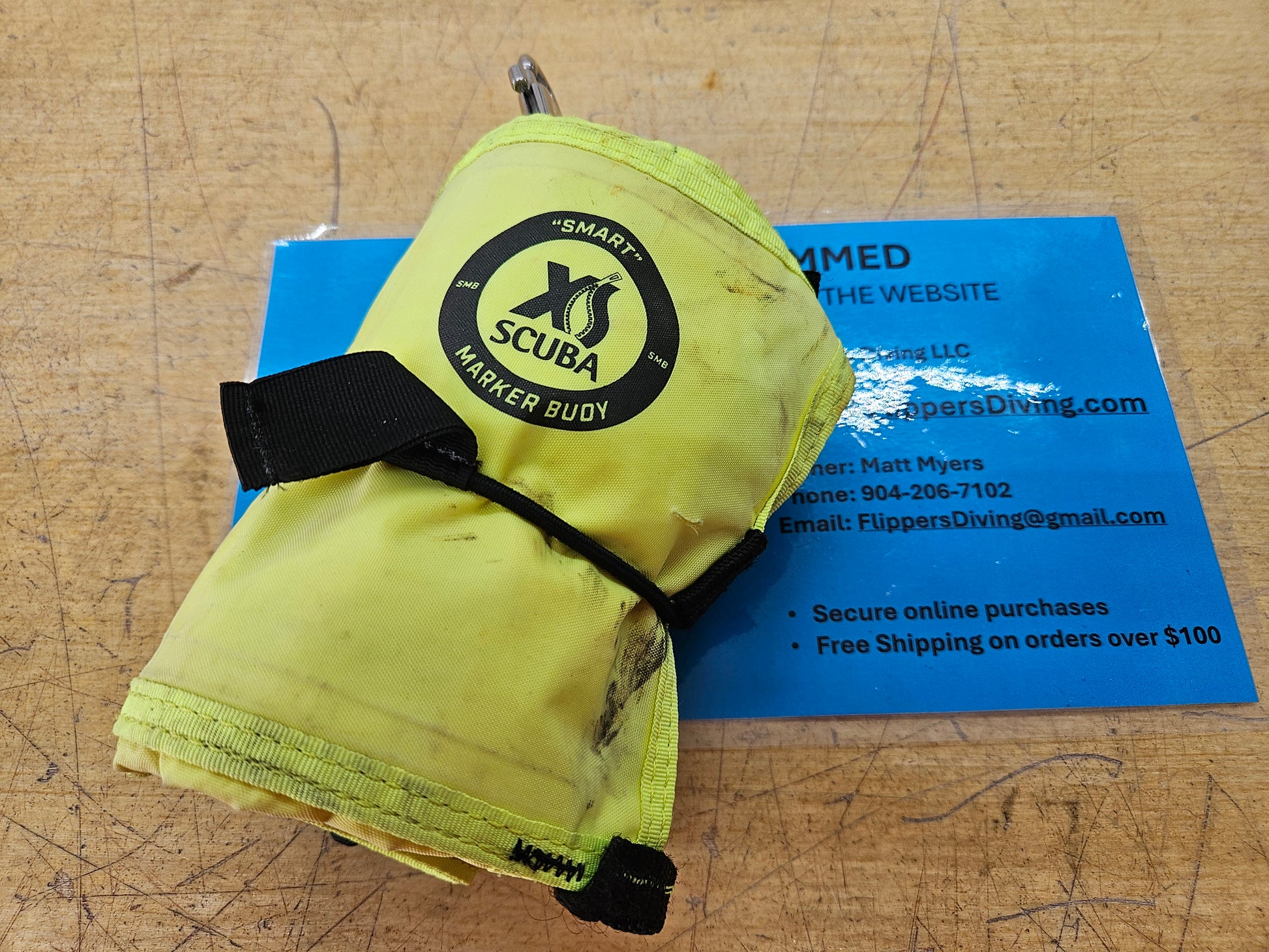 1 year old... XS Scuba "Smart" surface marker buoy SMB. 5ft long, oral inflation valve can also be used with standard LP inflator hose from your regulator. Small pocket built into the lower section of the SMB allows you to either put a small spool of line or even a lead weight to keep the SMB upright on the surface. OPV built in, easy to deploy at depth. Leak free and ready to dive! Comes with stainless steel bolt snap pictured.