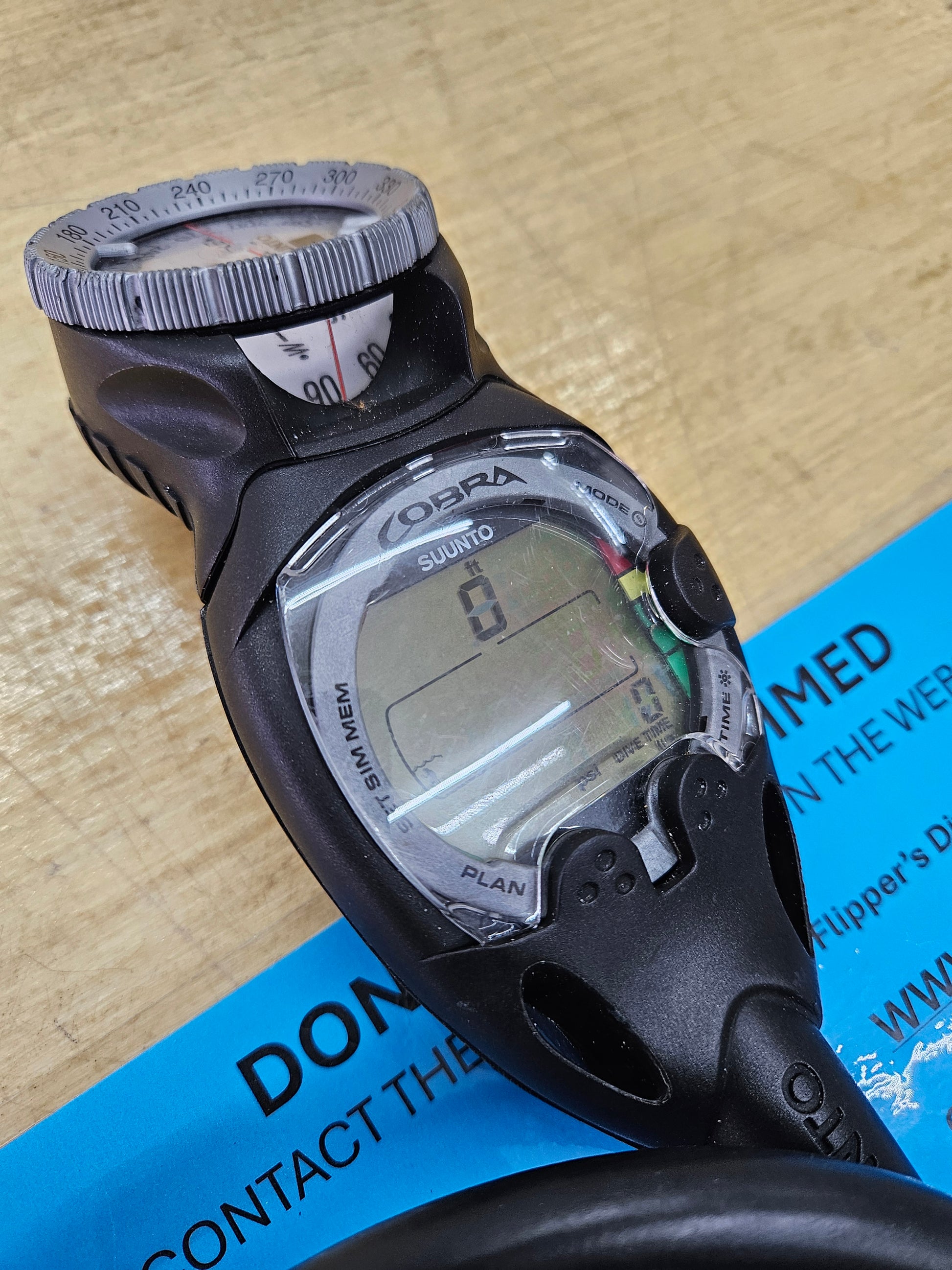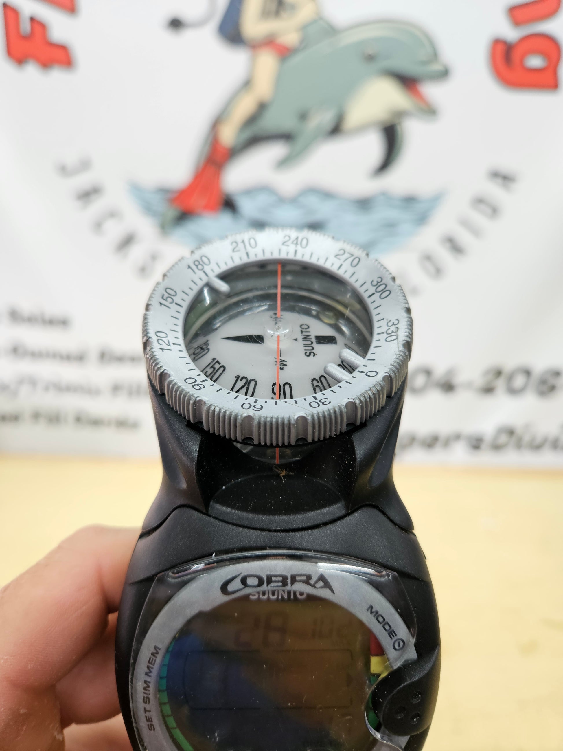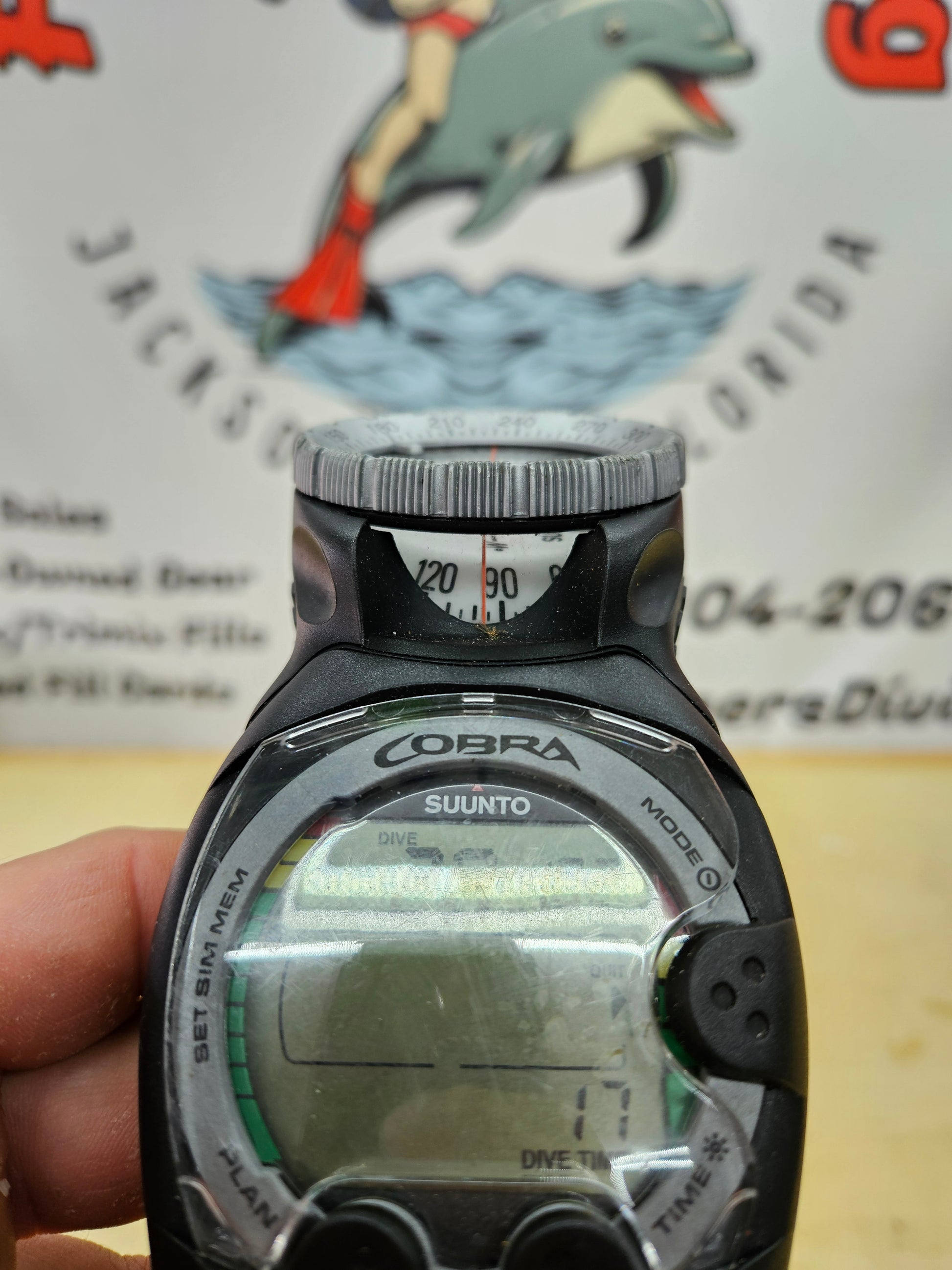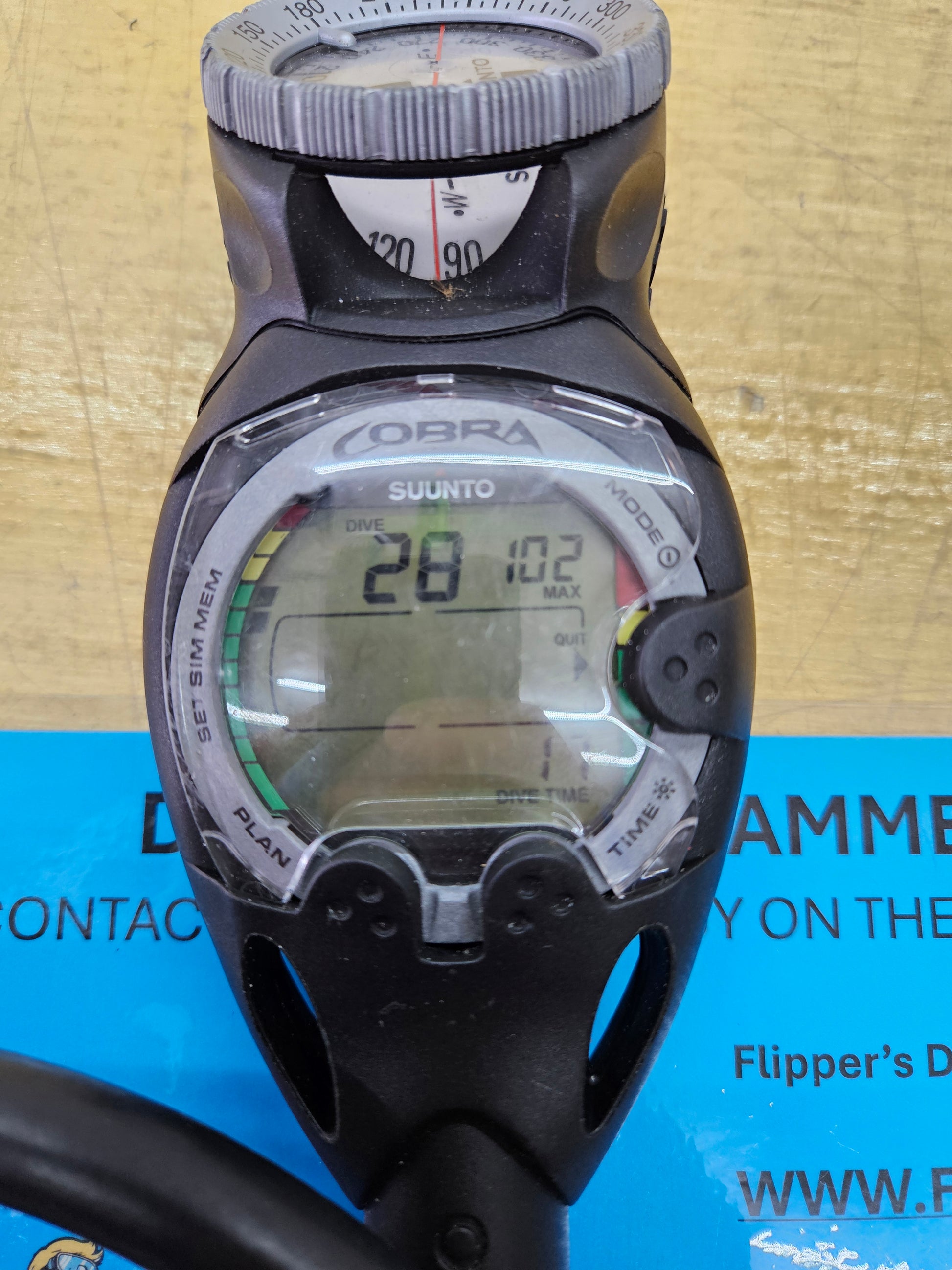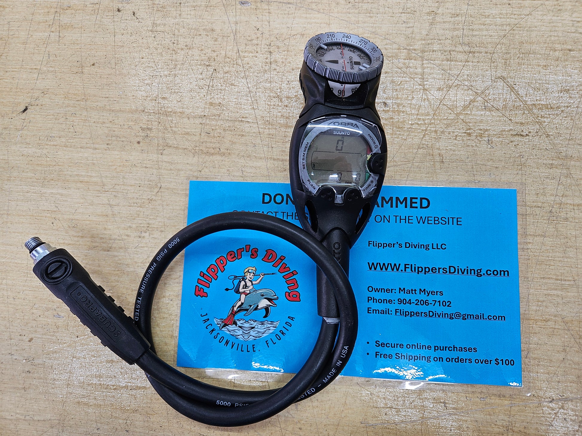 Suunto Cobra air integrated dive computer with compass! This computer is in excellent condition and just had a full servicing including battery change. As an air integrated computer you will electronically monitor your gas supply and the computer with track gas consumption as well as provide on the fly data for remaining gas time and accurate pressure readings. Computer is also nitrox capable of mixes up to 50%. Compass is in excellent condition and the unit comes on a standard HP hose that will work with most any scuba regulator.