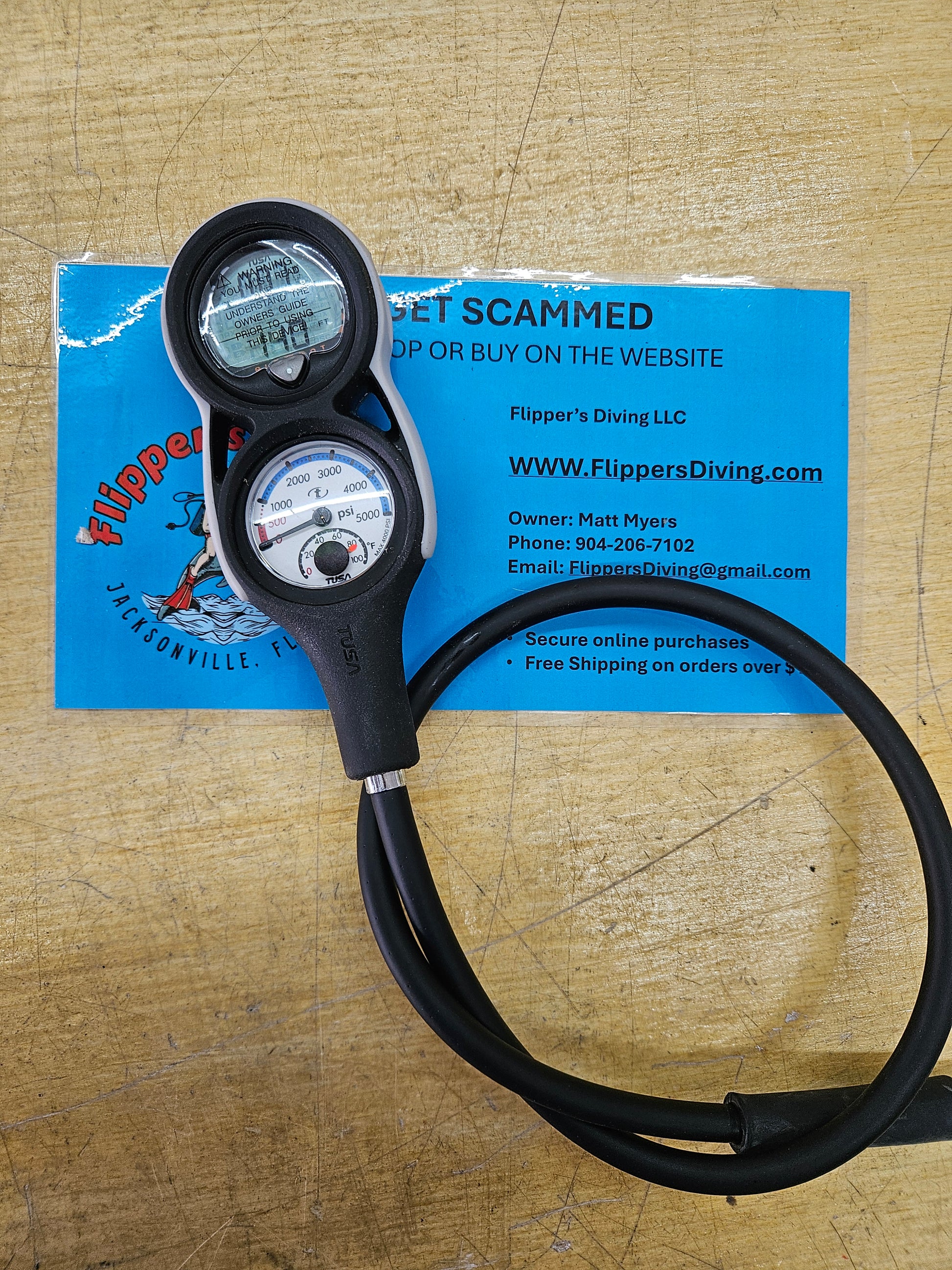 New, old stock! It's never been wet... zero dives on this thing! Still has the screen protector on it! We did a service and battery change regardless so you'll know it's ready to dive. Tusa "Element" dive computer with console. Simple single button operation, nitrox compatible/programmable, comes with 5000psi SPG on a 32" HP hose. Can be added to nearly any regulator set in seconds.
