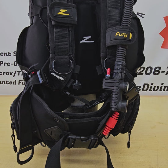 This BCD has been on less than 5 dives...EVER. Practically brand spankin' new... Zeagle "Fury" BCD. Lots of features you've come to love from Zeagle... Ripcord integrated weight system, trim tank droppable pockets on the cam bands around your cylinder, large storage pockets on each side, back inflation air cell for excellent trim/buoyancy, and Zeagle's quick disconnect LP power inflator. This BCD will also size up/down between a Large and 2XL (see pictures of adjustable harness system). They retail new for $700-800.