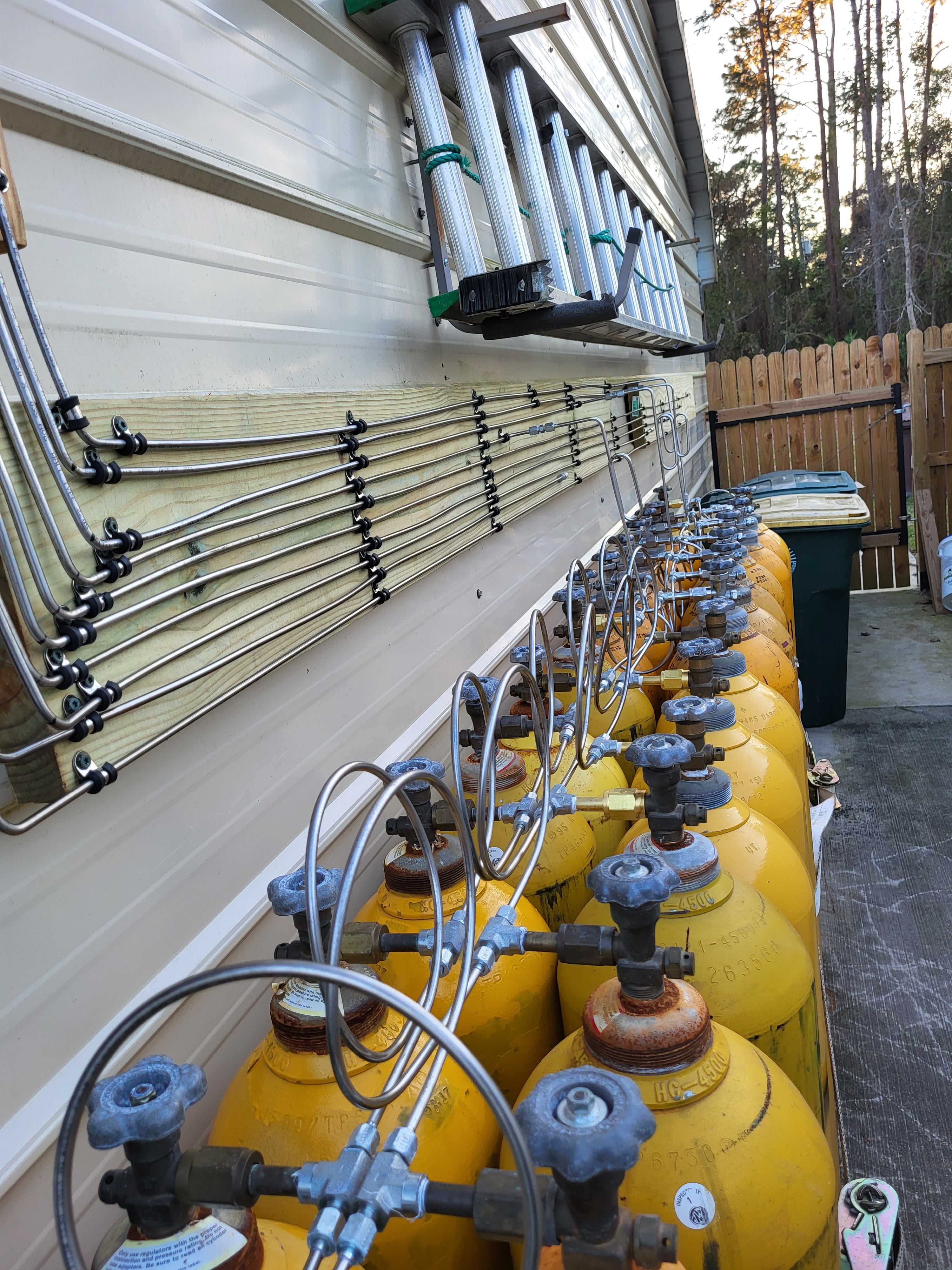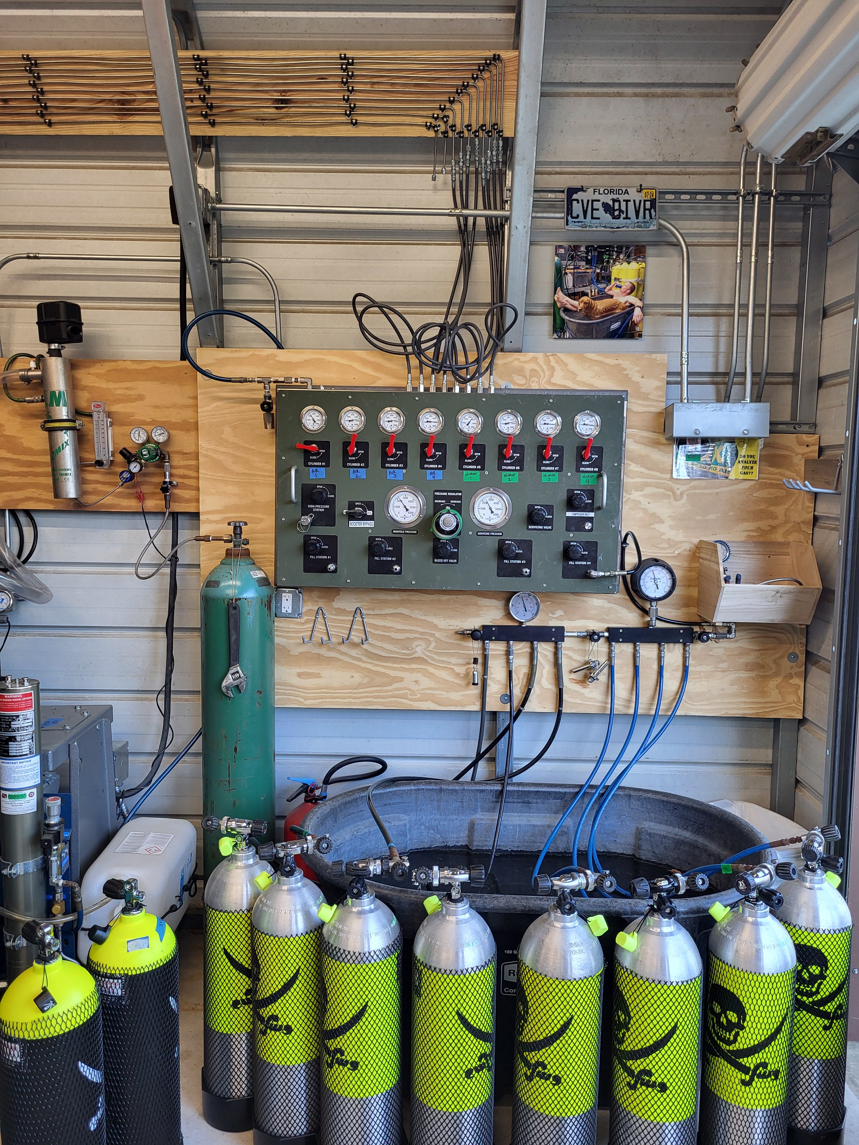 17,000 cubic feet of banked gas ready to go! That's 12,000 cubic ft of banked pre-mixed 32% nitrox and 5,000 cubic ft of air. We keep a large supply of pure diving grade oxygen and helium on hand as well for those custom tech fills!