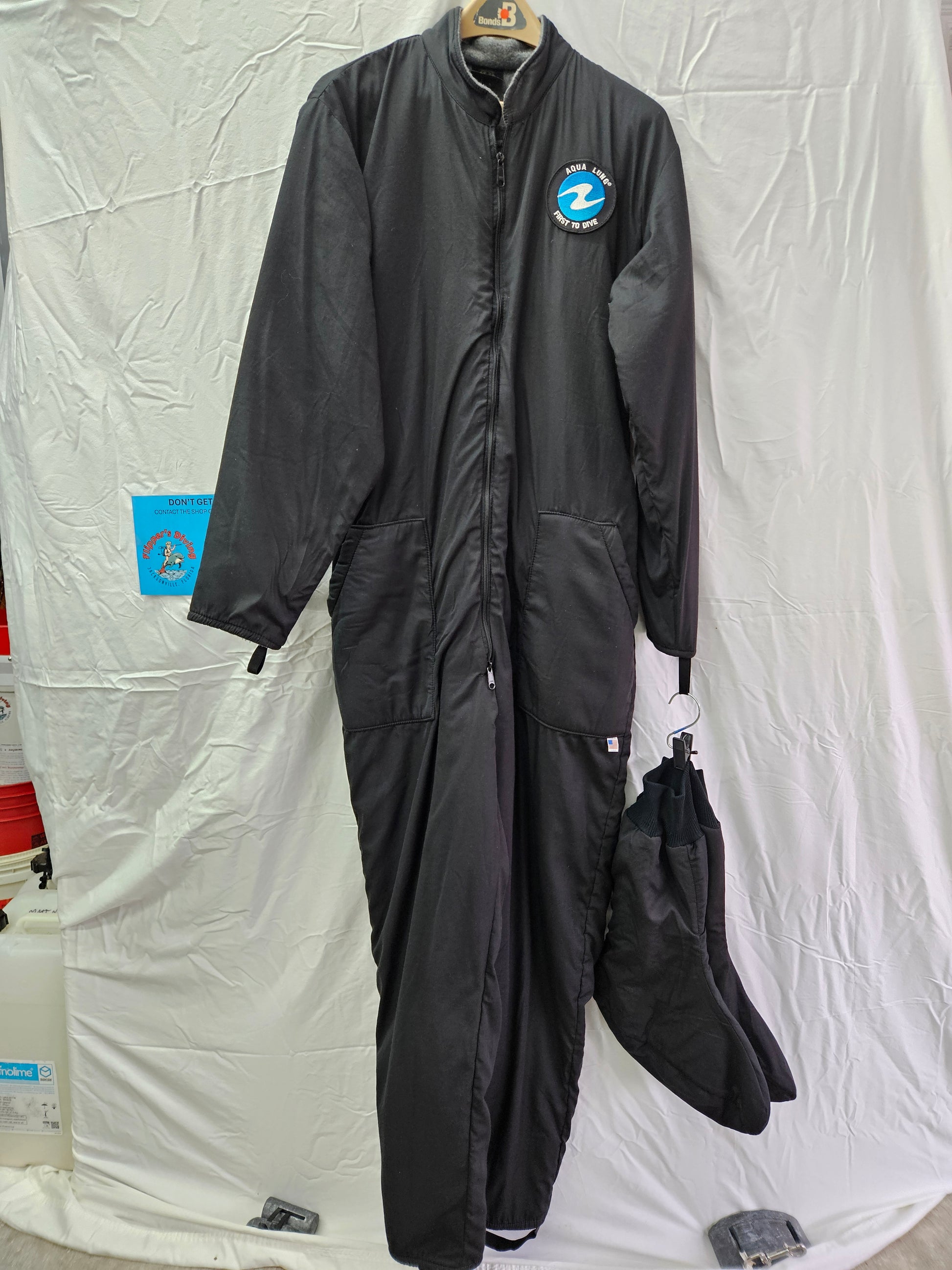 Aqualung fleece lined drysuit undergarment. Nice medium/heavier weight drysuit undergarment and high top socks/booties included. Size Large.