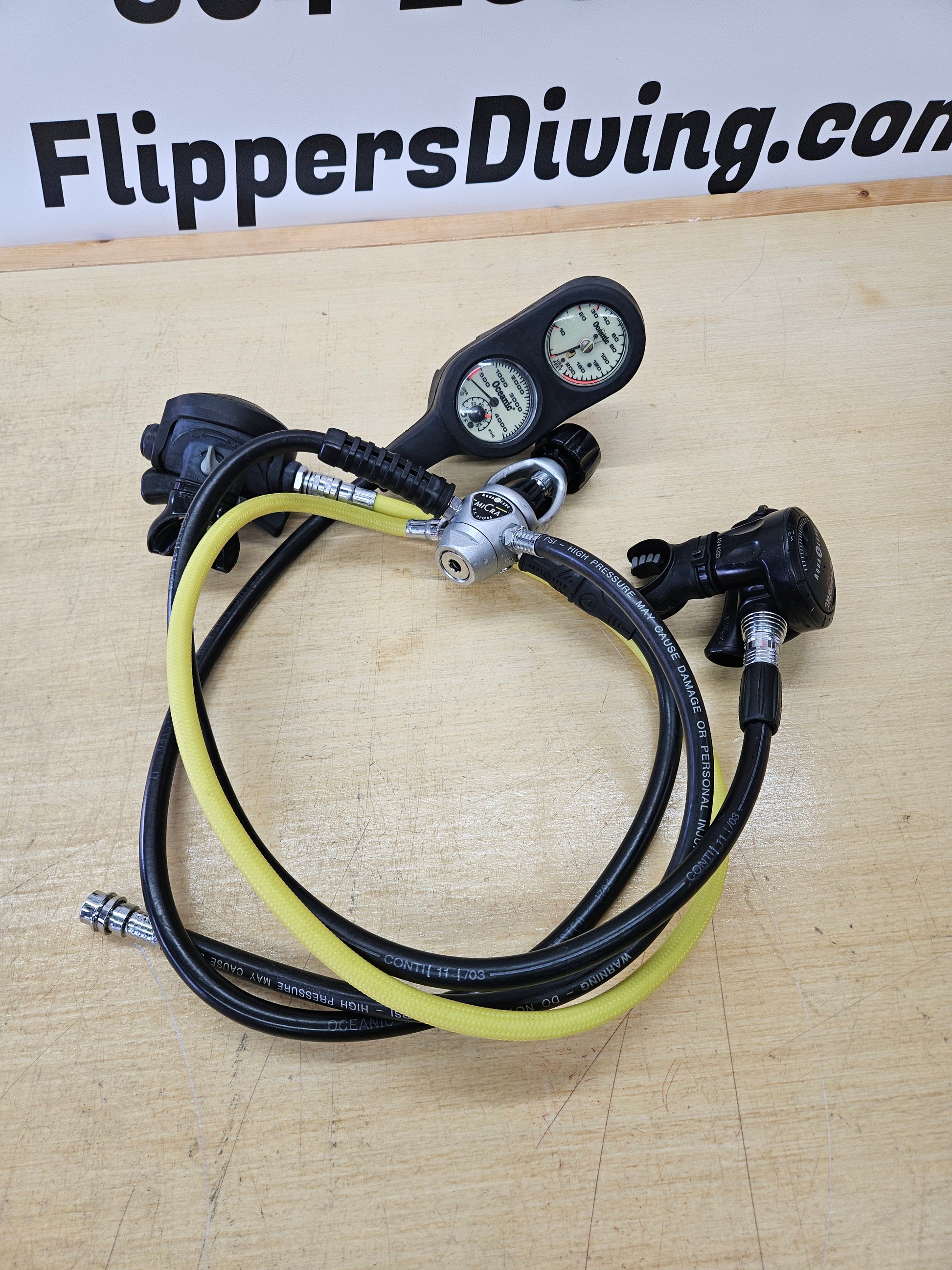 Aqualung Micra first stage regulator, Aqualung Titan LX primary 2nd stage regulator, Aqualung Titan octo 2nd stage regulator, standard LP power inflator hose and a 3 gauge console with pressure gauge, depth and compass. Regulators have been inspected, tested and tuned and are ready to dive. Awesome entry level regulator set... super tough and performs well.
