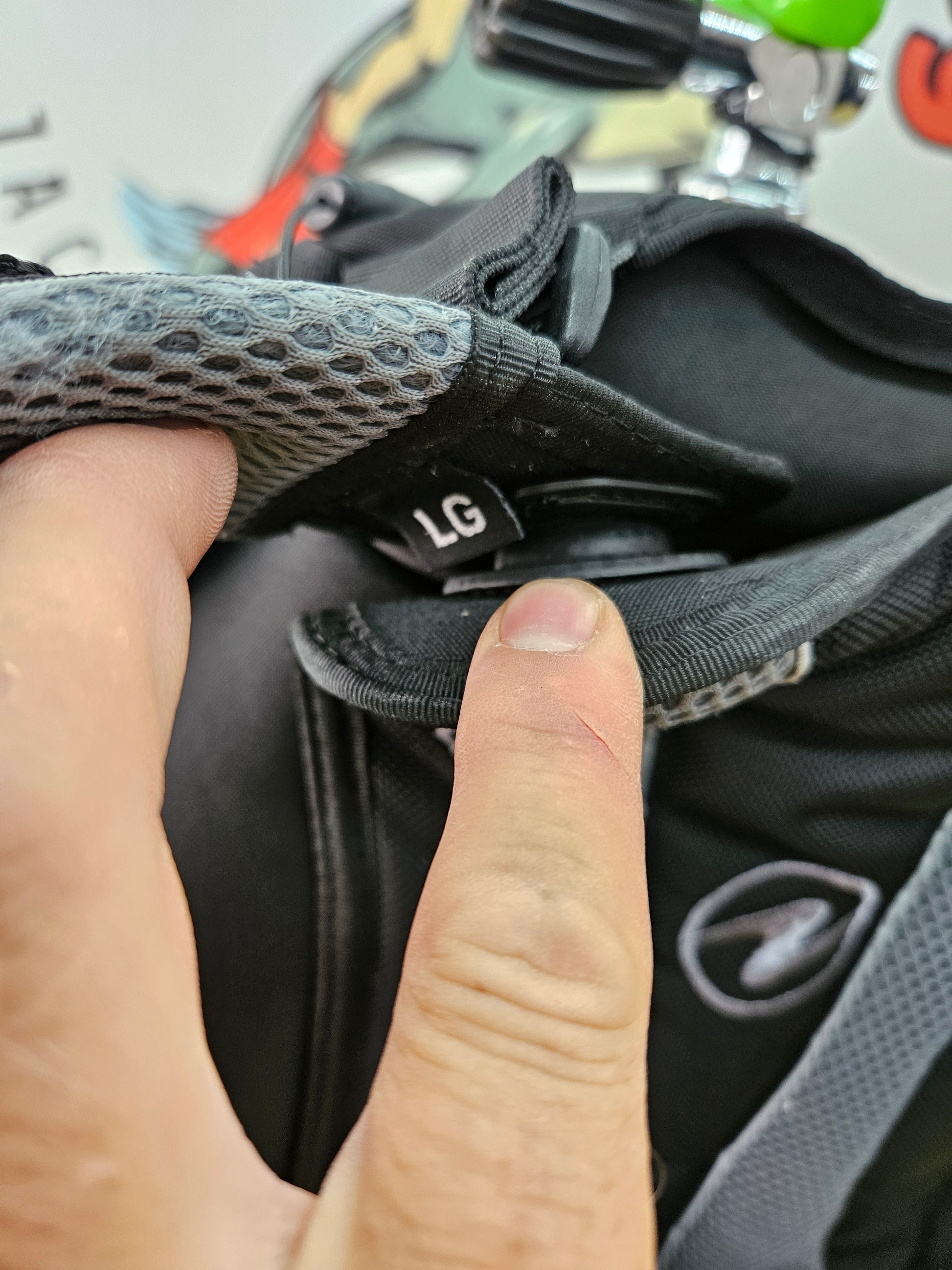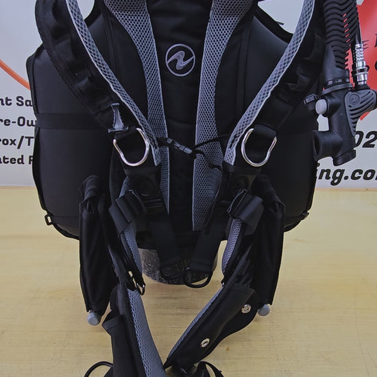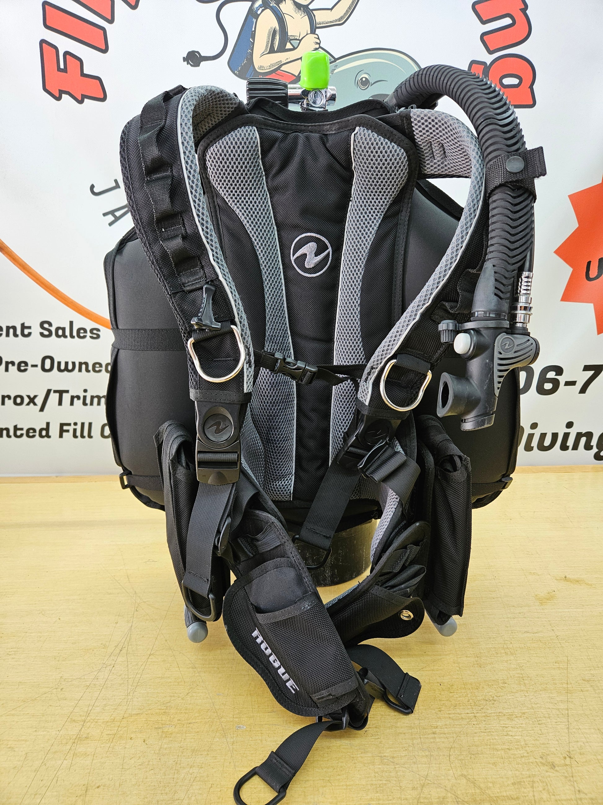 Aqualung "Rogue" BCD, excellent condition, leak tested and inspected... it's ready to dive (and travel)! This is an ultra light BCD, perfect for airline travel, yet doesn't compromise any features like weight integration, large back inflate bladder, multiple attachment points, OPV/pull dumps and storage. The harness is modular so you can actually swap out shoulder straps, the soft backplate or waist sections for different sizes. Currently this is a "Large" with a medium waist section. It's seen very little use and is in fantastic condition.