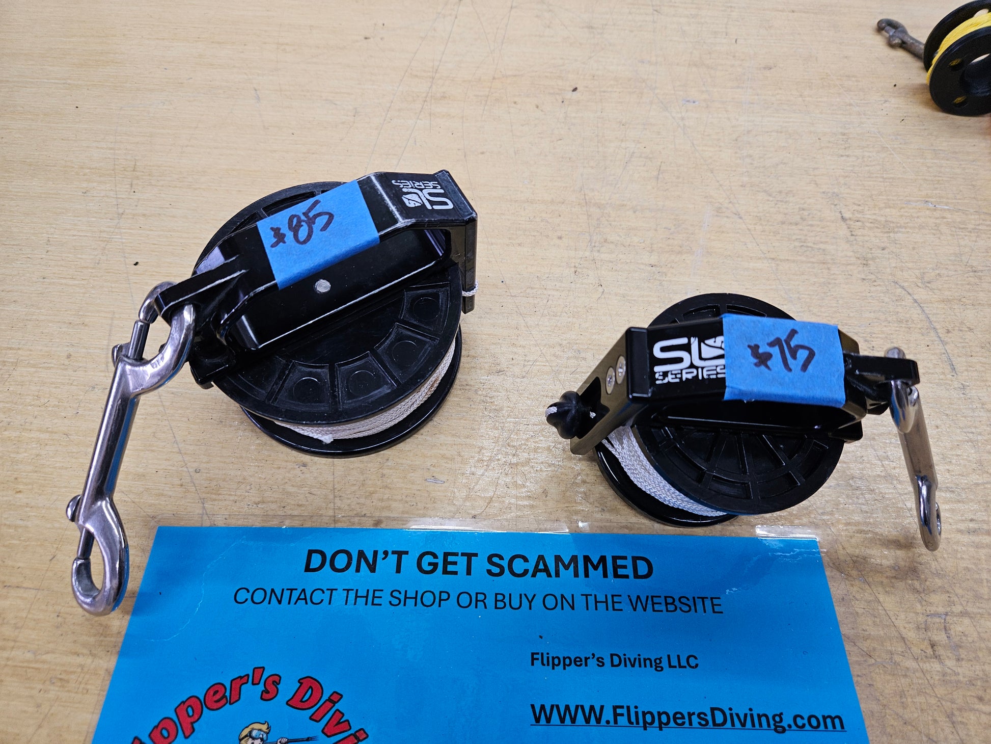 2 Reels available... Dive Rite SL Series cave/wreck reels. Unsure on official length/size of the line but would guess the smaller one to be 150ft and the larger to be 250ft. Both come with stainless steel double end bolt snap.