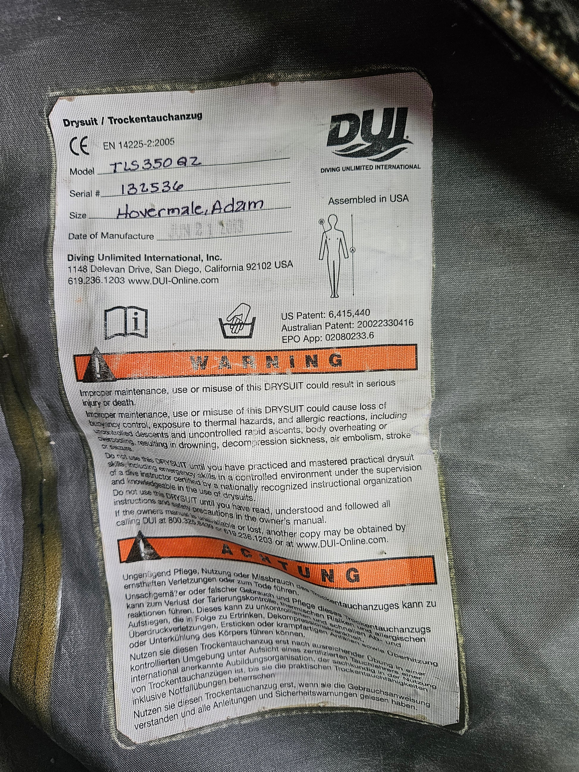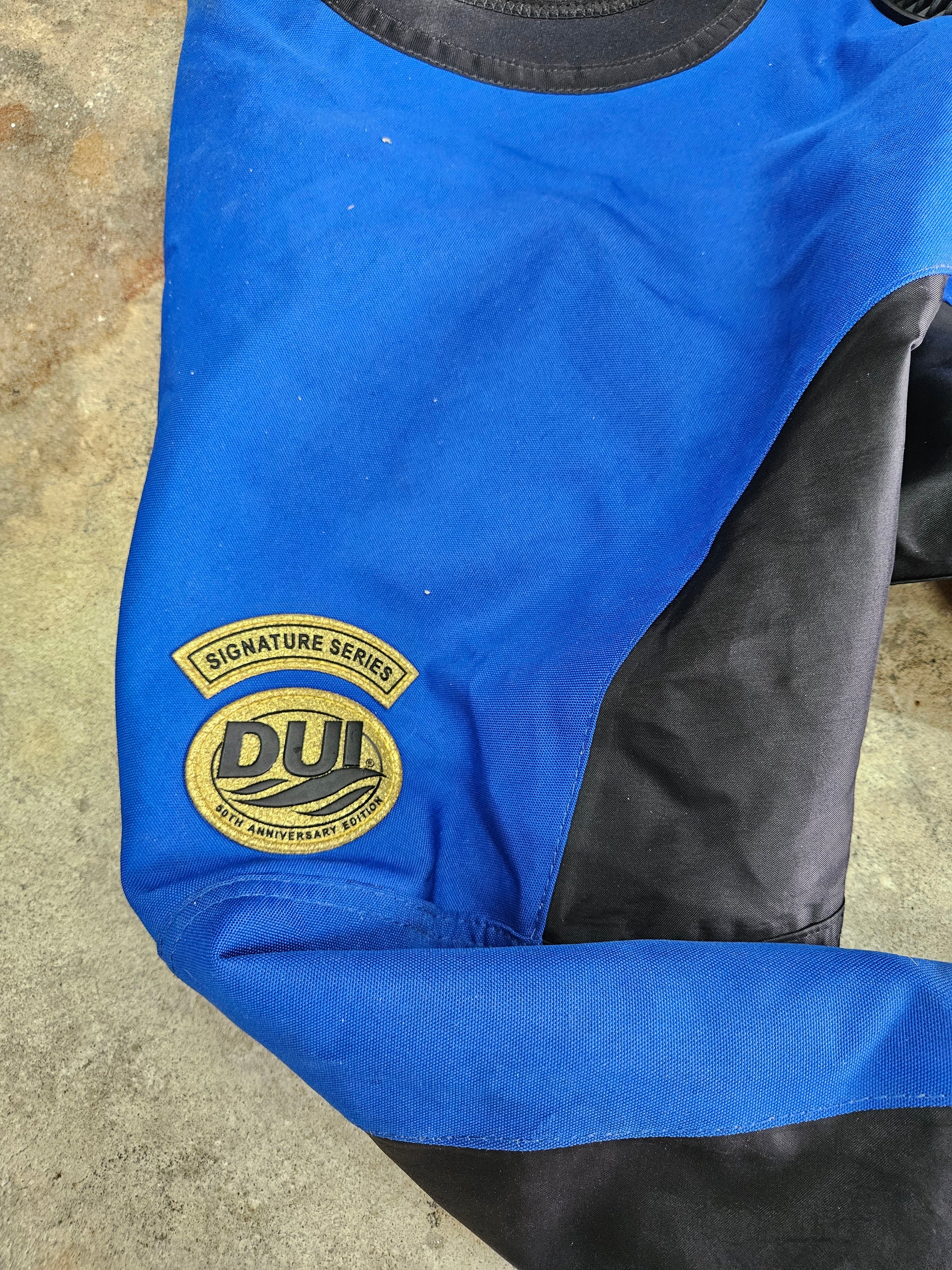DUI TLS350 Signature Series 50th anniversary edition drysuit. Suit just had new zip wrist seals installed (user replaceable as needed) in January. A brand new DUI zip seal neck seal is included (unopened) as the neck seal is about toast and should be swapped out. The suit was just test dove and dove dry (no leaks) however suit is sold as is, no guarantees. Suit was built in June 2013. Zipper is in good condition and should have several years left on it before replacement will be needed. Suit comes with bag (it's in bad condition but works) and a pair of bonus zip seal dry gloves and liners (medium size)... you can see from the photos there have been a few repairs to the gloves.