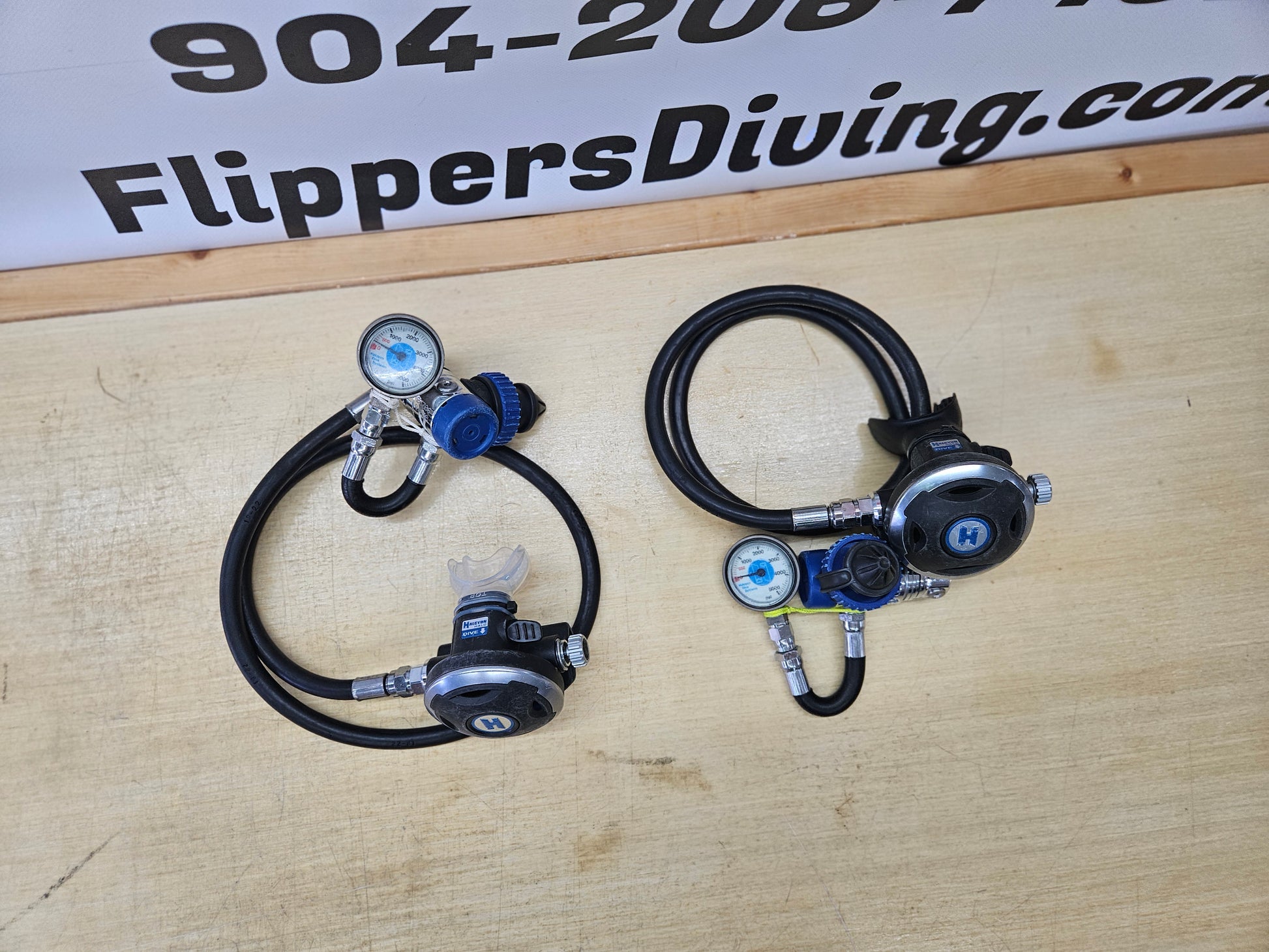 Halcyon H-75P/Halo stage bottle regulators. Each regulator comes with the DIN H75p first stage, 40" LP rubber hose, Halo 2nd stage regulator, 1.5" Halcyon SPG and a 6" HP hose. Regulators are 3 years old and have been well maintained. Both units have been inspected, tested and tuned and are ready to go dive!