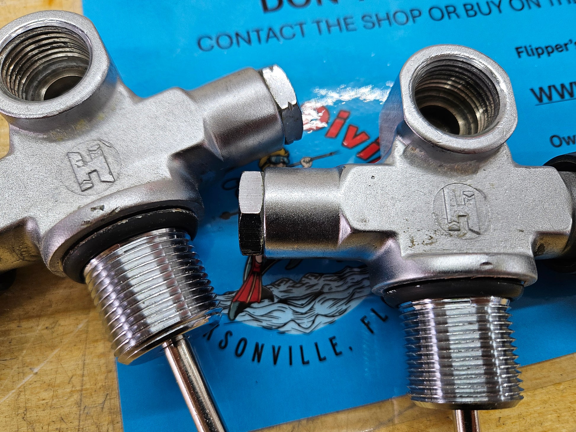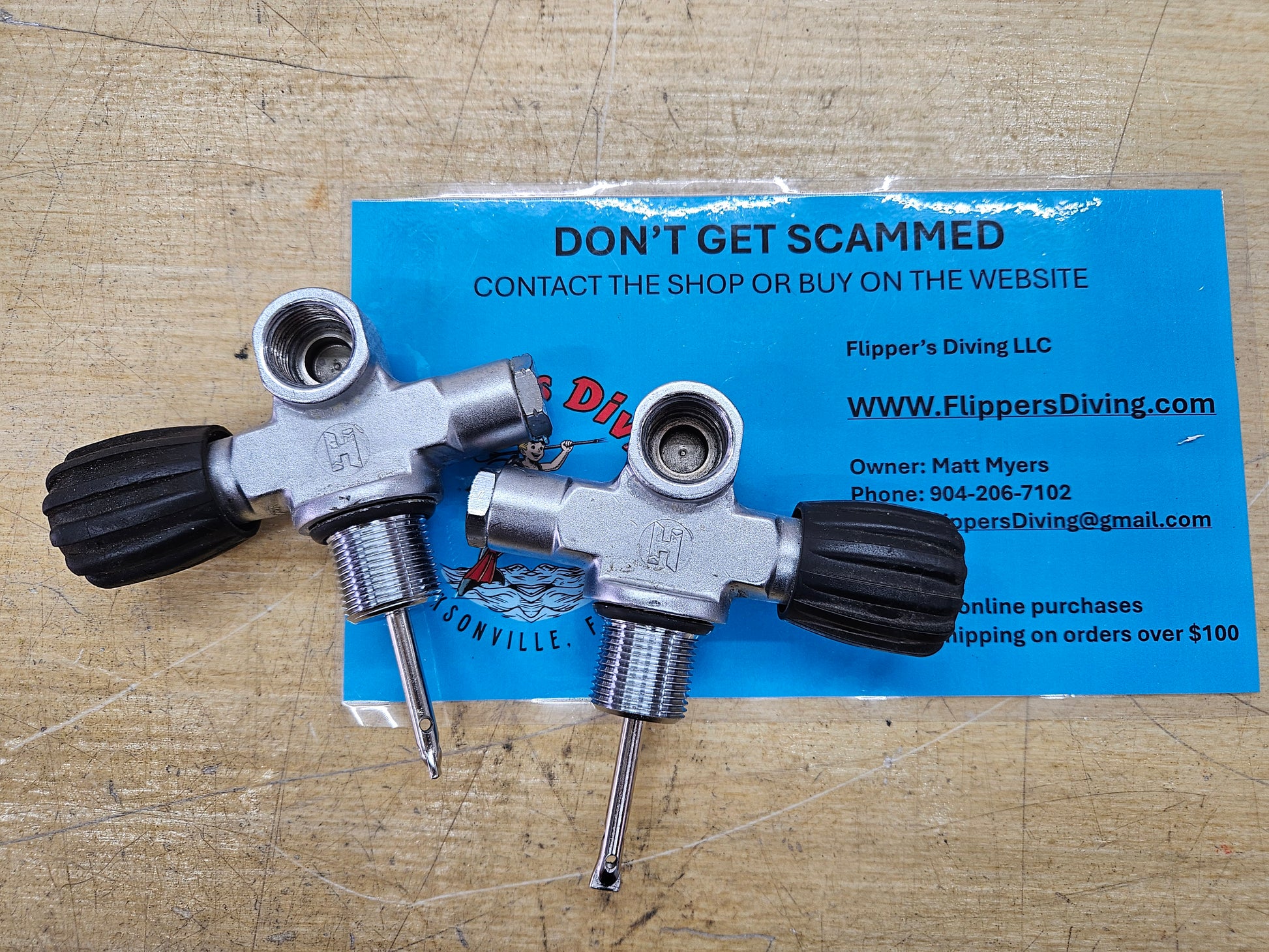 Hard to find a pair of these babies! Halcyon modular mirrored valves. 200 bar DIN (will accept an insert for yoke) and are also compatible with any standard isolator to use this as an isolation manifold (Thermo, Sea Elite, Dive Rite, etc isolators will work). Valves were removed from a pair of sidemount cylinders and are in good working condition. Sold/priced as a pair only.