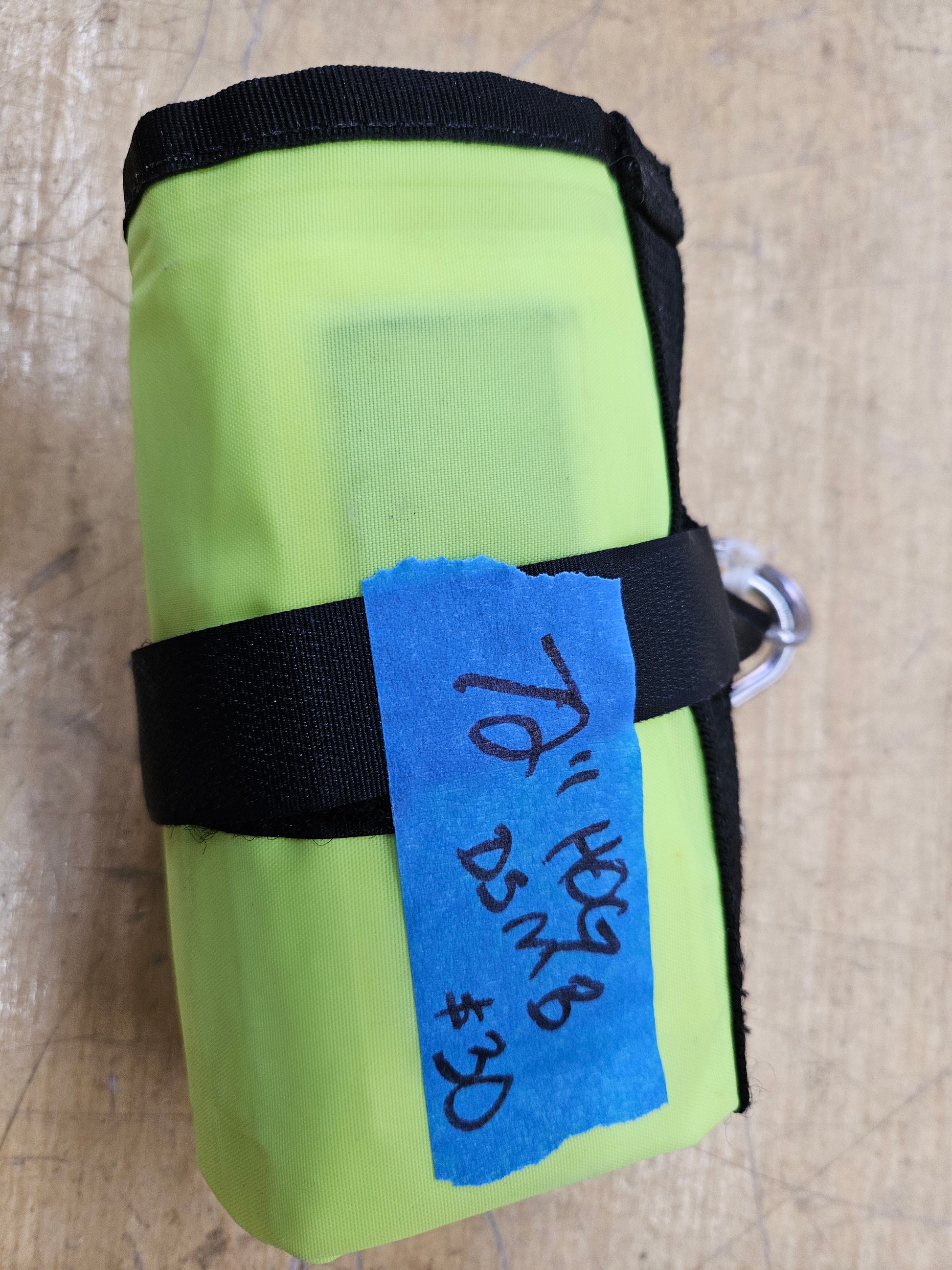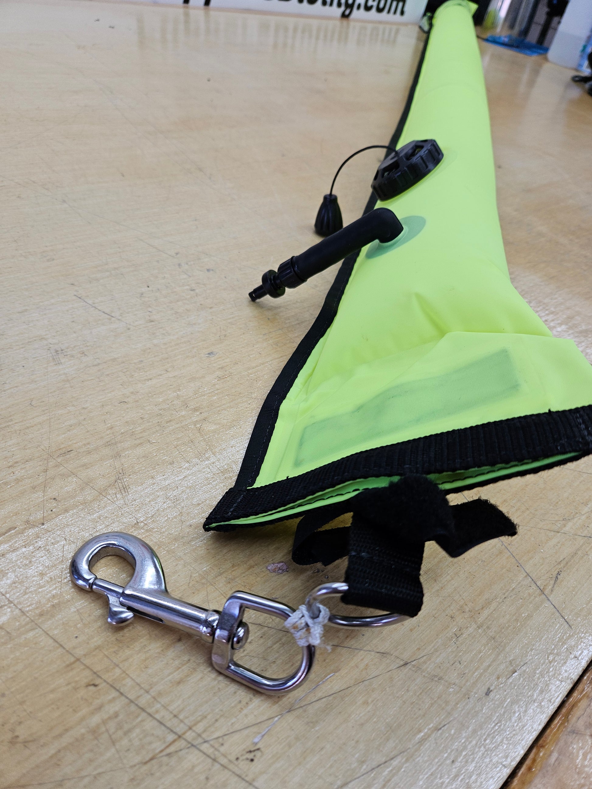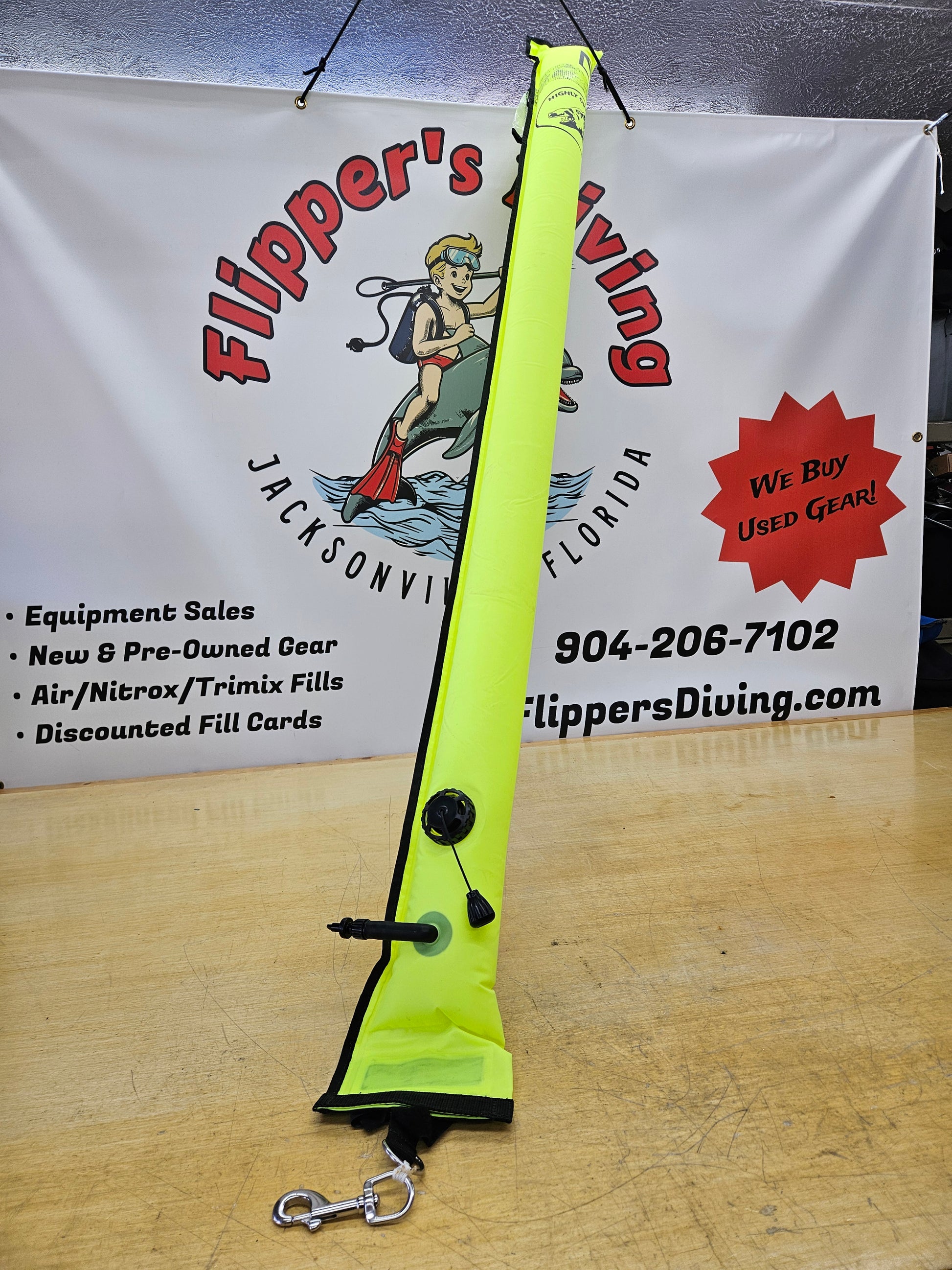 HOG 72" SMB with OPV. Overall good condition. Air tight, no leaks. Reflective tape at the top has worn down quite a bit. OPV and fill valve work as intended. Comes with stainless steel bolt snap as shown. A must for ANY ocean dive.