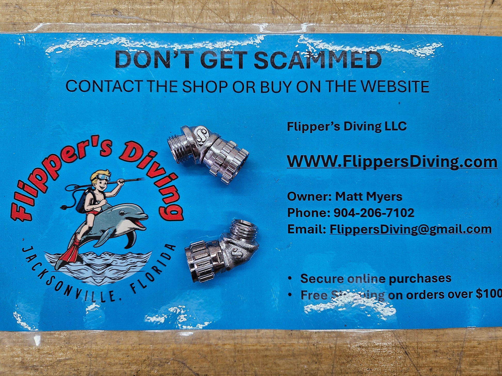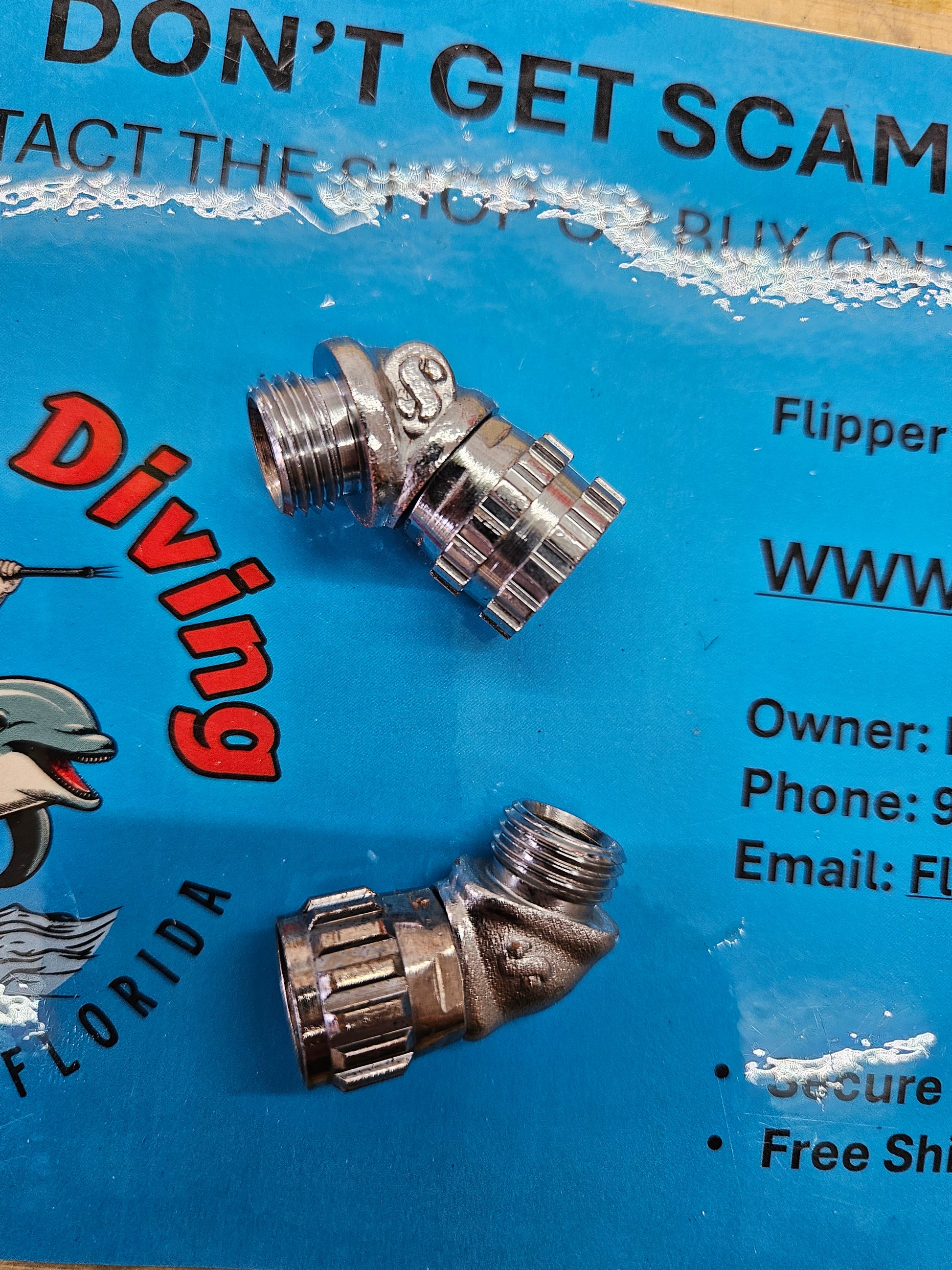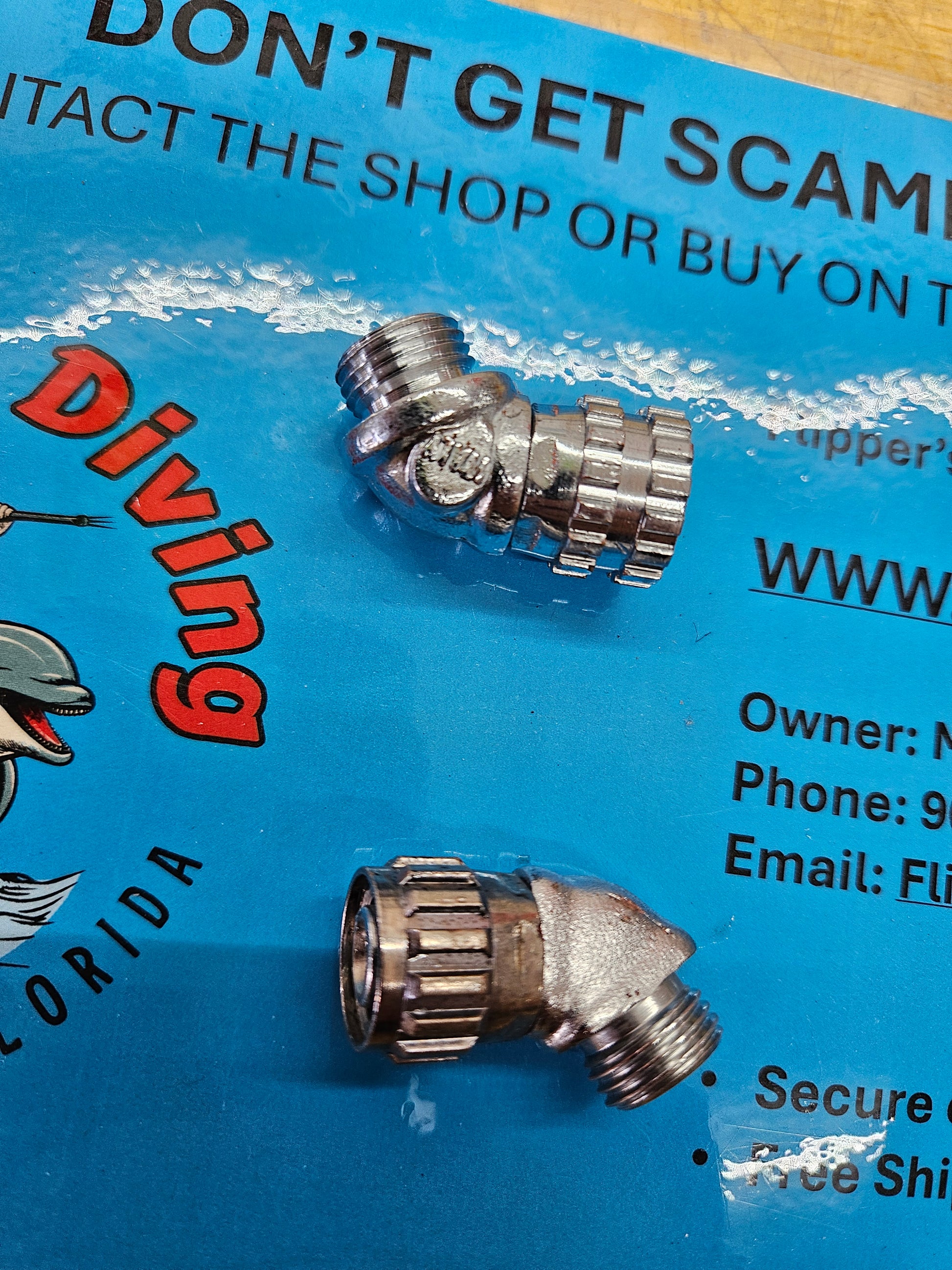 Scubapro 110 degree LP swivels. Perfect for taking that tension off your 2nd stage regulator from most LP hoses. Cleans up hose routing and can also be used for other applications. Priced/sold individually.