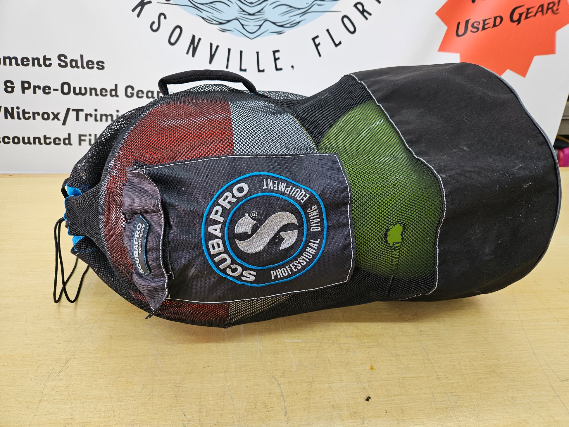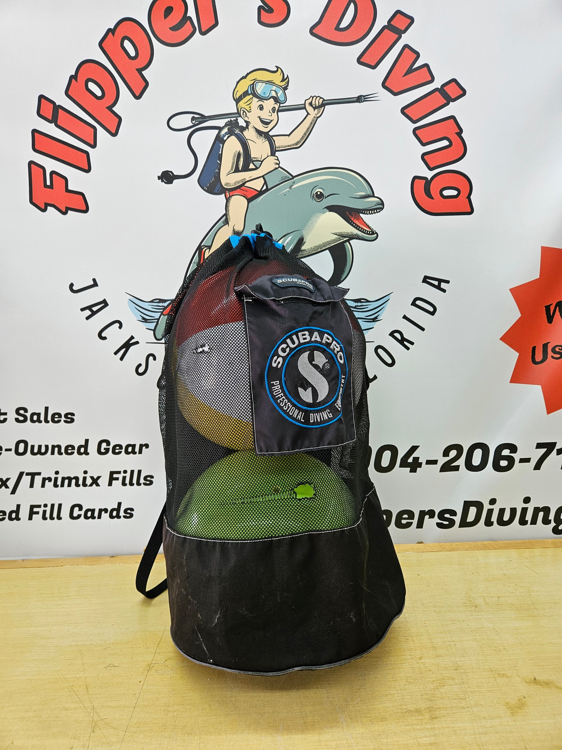 Scubapro mesh gear bag backpack. This bag has a couple small tears in the mesh.... still functional but please view photos to understand the damage on this bag. Otherwise functional.