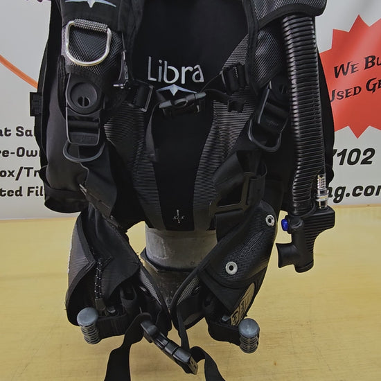 Sea Quest "Libra" women's bcd. Excellent condition... literally looks like it hasn't seen the water. Help this BCD get wet! Back inflation style air cell, adjustable harness with pivoting should/chest buckles (much more comfortable and less restrictive), diver's tool mount (see photo), integrated weight pockets and standard power inflator. Size ladies small.