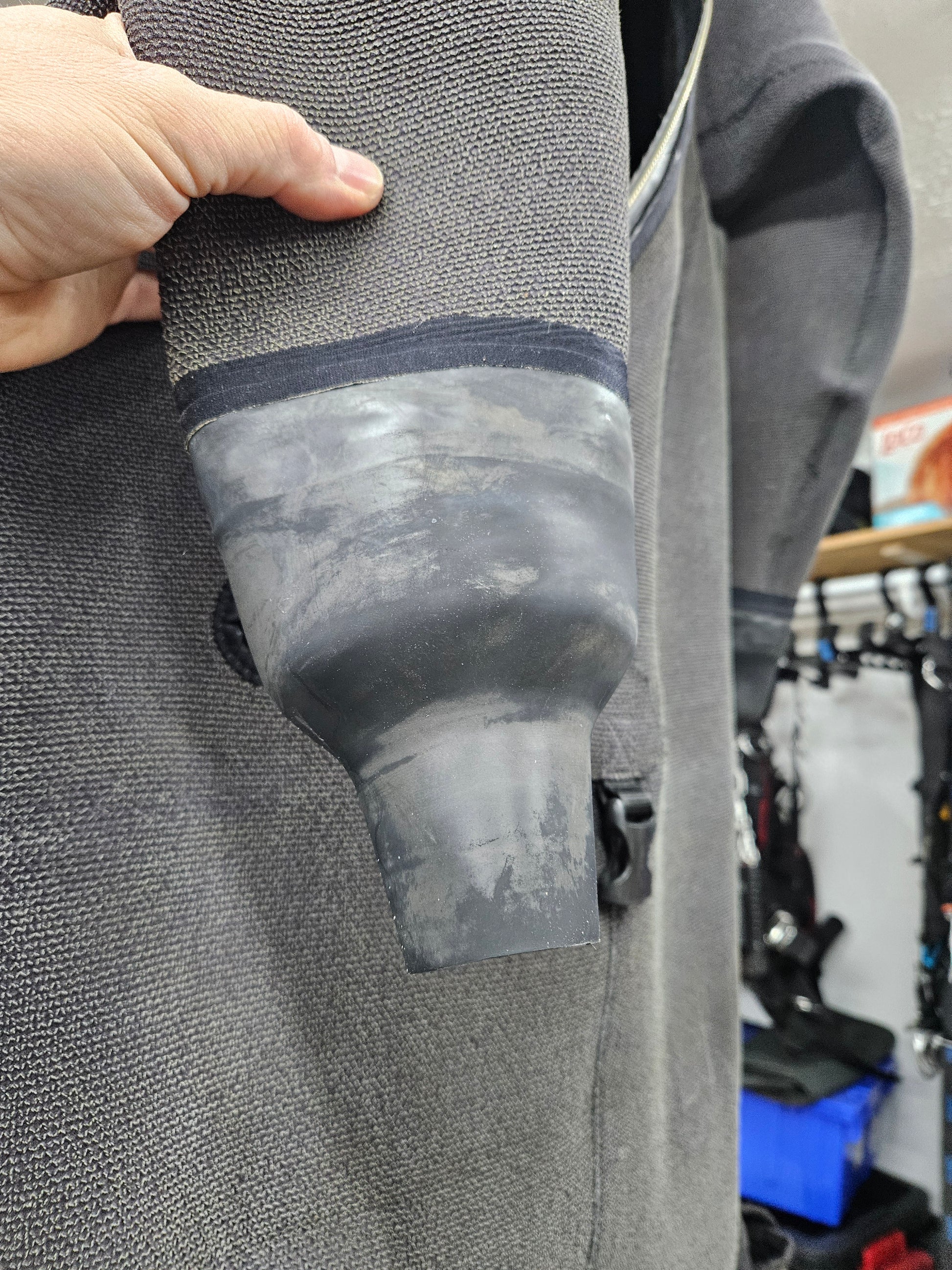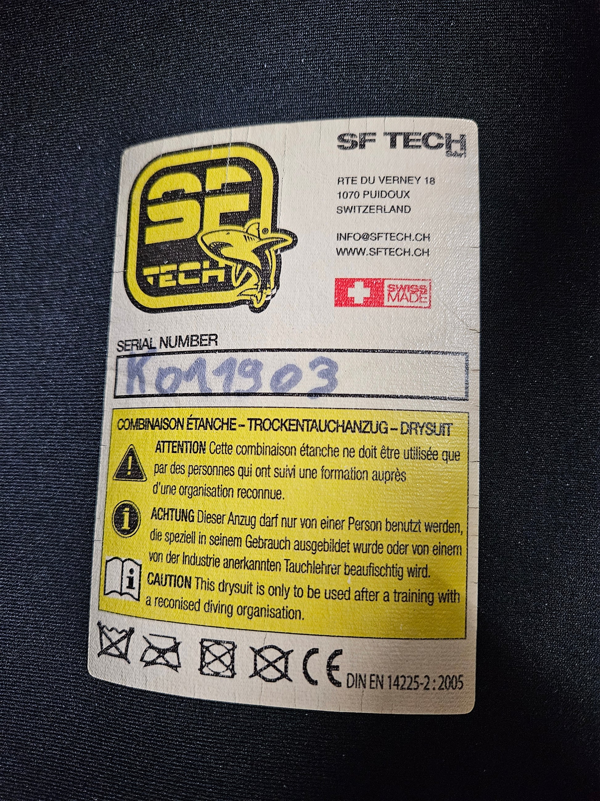 This is an SF Tech Kevlar Pro (full Kevlar) custom made drysuit from Switzerland. Don't take my word for it, but if you talk to enough people in the technical diving world (and drysuit repair world) you'll soon learn these are literally the best constructed/built suits on the planet. This is a crushed neoprene suit with full Kevlar exterior from head to toe. The suit is telescoping in the torso, has large storage pockets on each thigh (these were replaced a few years ago from the originals), front entry zipper and latex seals. The suit has drysuit socks on the feet, so you will want to wear with a pair of rock boots (not included). Apeks valves and p-valve included. This is a custom suit built for me, however I am a fairly normally sized guy... 5'11" tall, 220lbs, 36" waist, 32" inseam. I generally wear XL shirts. If this were a "stock size" suit it likely would be a Large-Extra Large, however SF tech does not make stock sizes... they do all suits made to order by custom measurements. Zipper was replaced 2 years ago and the seals were done this past winter of 2024/25. Suit is 7 years old. Comes with SF Tech drysuit bag.