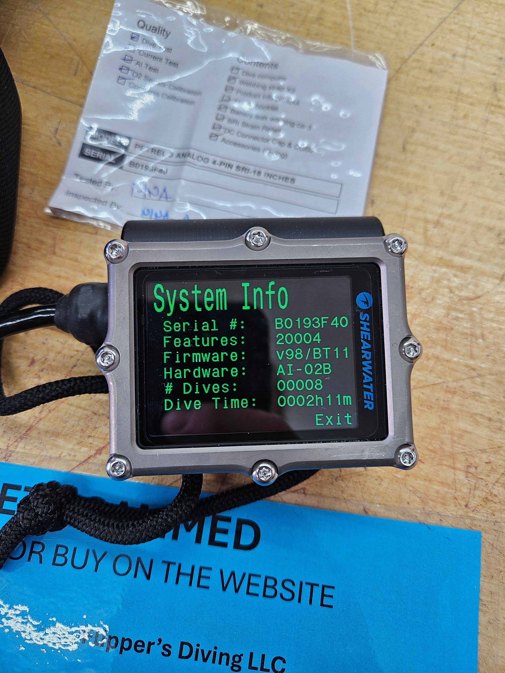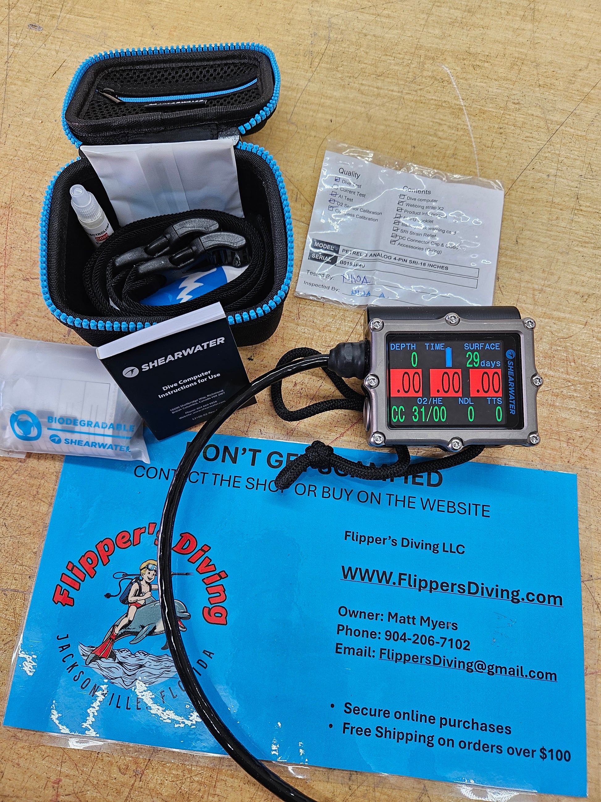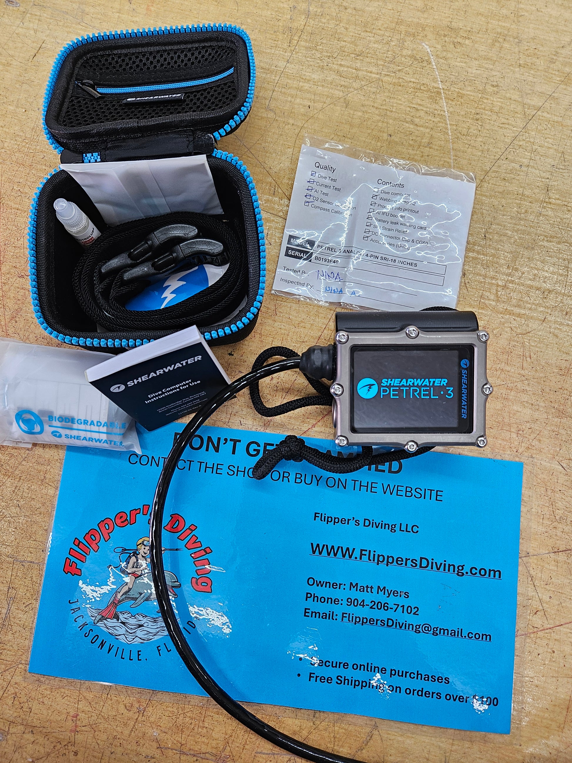 Shearwater Petrel 3 - AK 4 pin dive computer with 18" cable. This computer was on my personal CCR unit and was brand new 3-4 months ago. It is used however I had a customer want/need a computer quickly so I sold them my computer and ordered a replacement. Two weeks later the customer asked to return it as they decided not to proceed with a CCR purchase. So this is a used unit with only 8 dives and just over 2 hours of dive time. Comes with everything you see pictured including the original unused straps and the strain relief device (keeps the 4 pin connected so it doesn't accidentally come apart). These retail for $1575.