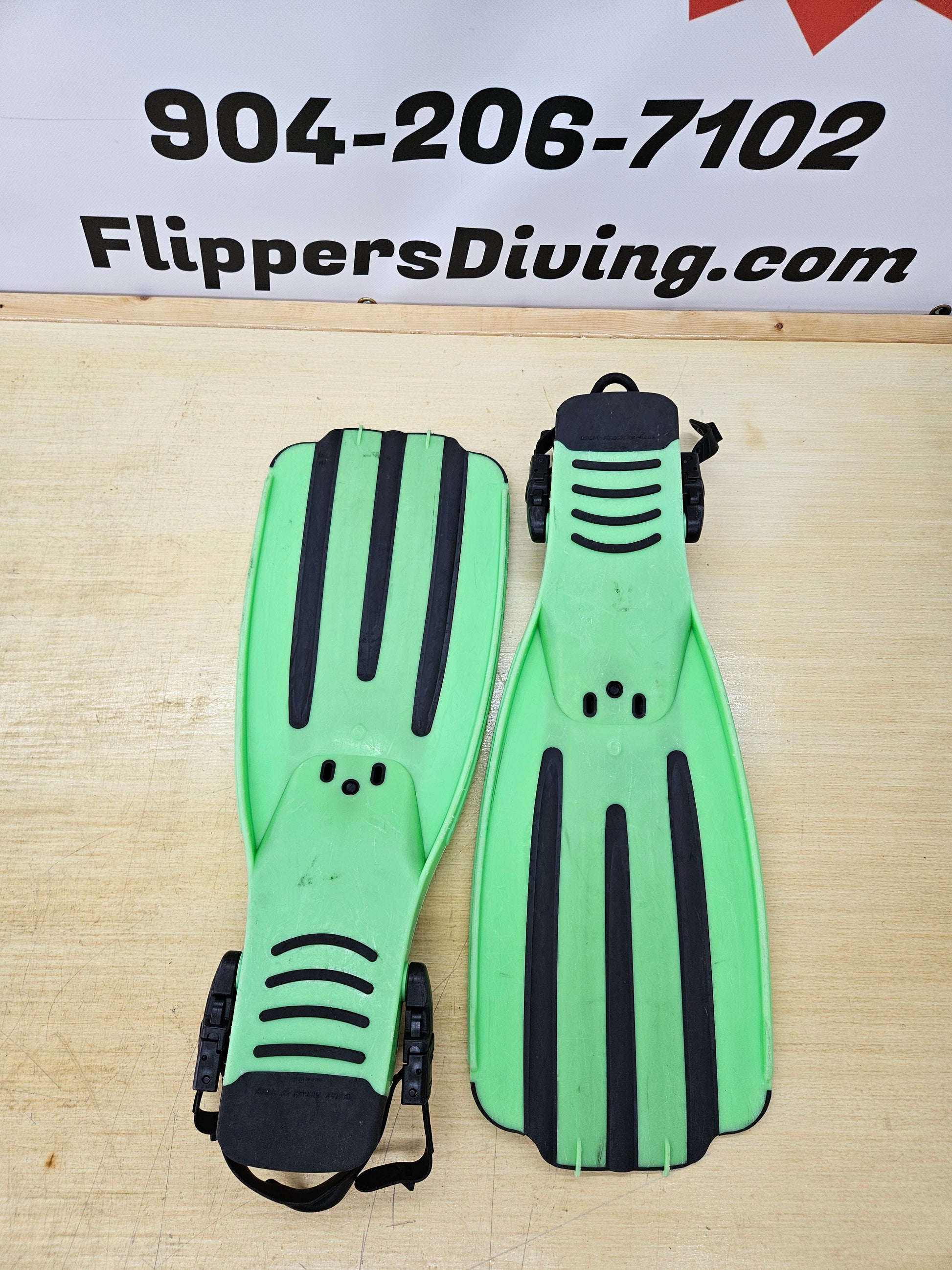 Tusa Imprex open heel dive fins. Nice rigid fin, plenty of propulsion and open heel design with adjustable heel straps and quick release buckles. Size medium (men's 7-9).