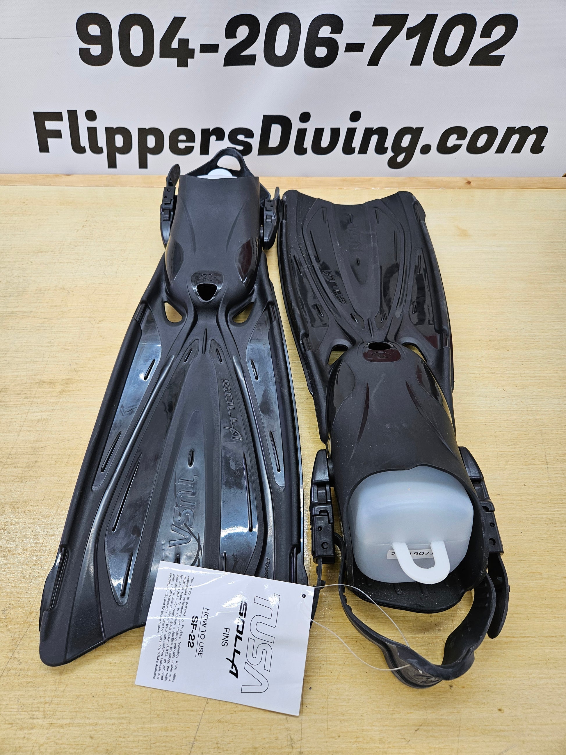 BRAND NEW! Tusa Solla open heel dive fins. Adjustable straps with quick release buckles. Extremely solid fin with great propulsion. These have never been wet and still have the tags on them... brand new! Size Medium (Men's 7-10).