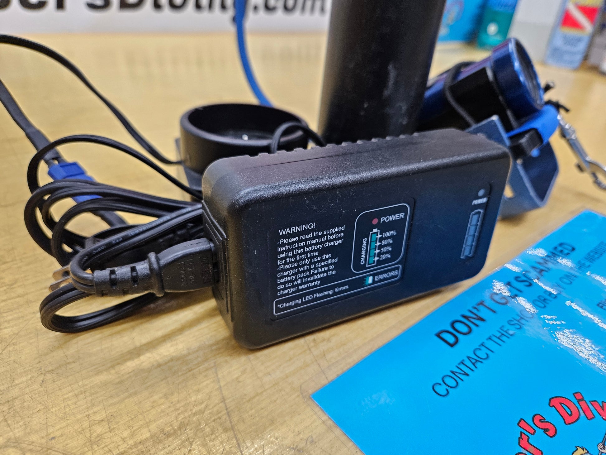 This is an Underwater Light Dude LD35 canister light. THIS IS A PROJECT LIGHT... it should burn at 5 hours and currently burns at 3.5 hours. Basically you'll want to build a new battery pack for this light and the UWLD does not make packs for this light anymore. Light head works great, super bright, peizo switch works like a charm. Also the little rubber boot around the cord where it enters into the sidemount gland at the top of the canister is torn. Cord is still intact, no issue, but it would be wise to put a new protective sleeve around this cable. The canister is 160WH battery with external charging. Charging cradle included. Sold "AS IS", no returns.