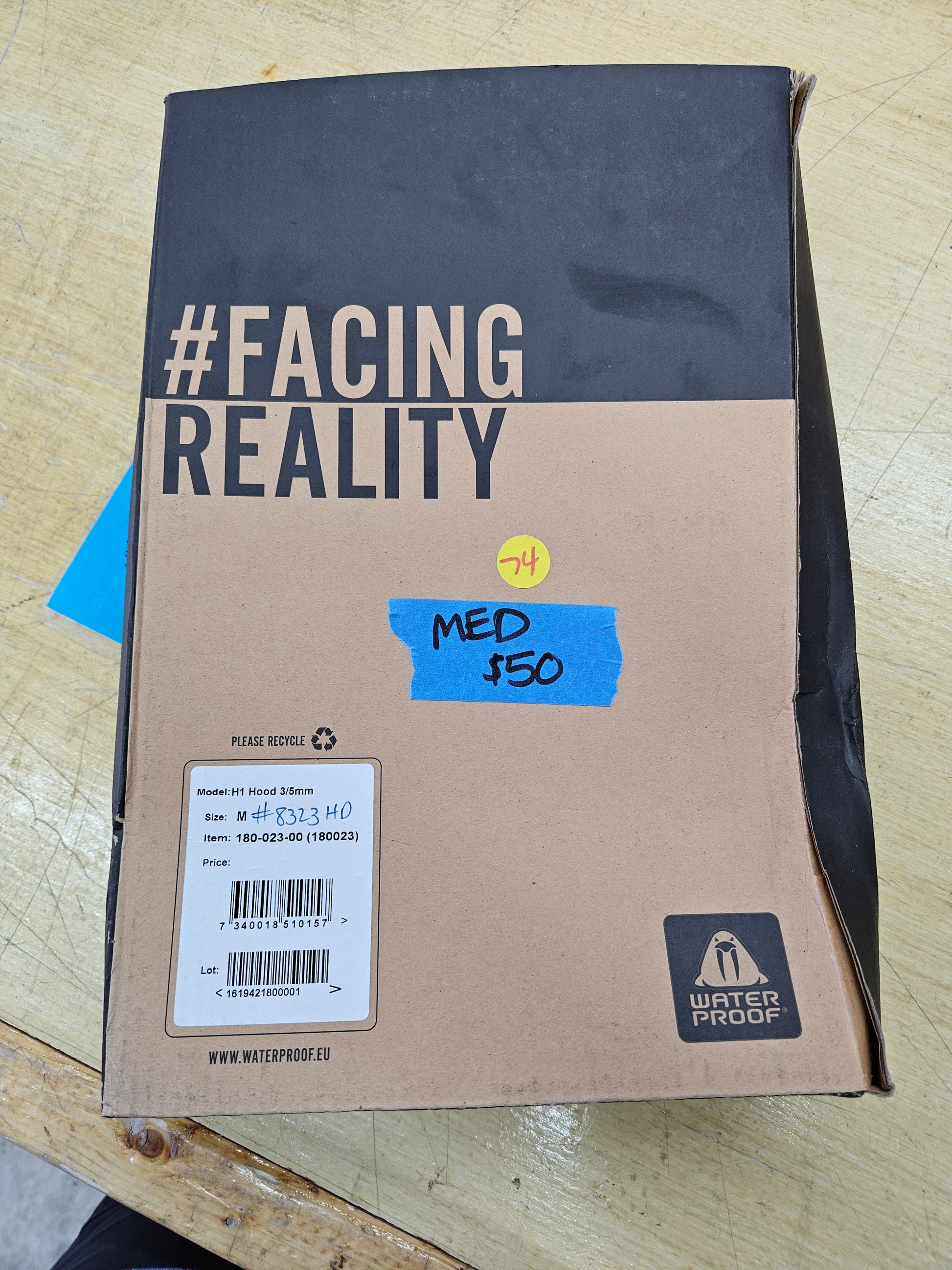 Want a high quality hood? Here ya go... "Water Proof" H1 5/3mm bibbed hood, brand new in the box, never wet. 5mm thickness around the head and neck, 3mm for the bib and around the face. Extremely warm. Size small and medium available.
